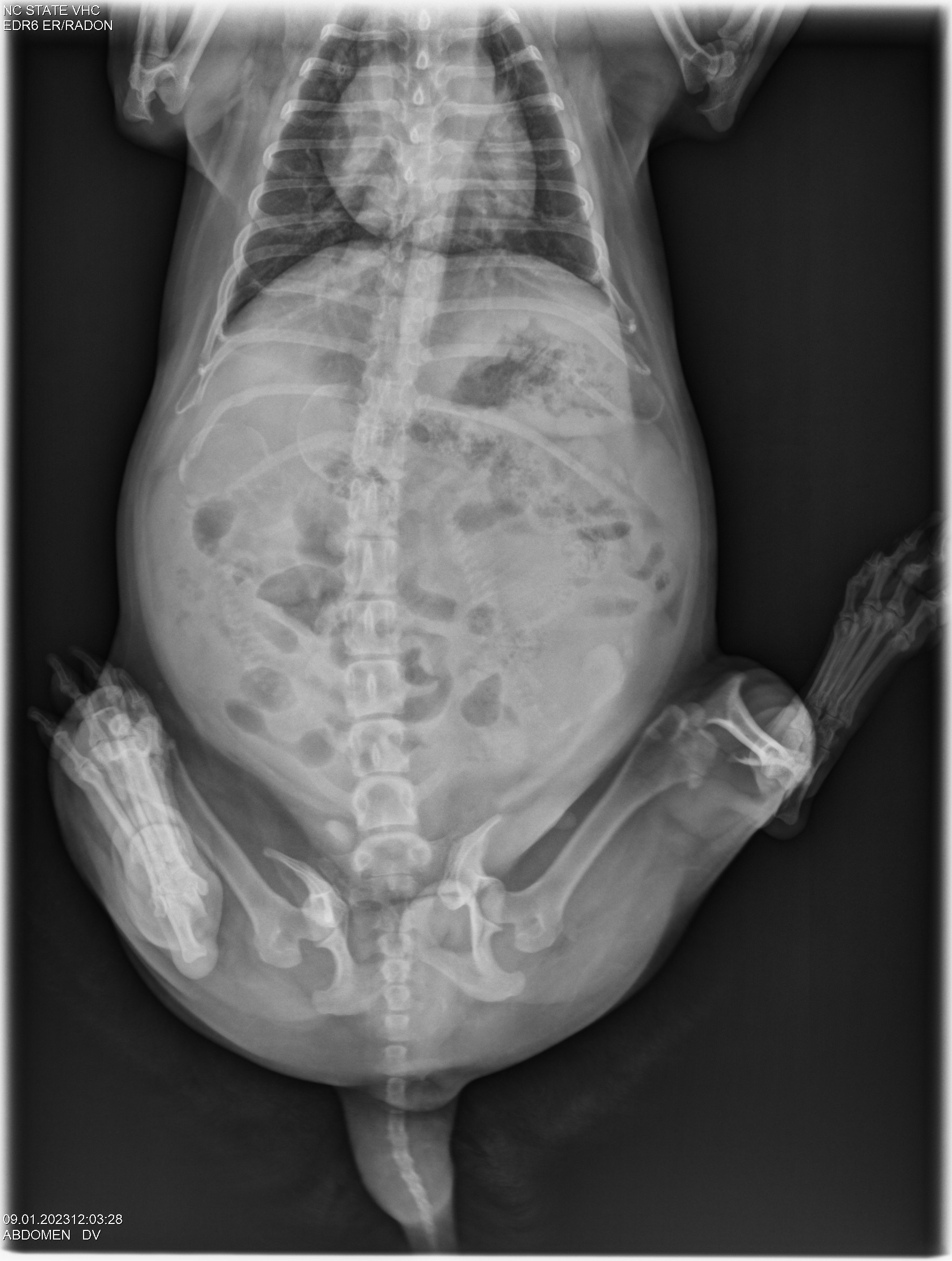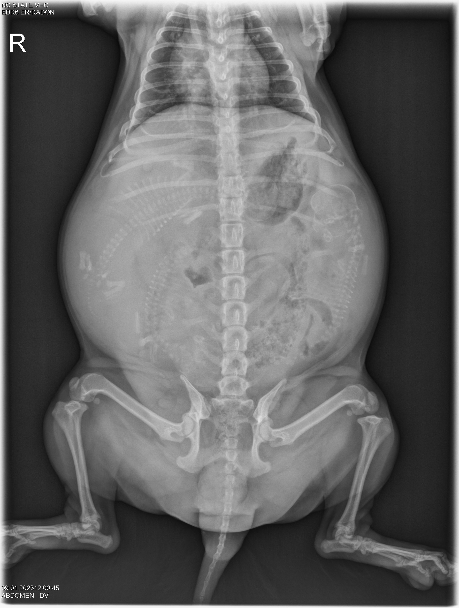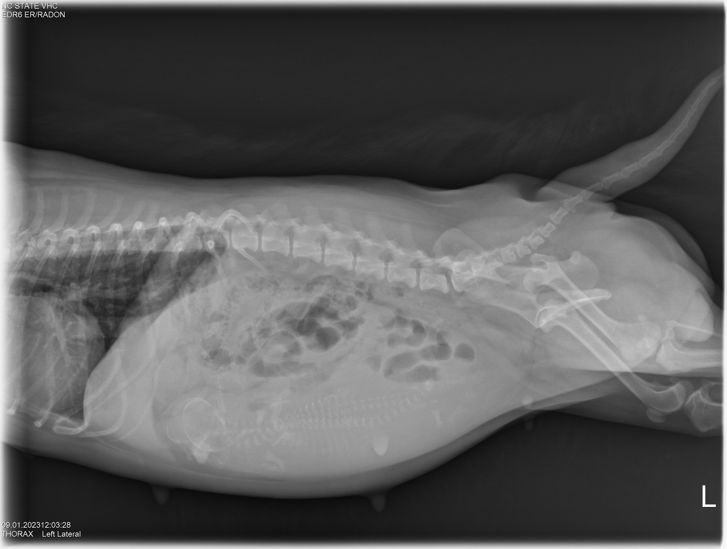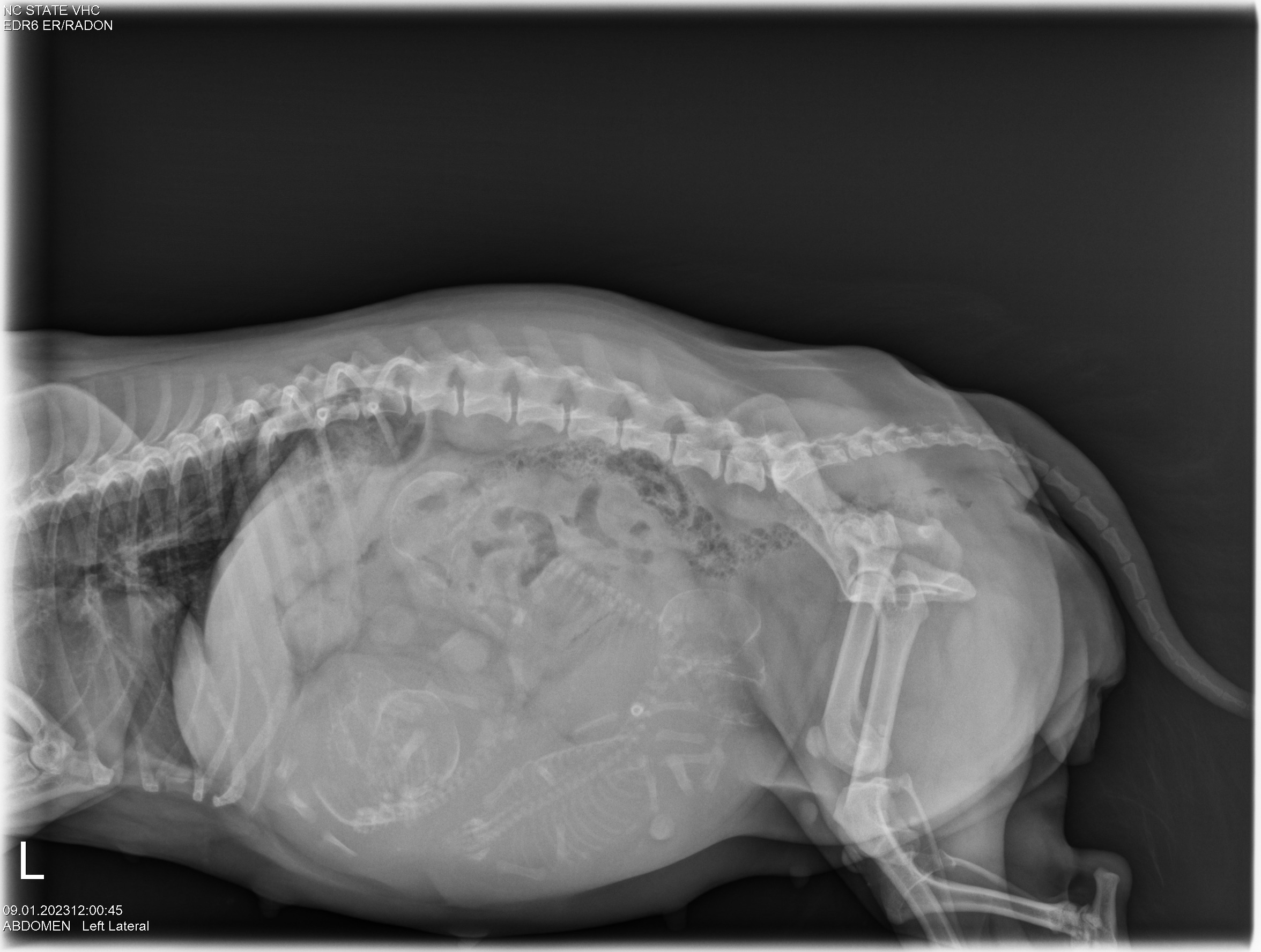 Looking at the x-rays, my repro vets told me that Gwynie is carrying three puppies, and Siri is carrying two. Comparing the size of the pelvic opening of each girl with the size of the puppy skulls they are carrying, I was told for both Gwynie and Siri that the sizes are close. I was advised to have a cesarean section (c-section) for both girls. So that is what we will do.