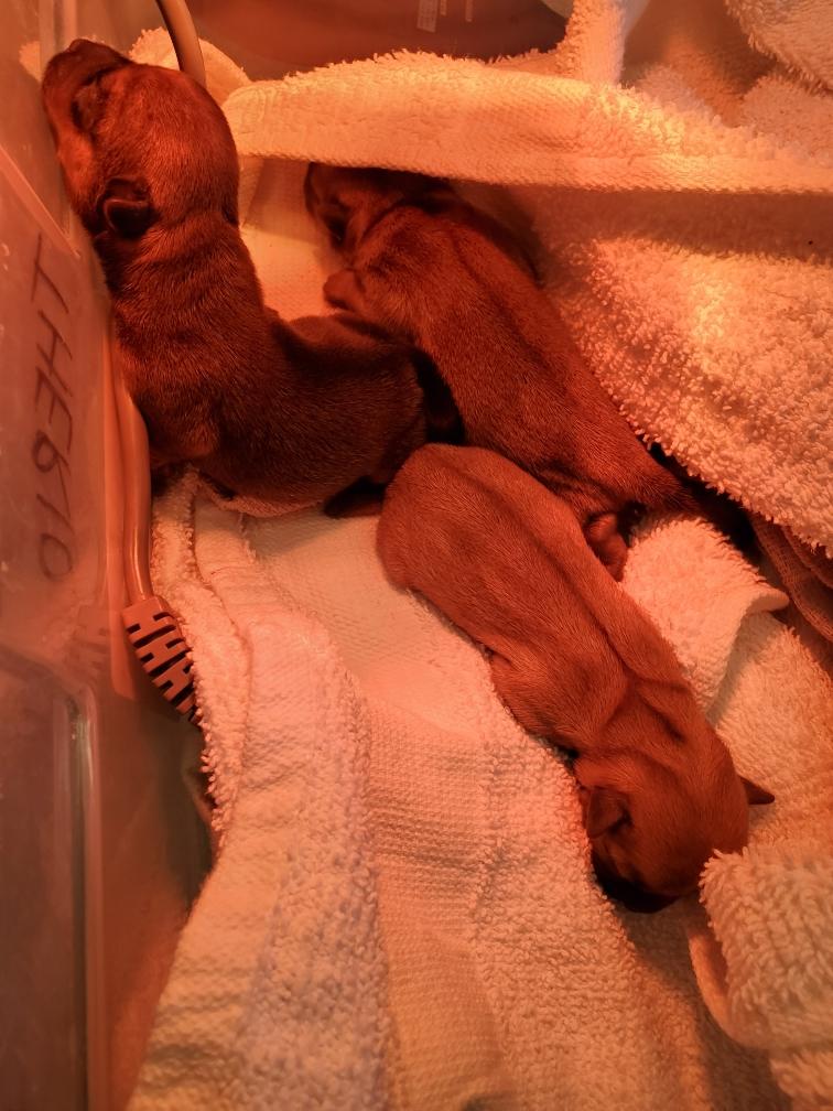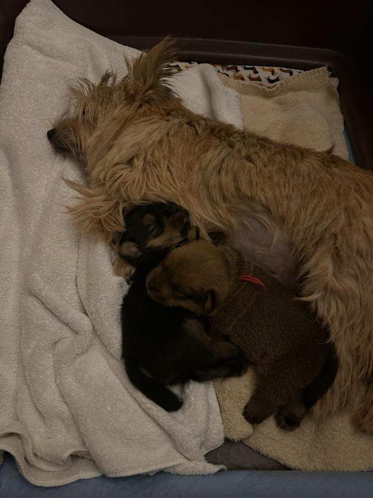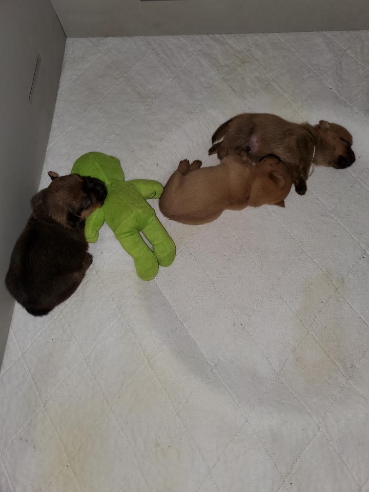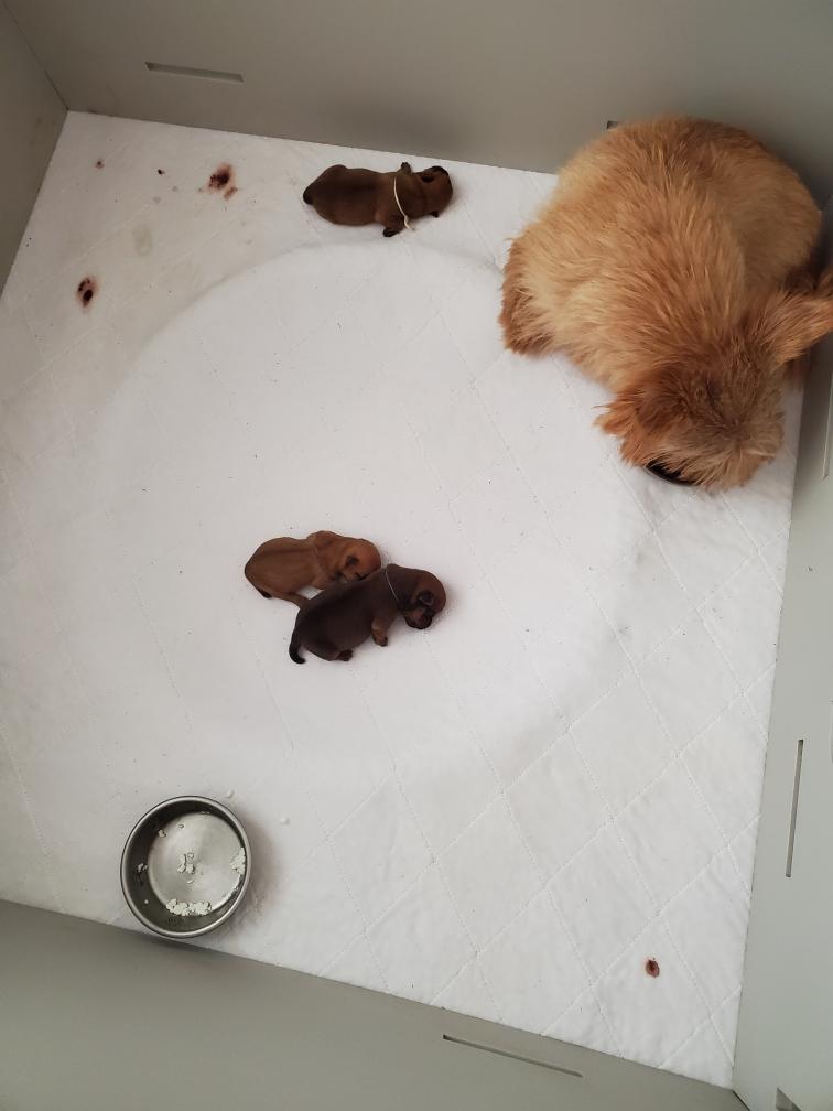 Around 3 pm - after I had sufficient time to build up a good amount of worry - I got the call that everything was fine and that I could come pick up Gwynie and the puppies. My first view of the puppies - two boys and one girl. The red tinge is from a heat lamp. Gwynie was fine - alert but not very active (understandable after surgery). I loaded Gwynie, Siri, and puppies into my car and we drove home. The puppies rode in a box with a hot water bottle to keep them warm.
