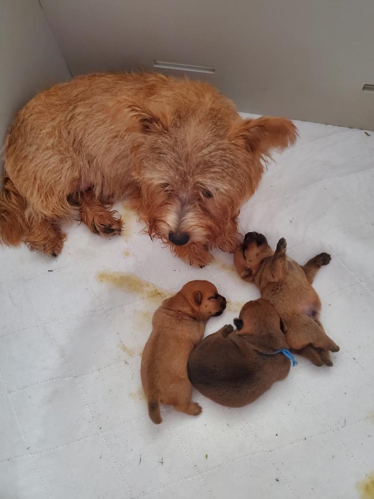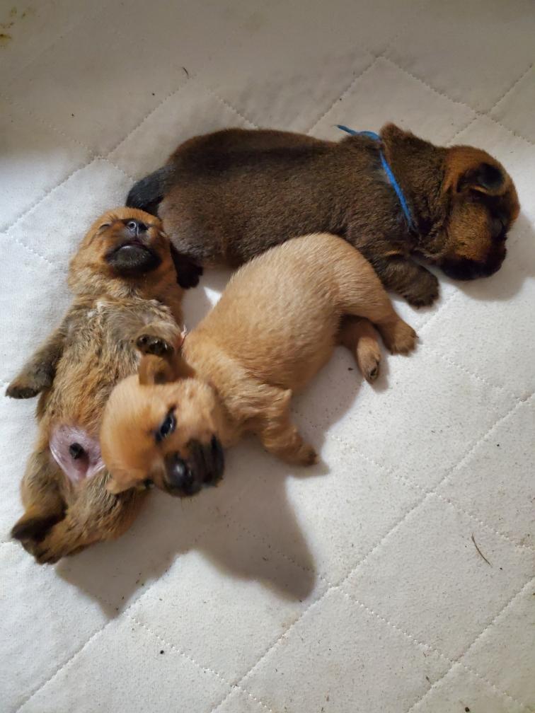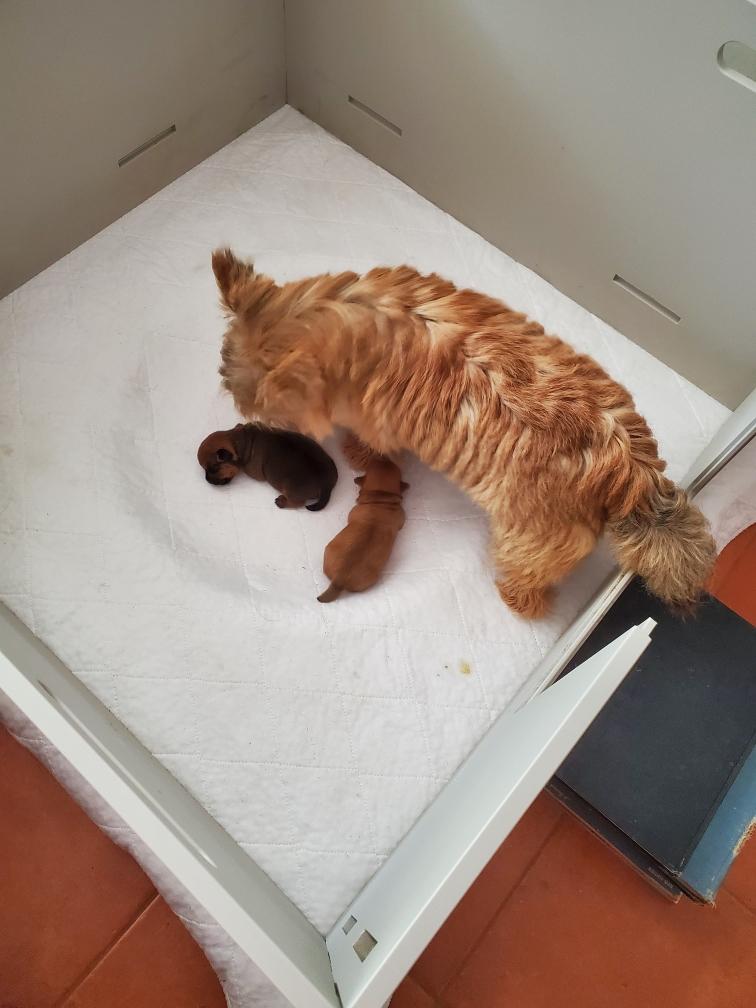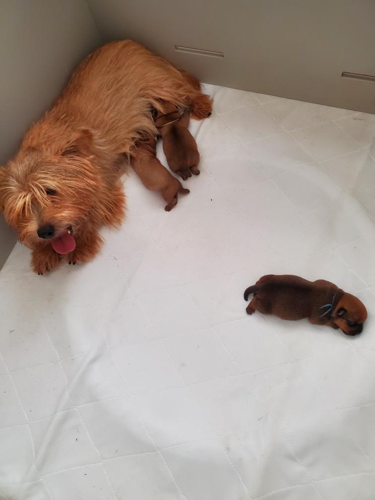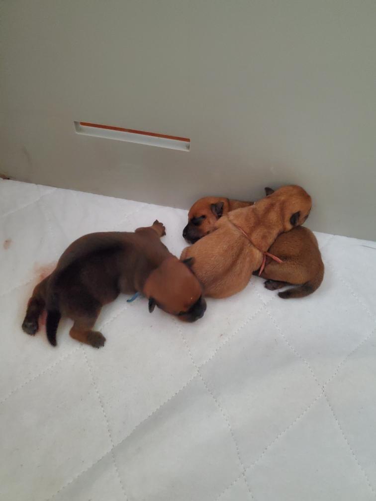 Around 3 pm - after I had sufficient time to build up a good amount of worry - I got the call that everything was fine and that I could come pick up Gwynie and the puppies. My first view of the puppies - two boys and one girl. The red tinge is from a heat lamp. Gwynie was fine - alert but not very active (understandable after surgery). I loaded Gwynie, Siri, and puppies into my car and we drove home. The puppies rode in a box with a hot water bottle to keep them warm.