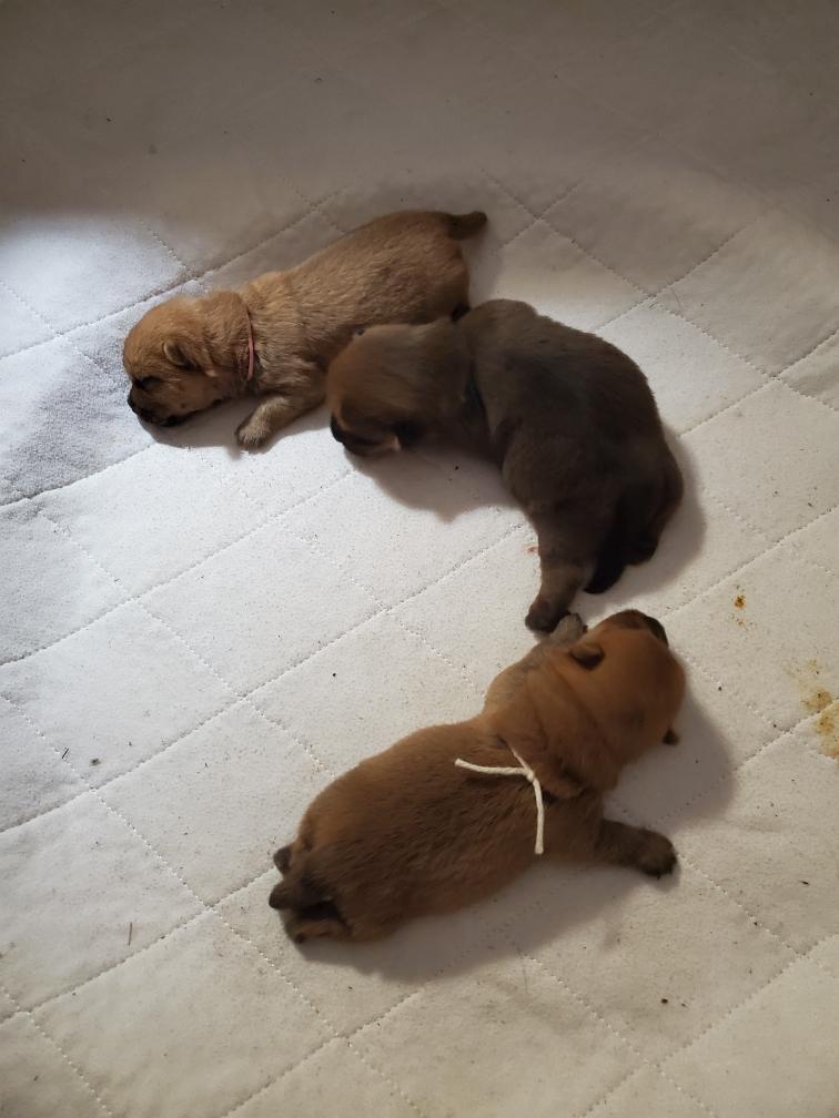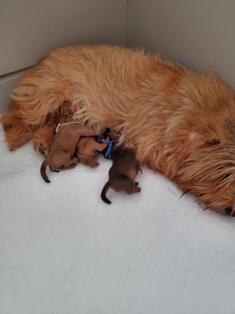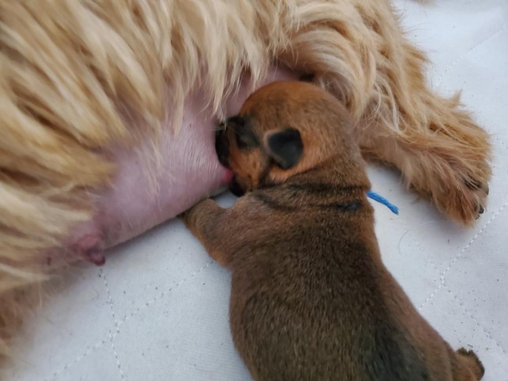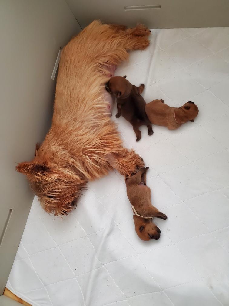 The next order of business was to get the puppies nursing. Gwynie was not sure about these strange creatures that had suddently appeared. I gently lifted Gwynie's side and slide the puppies against Gwynie and towards nipples. I was happy to see that Gwynie did not resist nor did Gwynie reject the puppies. (I sometimes have ended up in wrestling matches with new mothers after a c-section when I try to get the puppies to initially nurse.) I was also happy to see that all three puppies quickly found a nipple and started sucking, and then sorted themselves out. After nursing for a bit, the puppies lost their initial wrinkly look.