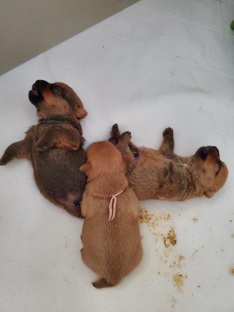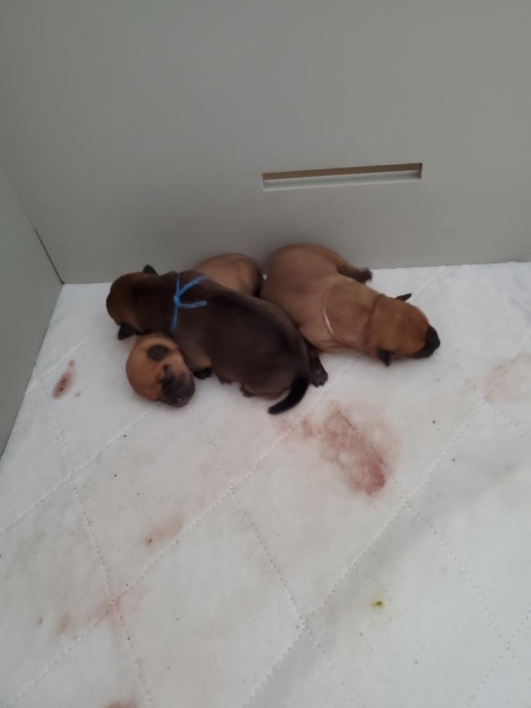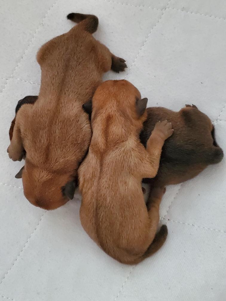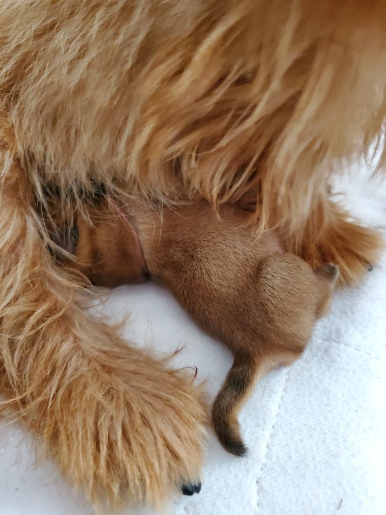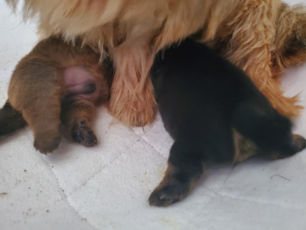 The next order of business was to get the puppies nursing. Gwynie was not sure about these strange creatures that had suddently appeared. I gently lifted Gwynie's side and slide the puppies against Gwynie and towards nipples. I was happy to see that Gwynie did not resist nor did Gwynie reject the puppies. (I sometimes have ended up in wrestling matches with new mothers after a c-section when I try to get the puppies to initially nurse.) I was also happy to see that all three puppies quickly found a nipple and started sucking, and then sorted themselves out. After nursing for a bit, the puppies lost their initial wrinkly look.