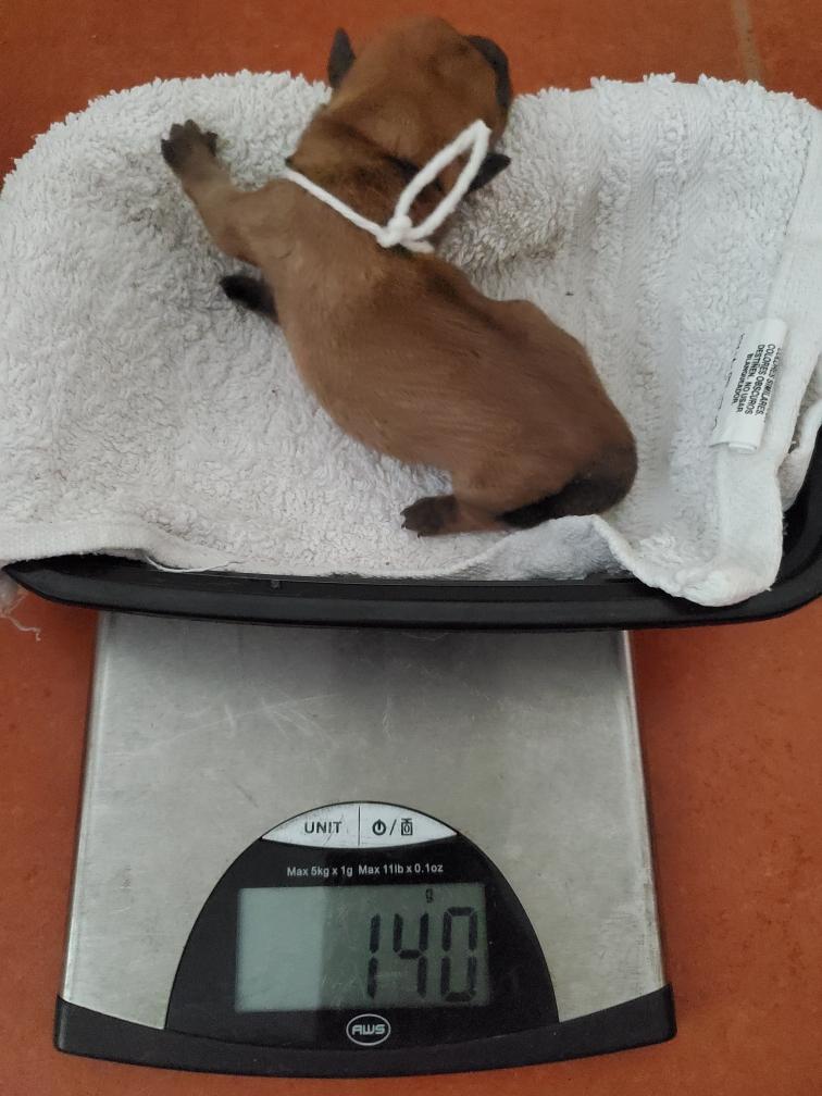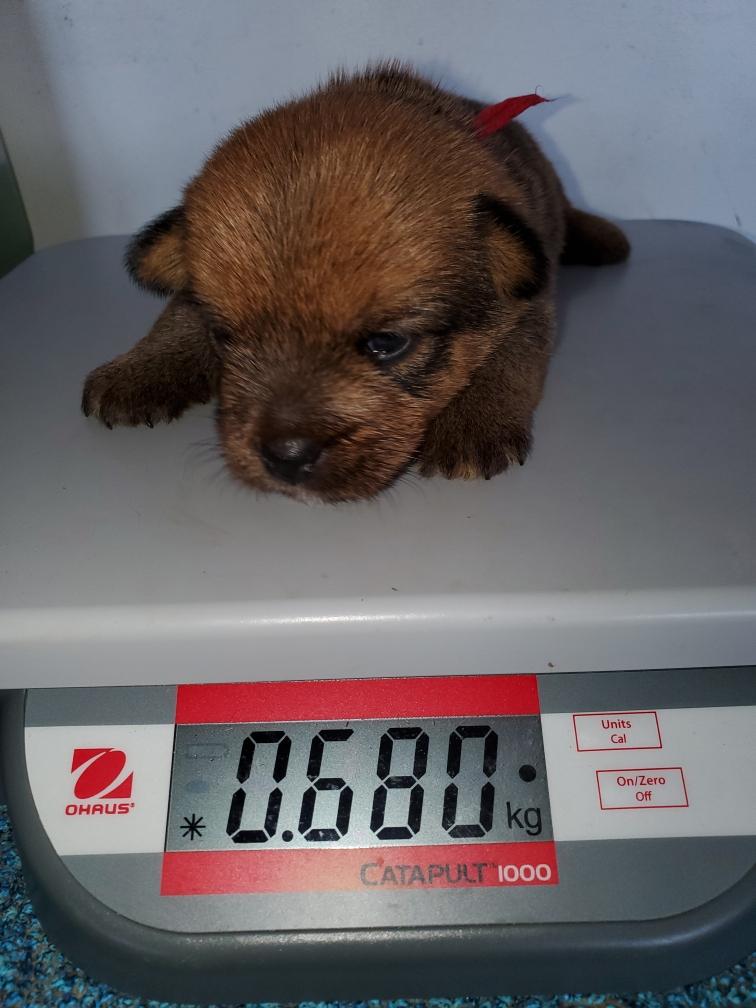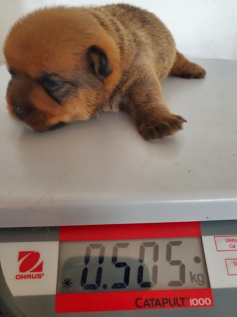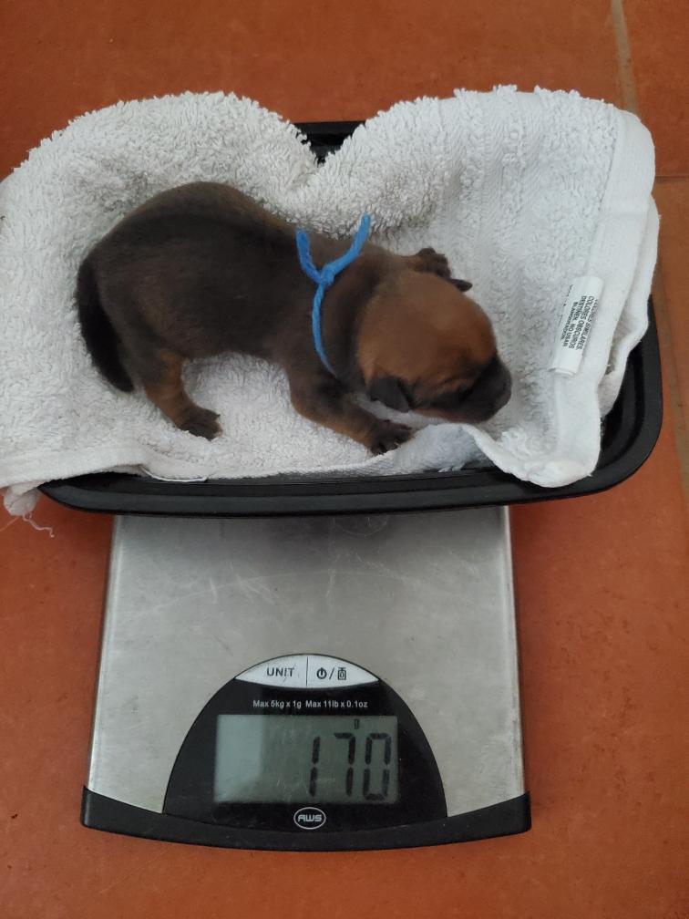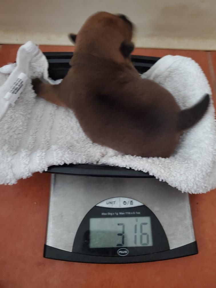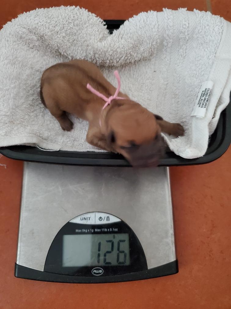 At the evening weigh-in, all the puppies continued their weight gain. During the past twenty-four hours I have been ruthless about pulling both boys off nipples and shoving Pink in to get her chance to nurse. Pink is now above her birth weight.