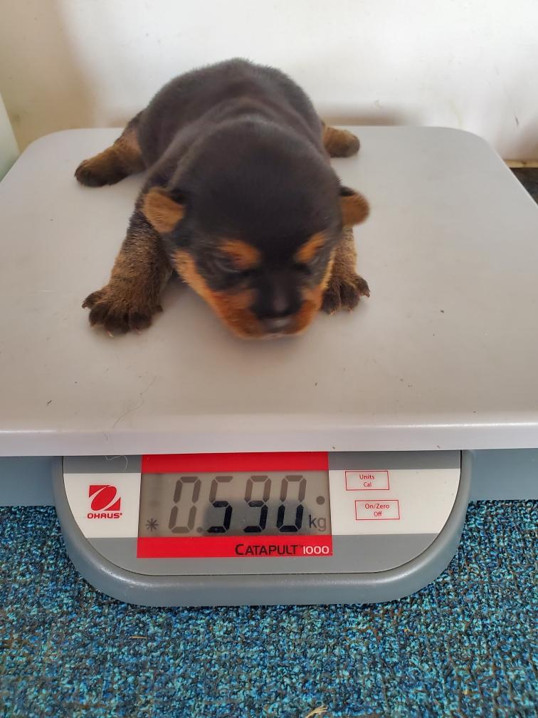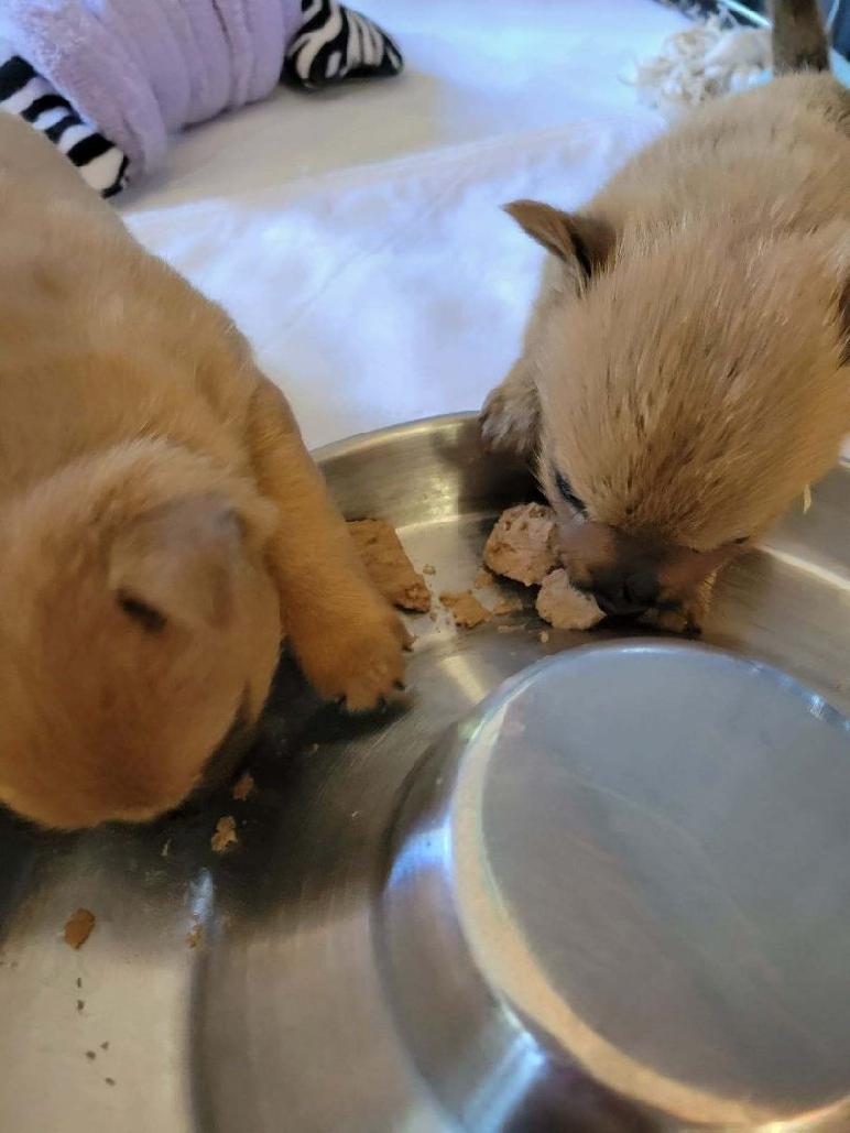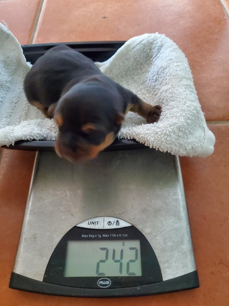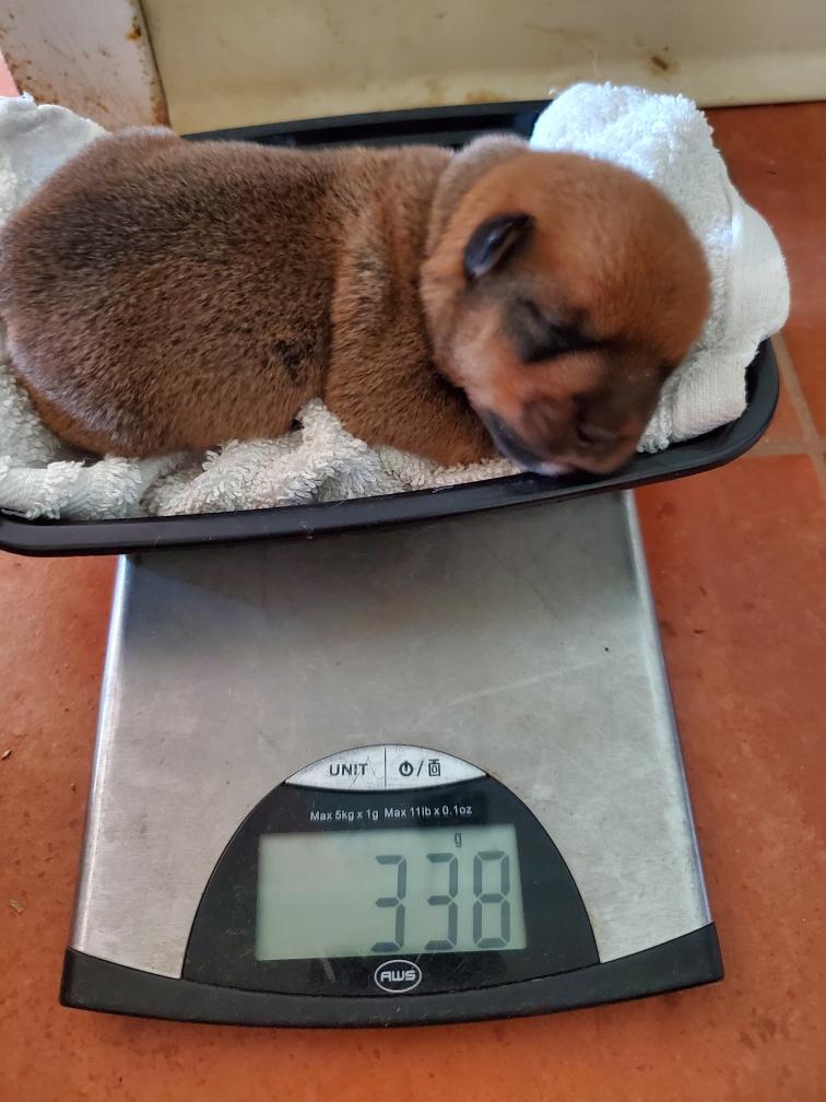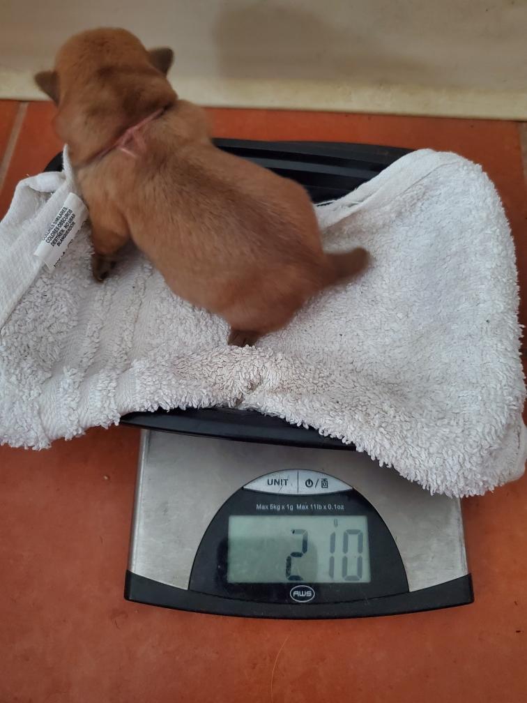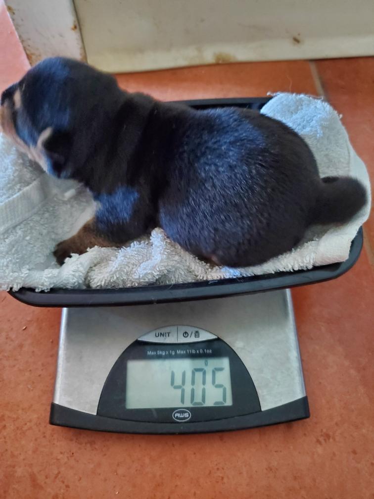 At the evening weigh-in, all the puppies continued their weight gain. During the past twenty-four hours I have been ruthless about pulling both boys off nipples and shoving Pink in to get her chance to nurse. Pink is now above her birth weight.