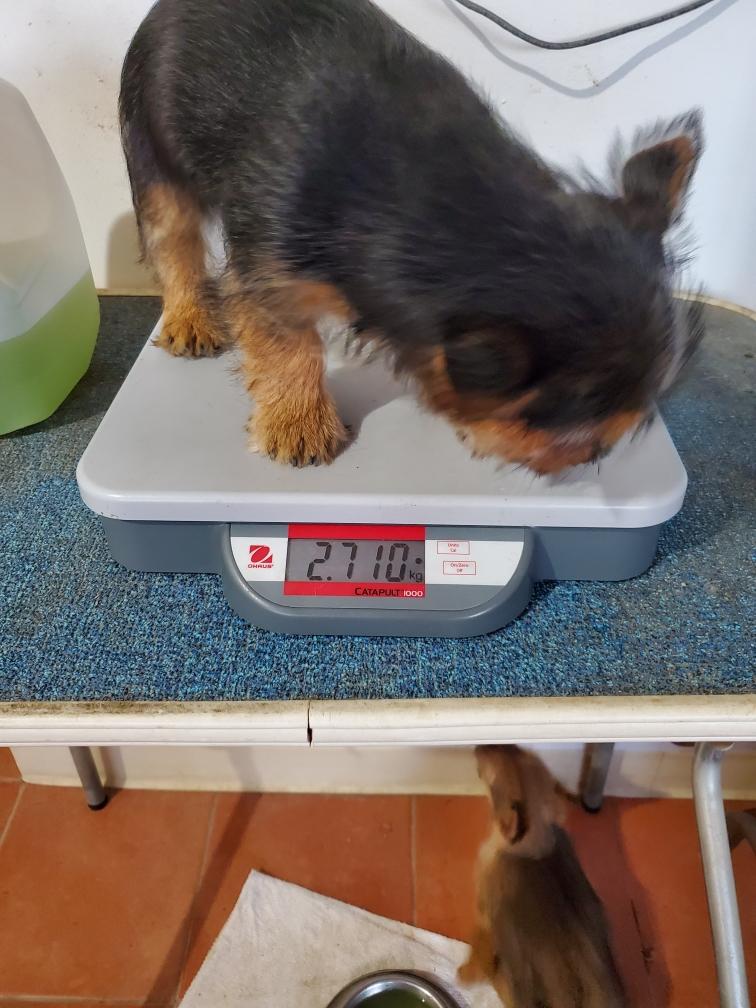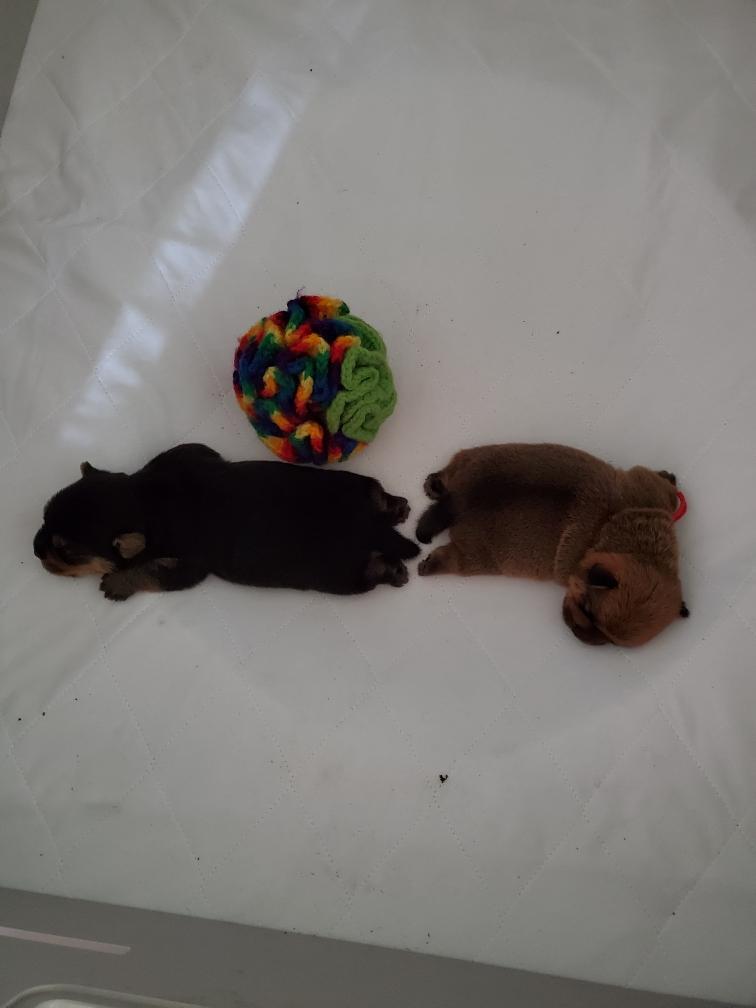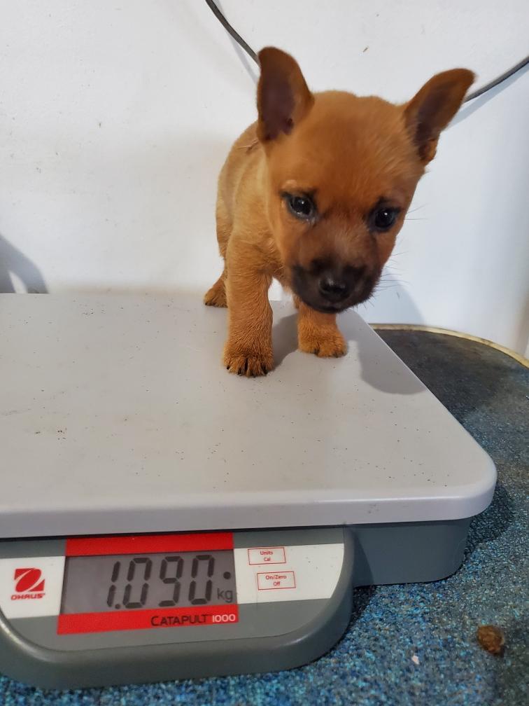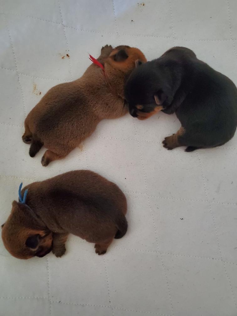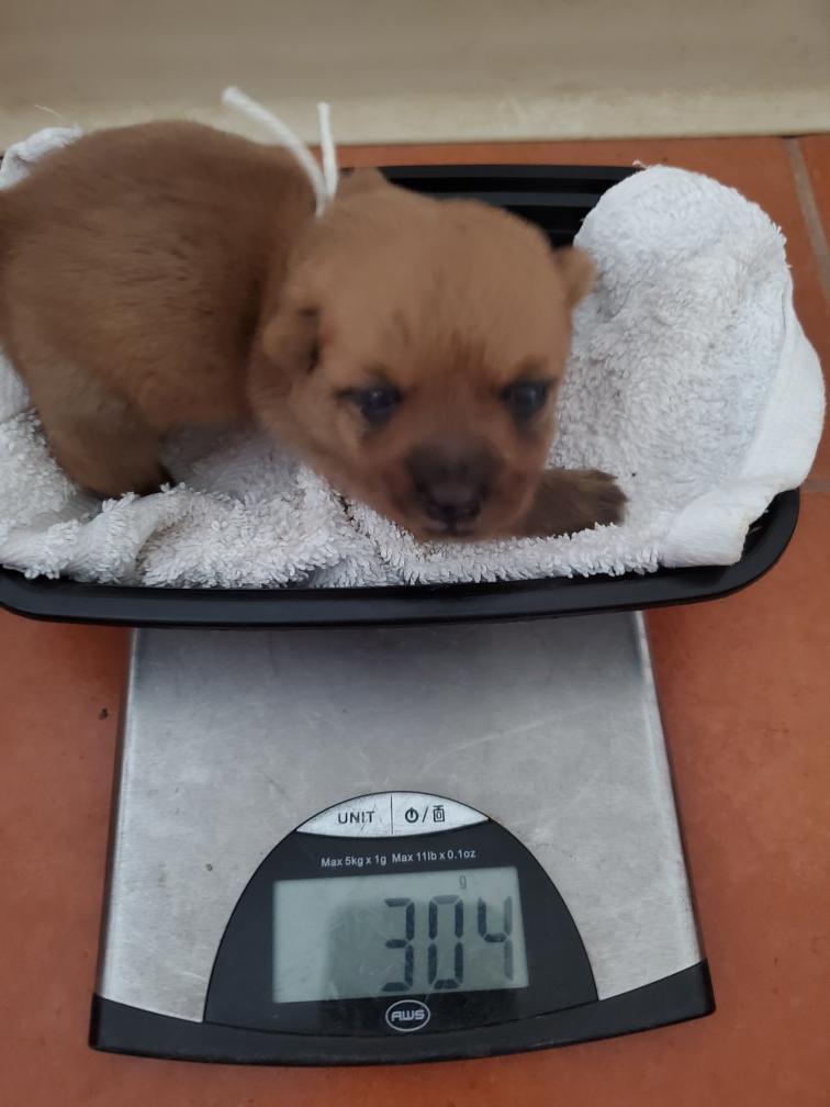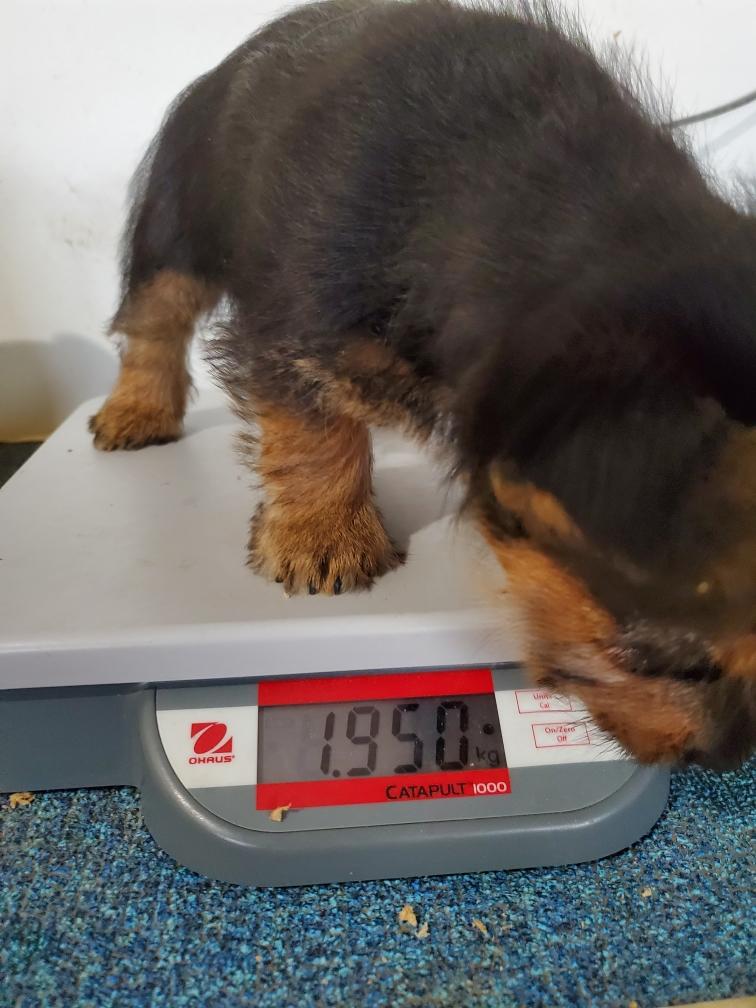 At the evening weigh-in, all the puppies continued their weight gain. During the past twenty-four hours I have been ruthless about pulling both boys off nipples and shoving Pink in to get her chance to nurse. Pink is now above her birth weight.