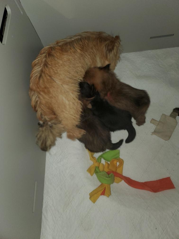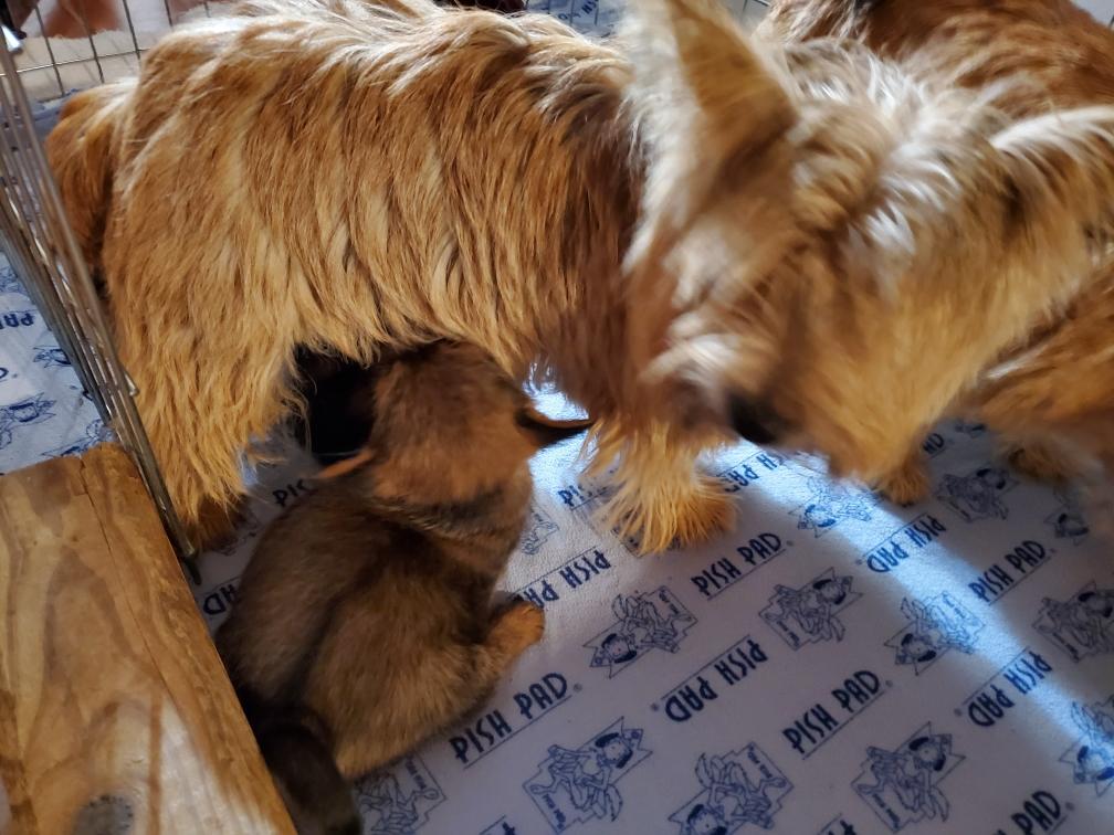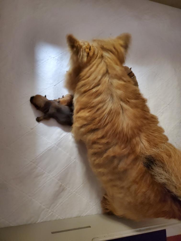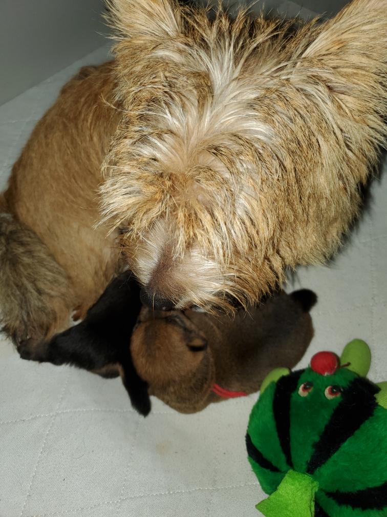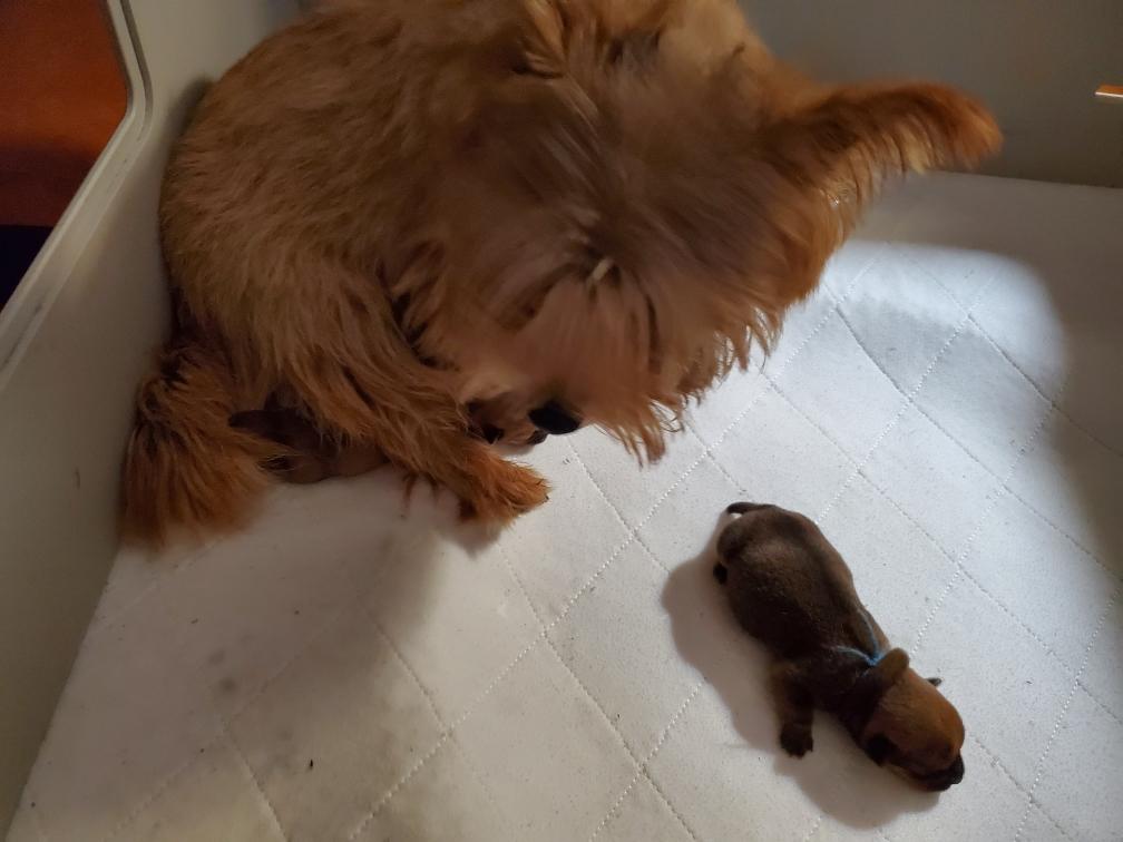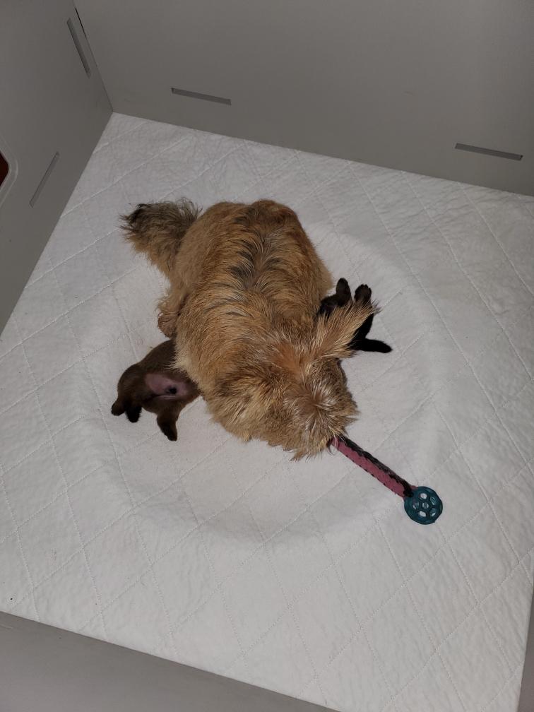 Gwynie ignored the puppies for a sufficient amount time to worry me, but the puppies were busy nursing and no one was crying. Gwynie has now started to vigorously lick the puppies, indicating that she is bonding with them.