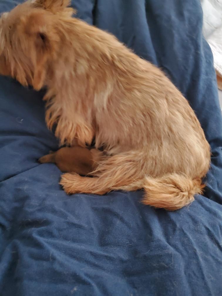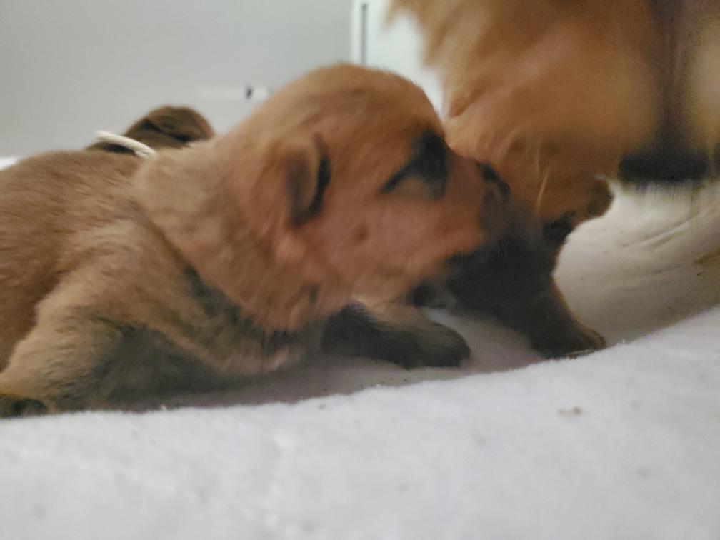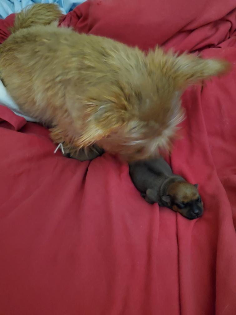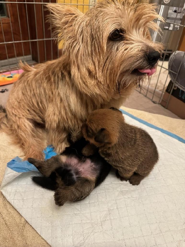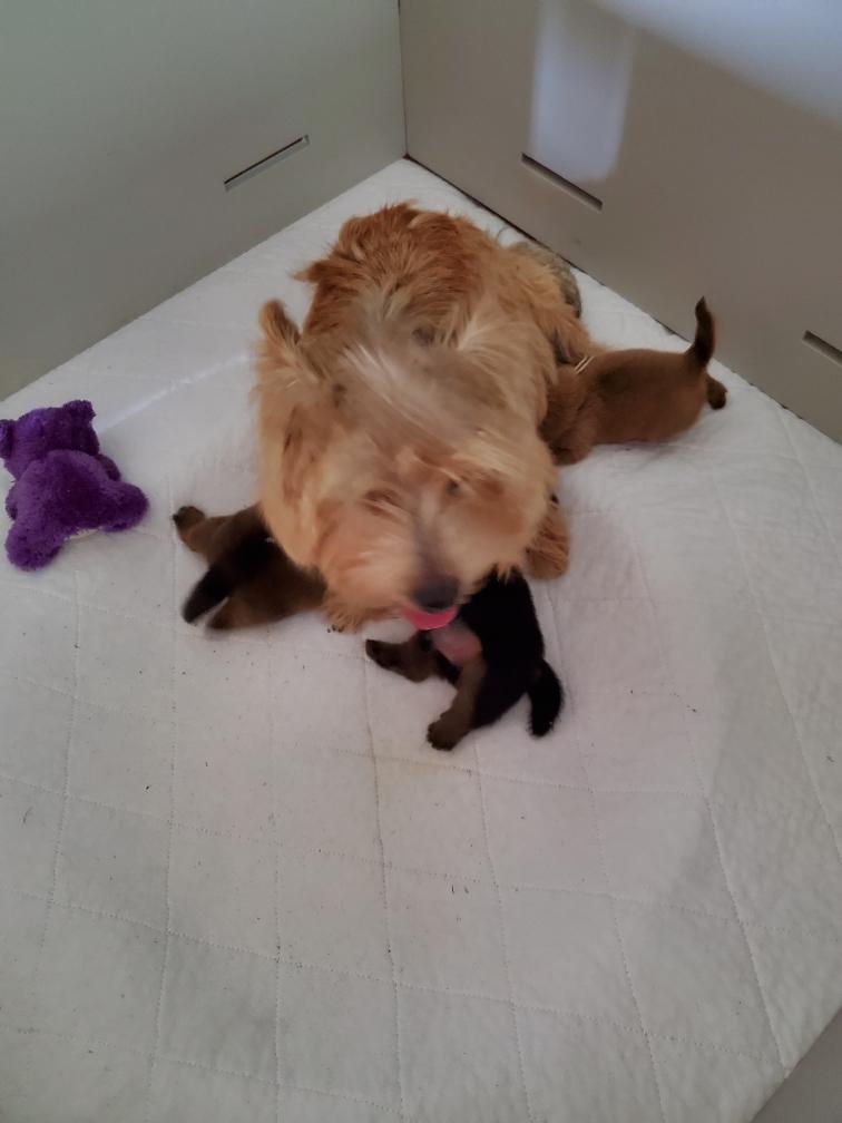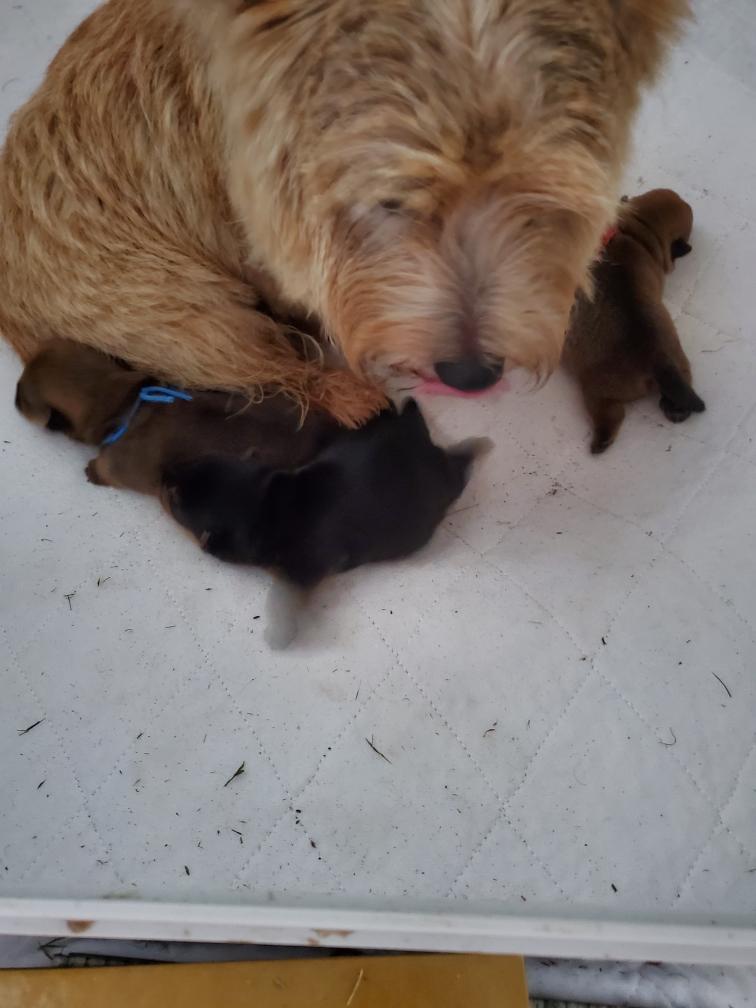 Gwynie ignored the puppies for a sufficient amount time to worry me, but the puppies were busy nursing and no one was crying. Gwynie has now started to vigorously lick the puppies, indicating that she is bonding with them.