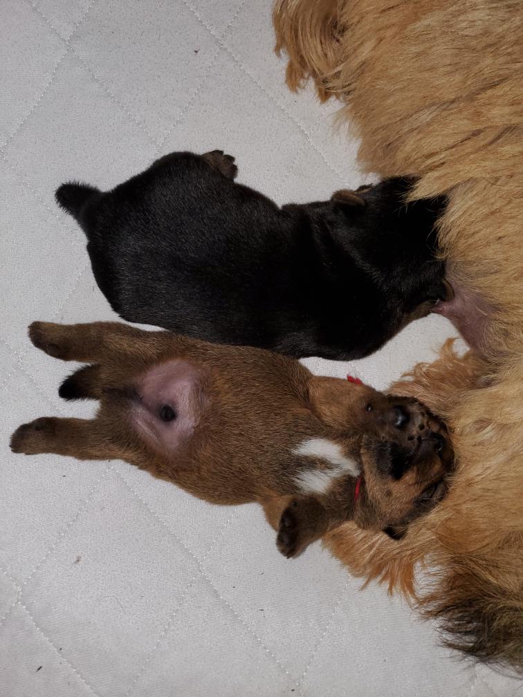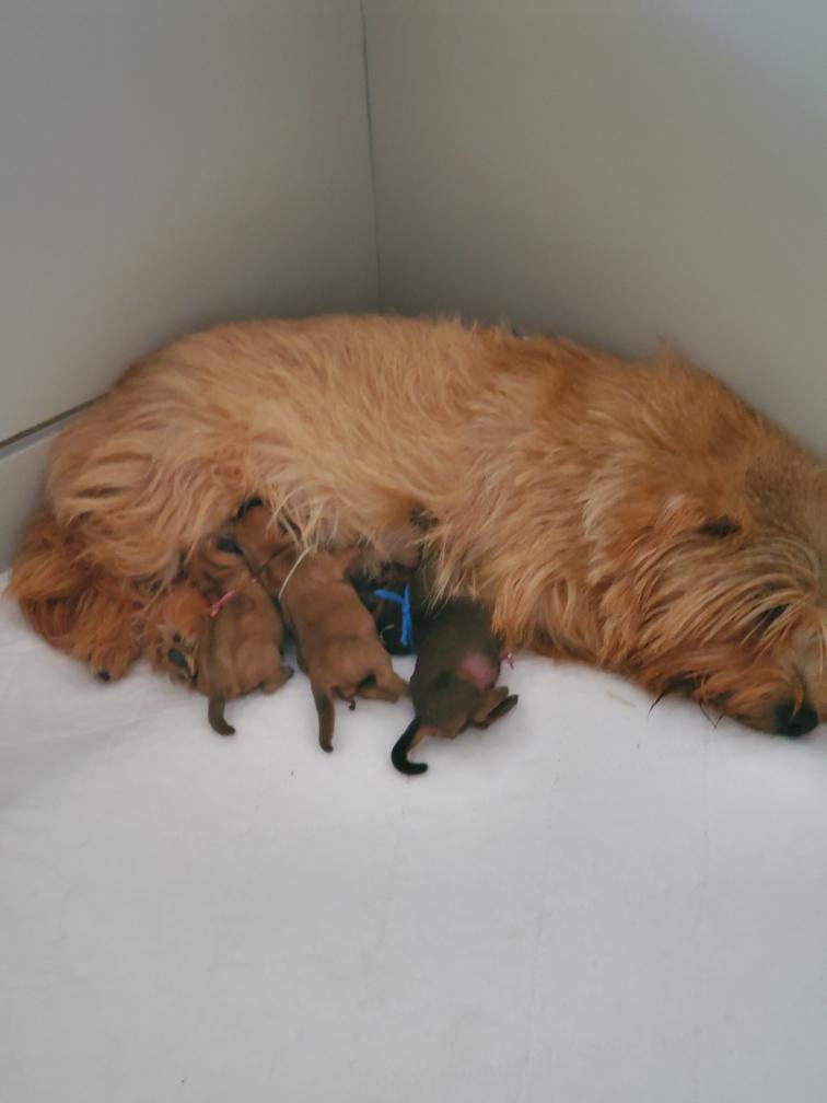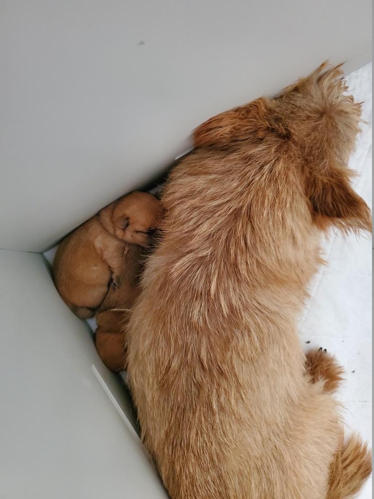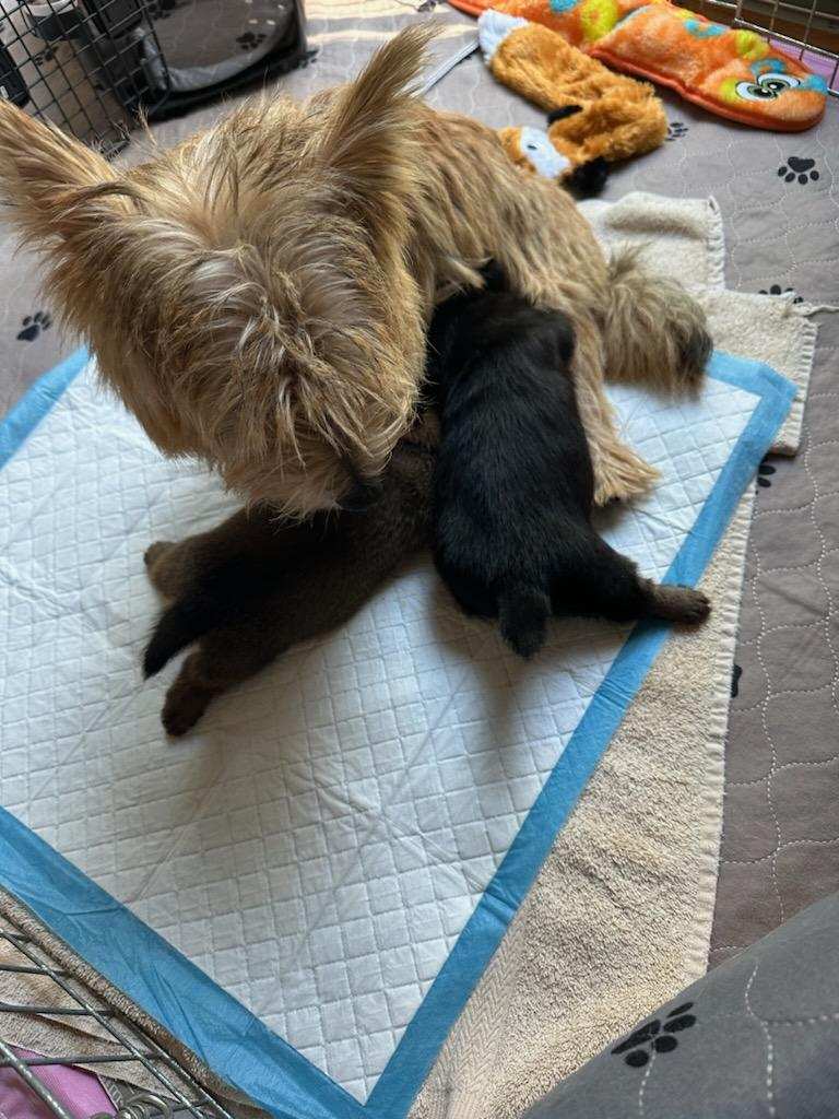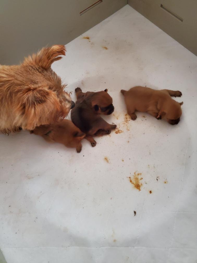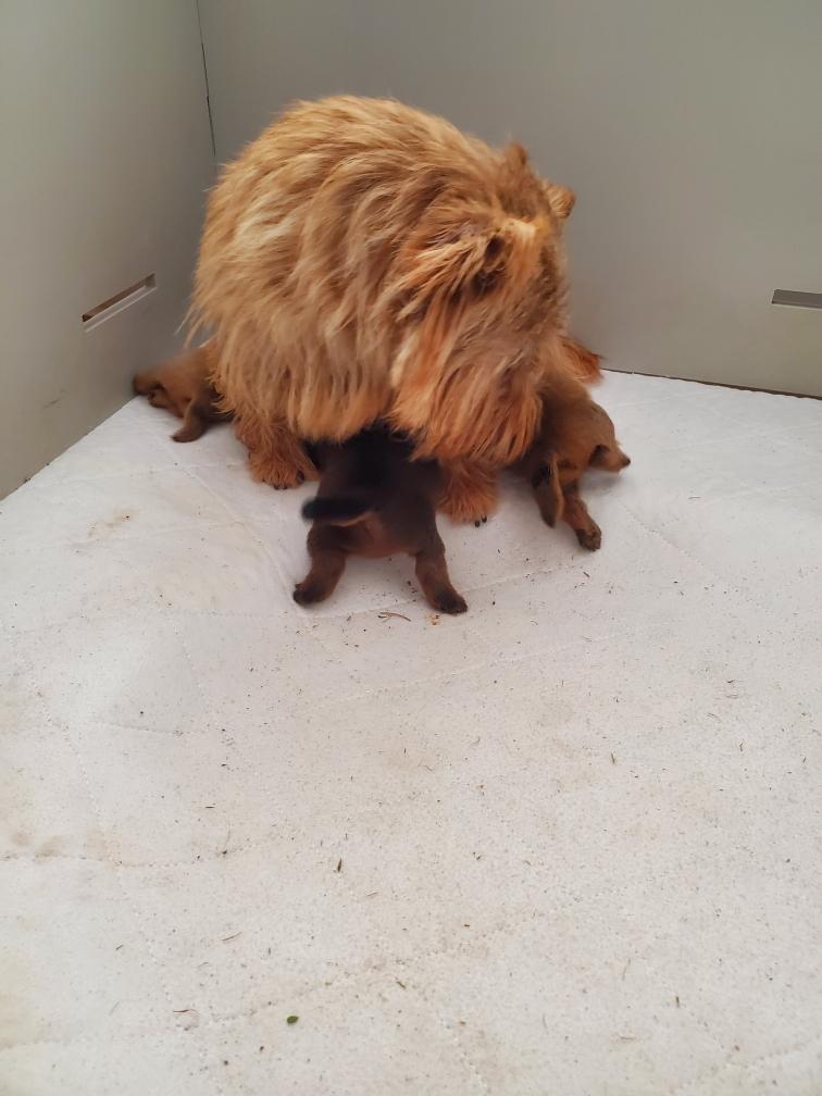 Gwynie ignored the puppies for a sufficient amount time to worry me, but the puppies were busy nursing and no one was crying. Gwynie has now started to vigorously lick the puppies, indicating that she is bonding with them.
