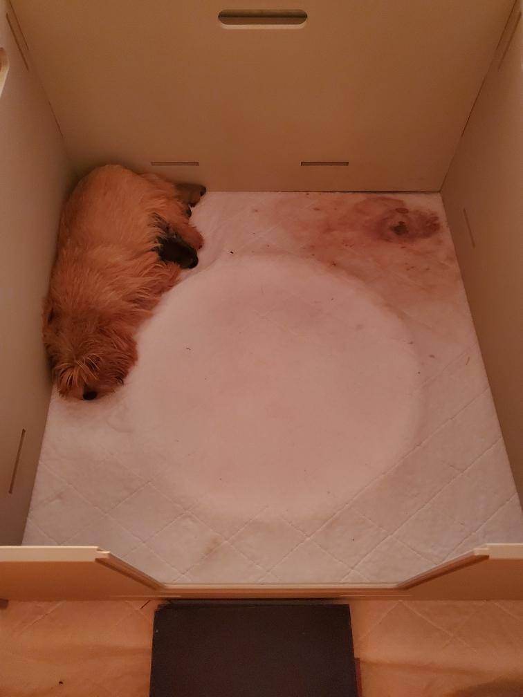 Morning picture. All during the night Gwynie and the puppies were in the upper right of the whelping box, and only this morning moved to the uppper left. The stains you see in the upper right are from Gwynie. Gwynie will have vaginal discharges for the next several weeks as a consequence of her c-section. This is normal.