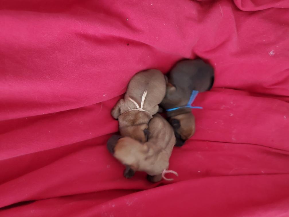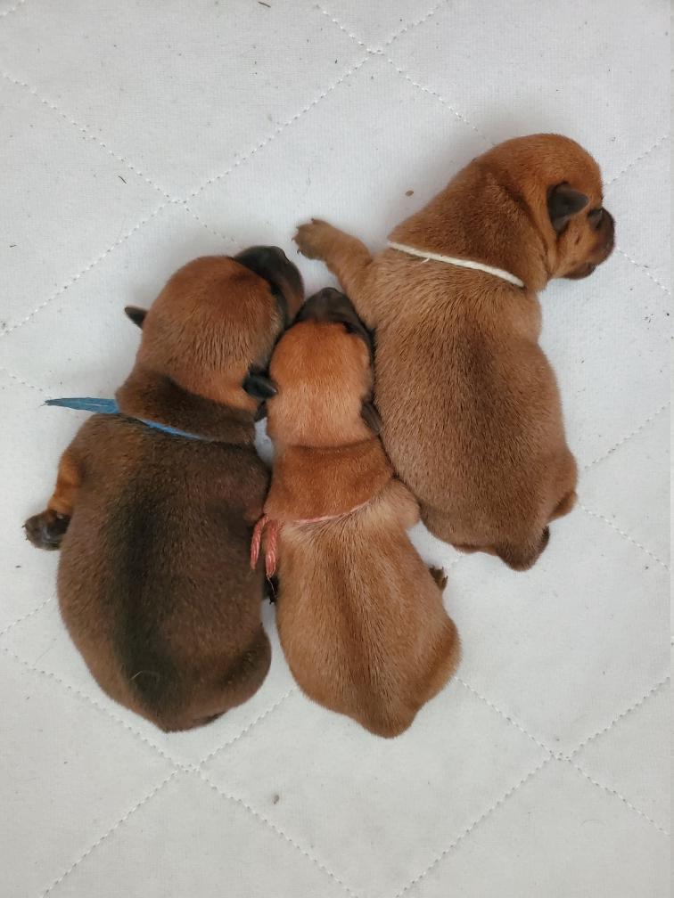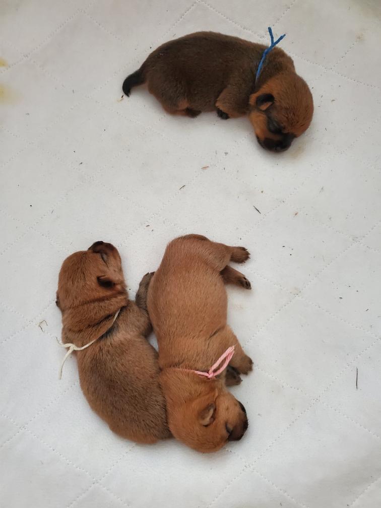 Morning picture. The puppies were temporarily on my bed while I changed the bedding in the whelping box. White (with his new collar) and Pink are underneath Gwynie; Blue is showing off his handsome dark looks against my red blanket.