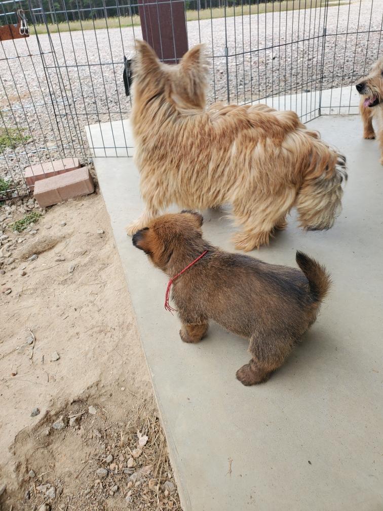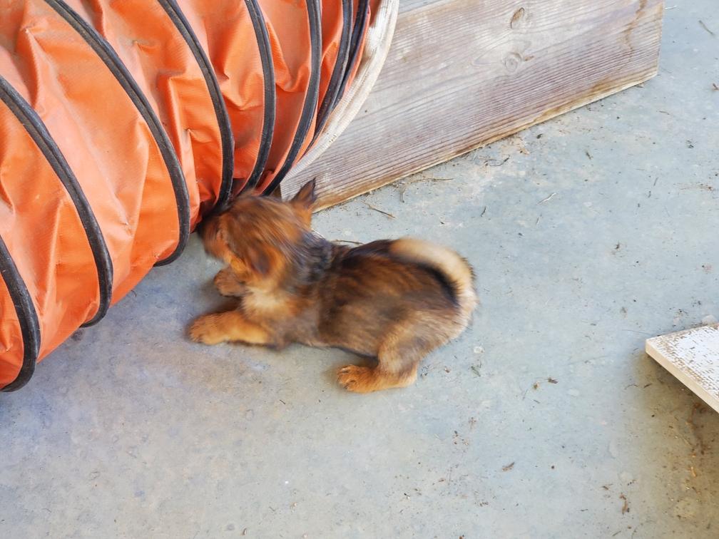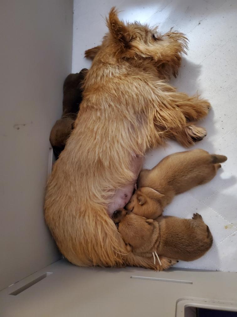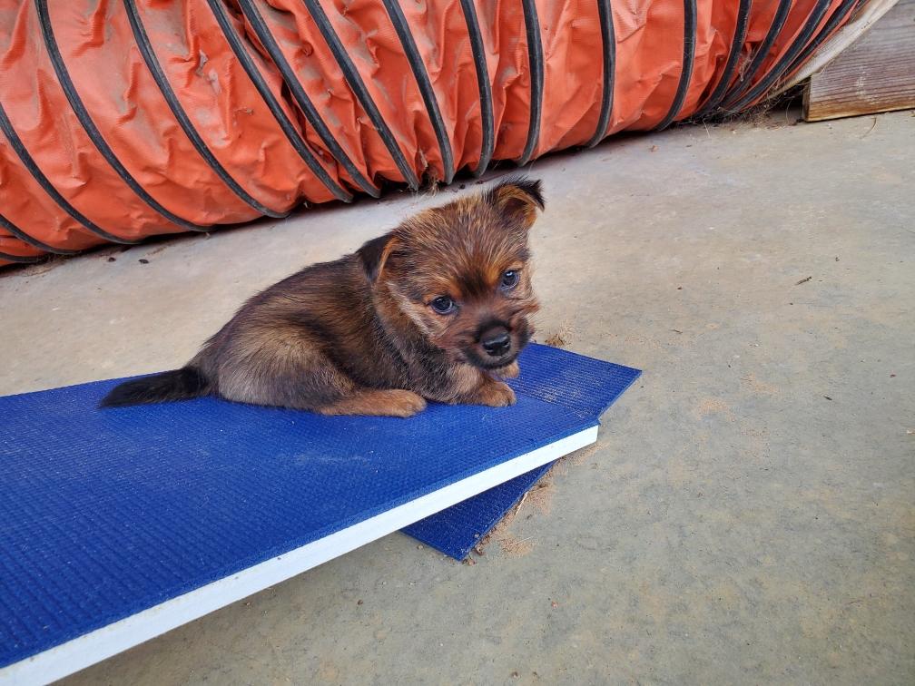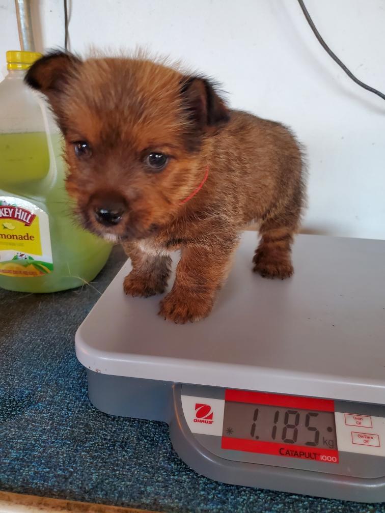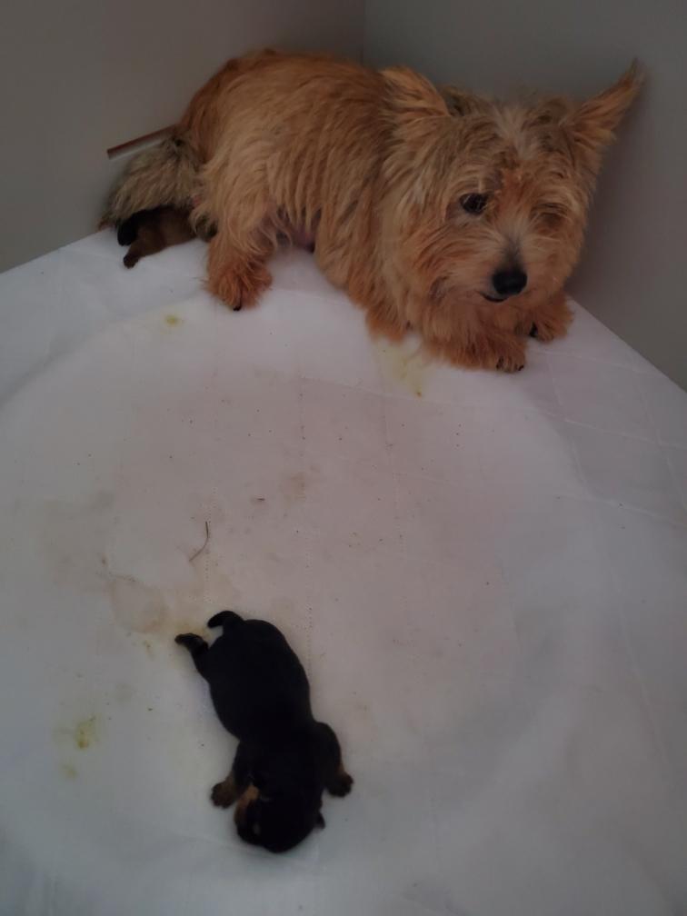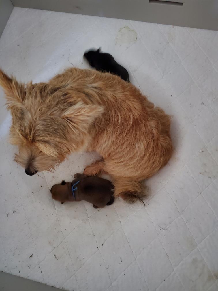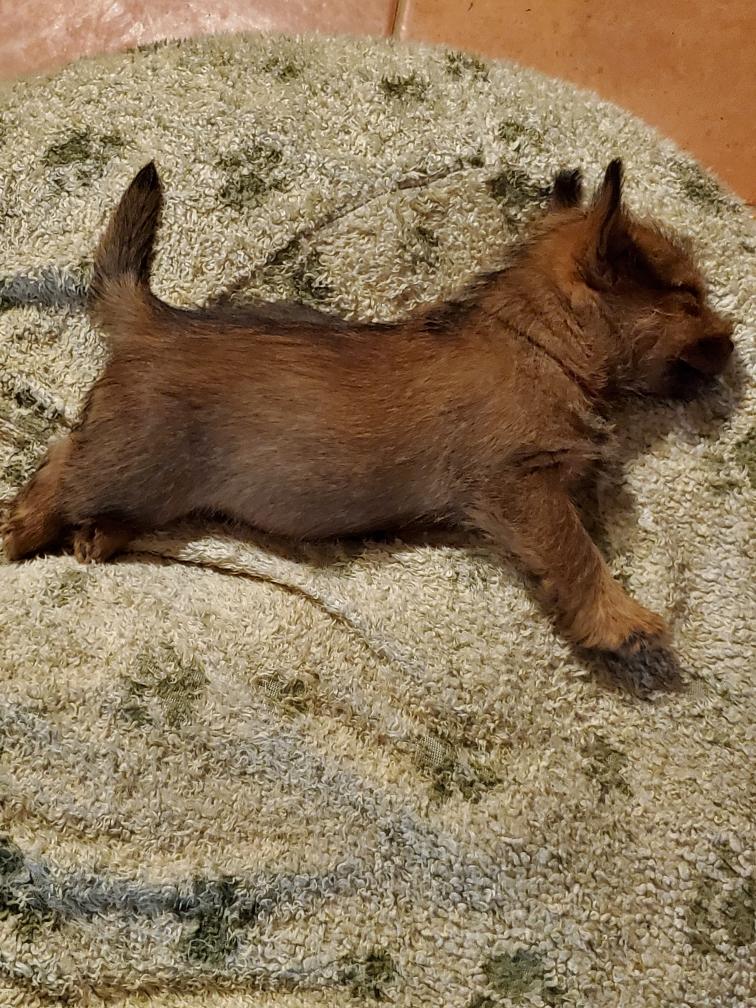 When I was weighing puppies this morning, I noticed that Gwynie's puppy Blue had his mouth open. Later as I was checking on everyone, my heart sank as I saw Blue gasping for air with deep compressions of his chest muscles. Here is a short video in mov format of what I was seeing. I had seen this before in puppies. The signs indicated to me that Blue had "puppy lung development disease" - a fatal condition. The lungs of puppies (and newborn babies) continue to develop after birth. But sometimes things go wrong with this development. The term "puppy lung development disease" is what breeders call this condition. Pathologists can see abnormalities in the lung tissue during an autopsy. It is thought that there is a genetic cause, and we know that it happens in other breeds besides Norwich Terriers. But Norwich Terriers seems to have a higher incidence than other breeds. There was a DNA study of Norwich with puppy lung development disease a couple of years ago (to which I contributed DNA samples), but nothing conclusive seems to have come from the study. In the past I have tried putting an affected puppy in an incubator with an oxygen concentrator, but the treatment had no effect; the puppy died.