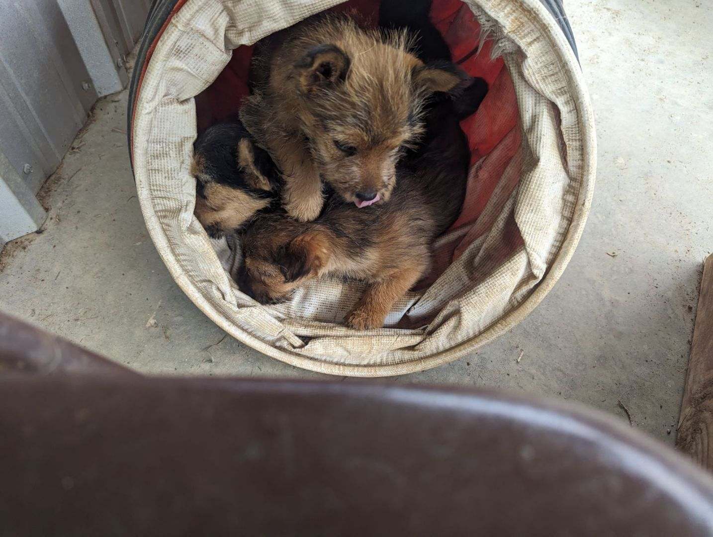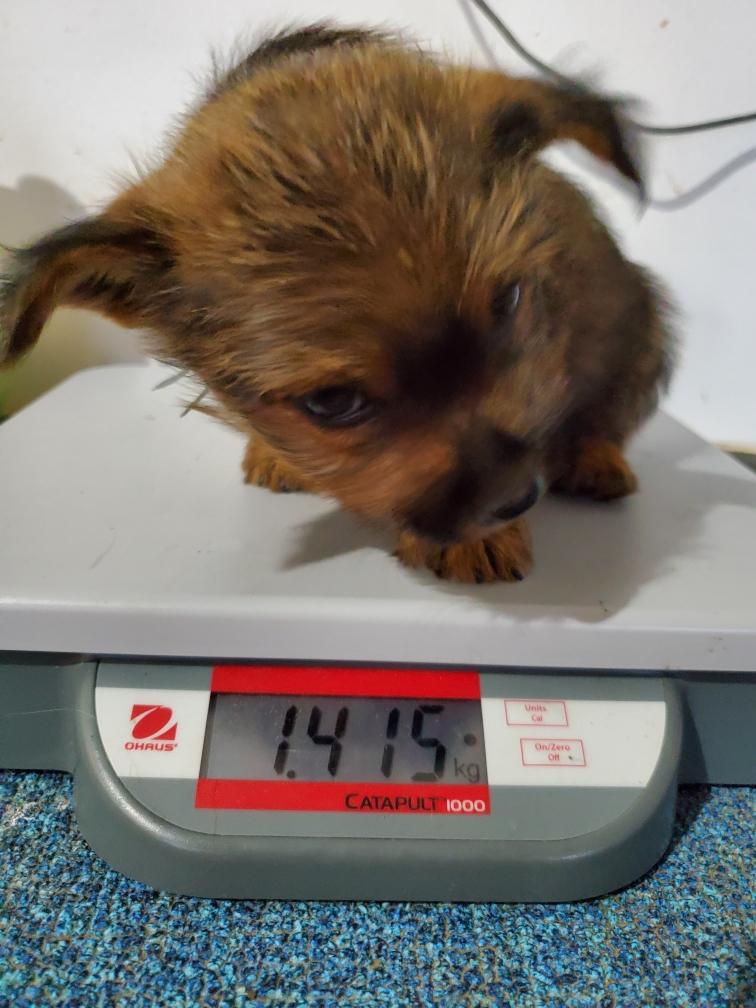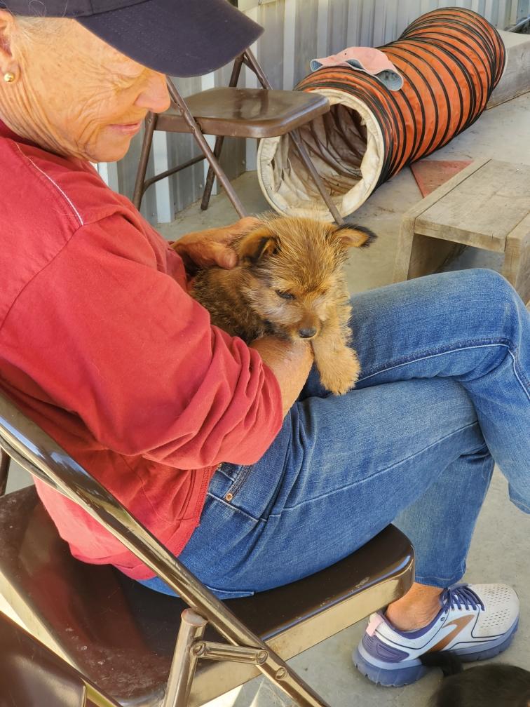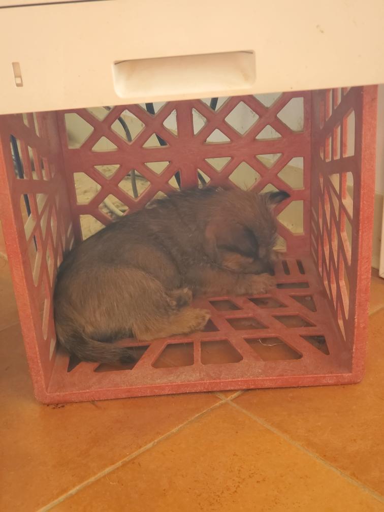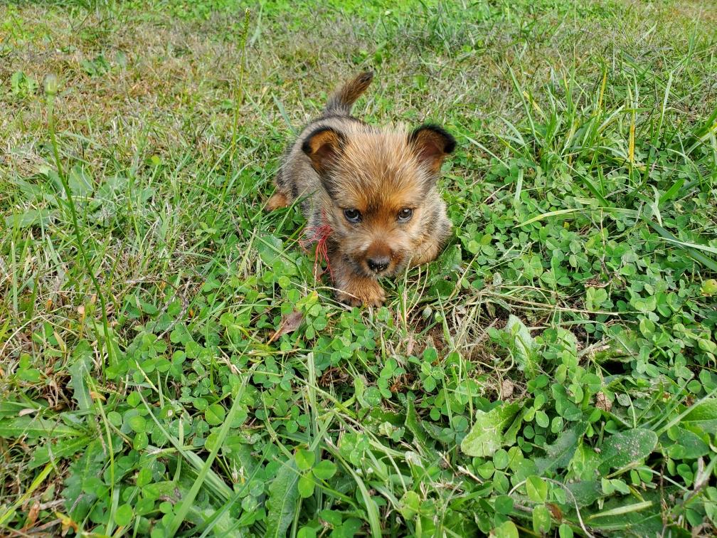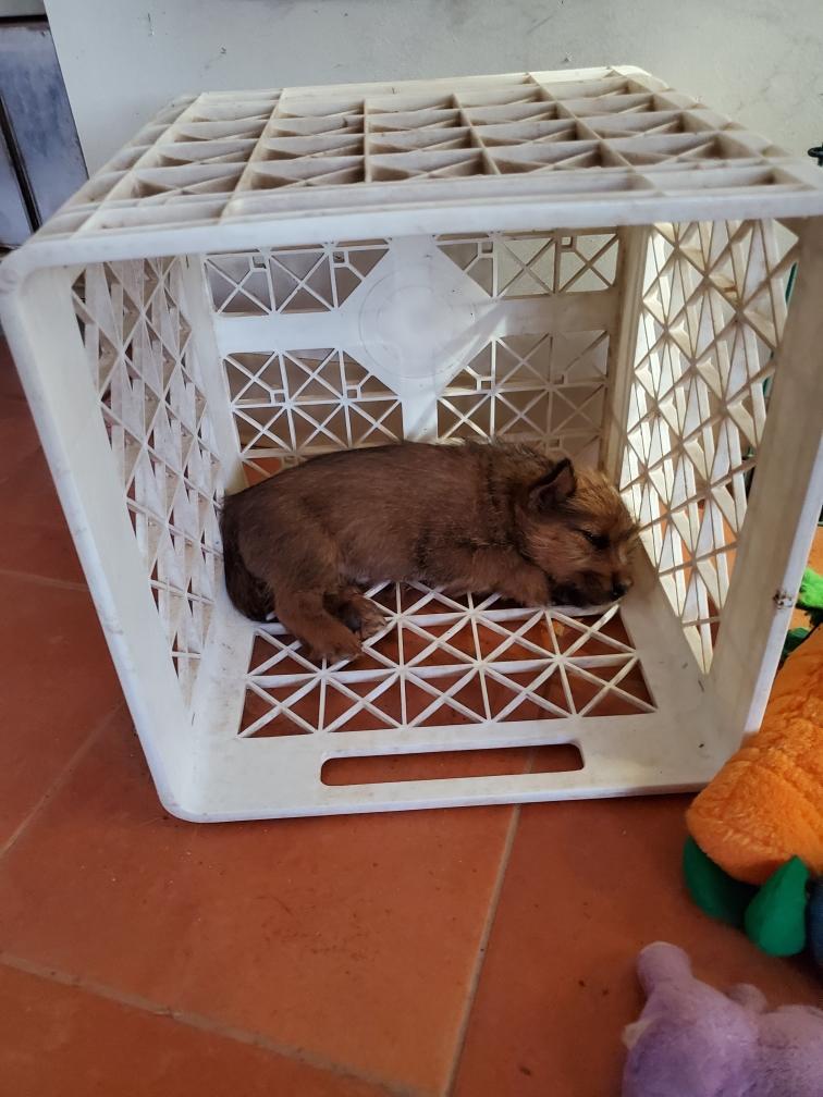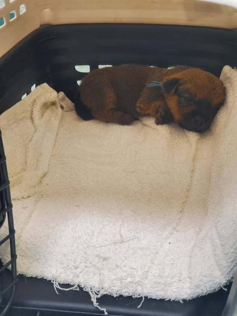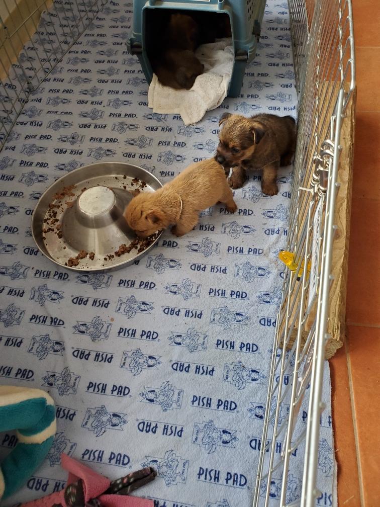 When I was weighing puppies this morning, I noticed that Gwynie's puppy Blue had his mouth open. Later as I was checking on everyone, my heart sank as I saw Blue gasping for air with deep compressions of his chest muscles. Here is a short video in mov format of what I was seeing. I had seen this before in puppies. The signs indicated to me that Blue had "puppy lung development disease" - a fatal condition. The lungs of puppies (and newborn babies) continue to develop after birth. But sometimes things go wrong with this development. The term "puppy lung development disease" is what breeders call this condition. Pathologists can see abnormalities in the lung tissue during an autopsy. It is thought that there is a genetic cause, and we know that it happens in other breeds besides Norwich Terriers. But Norwich Terriers seems to have a higher incidence than other breeds. There was a DNA study of Norwich with puppy lung development disease a couple of years ago (to which I contributed DNA samples), but nothing conclusive seems to have come from the study. In the past I have tried putting an affected puppy in an incubator with an oxygen concentrator, but the treatment had no effect; the puppy died.