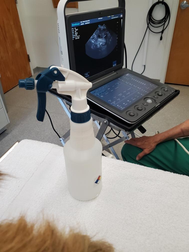 First on the table for an ultrasound was Siri. I have become familiar with reading an ultrasound. As soon as I saw a dark blob with something inside it, I knew that Siri was pregnant. The vet reported that he saw two possibly three puppies, plus one reabsorption site. Counting the number of puppies by ultrasound is notoriously unreliable. So all I really took away was that Siri is pregnant. Unless it is really late in a pregnancy, dogs reabsorb a fetus rather than abort it. There can be many reasons for a reabsorption; the most likely being that the fetus would not be viable.