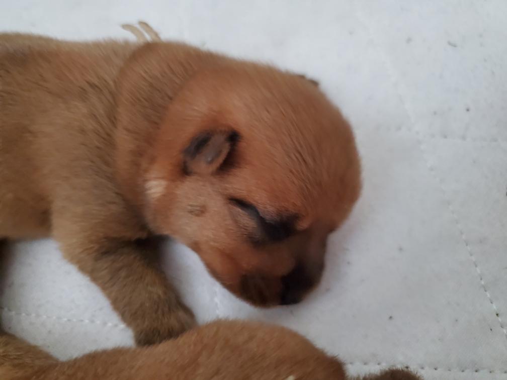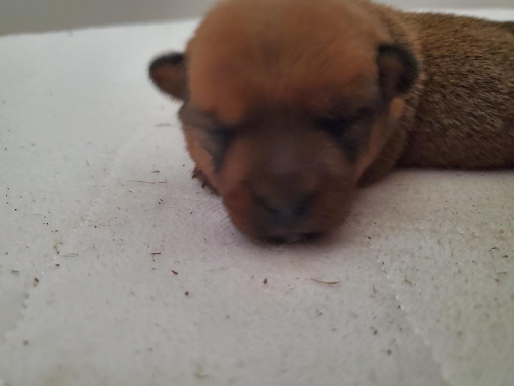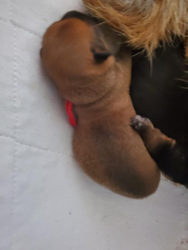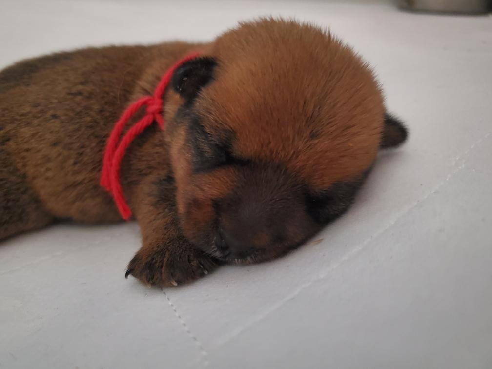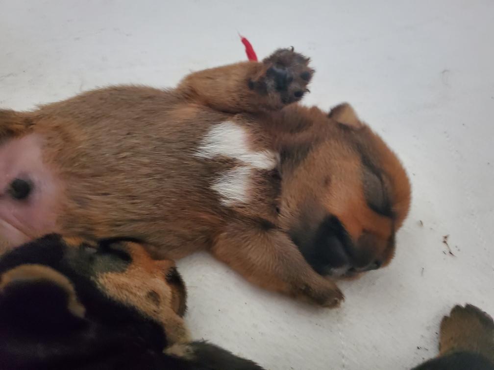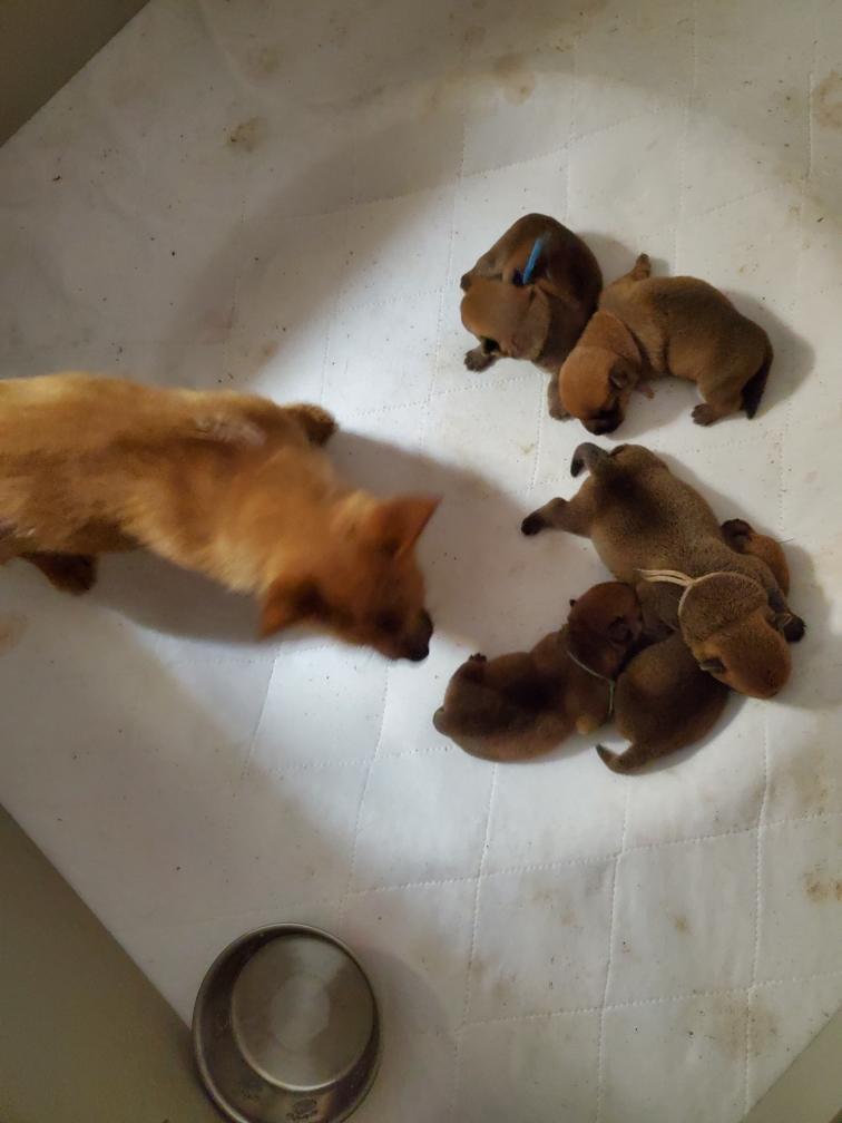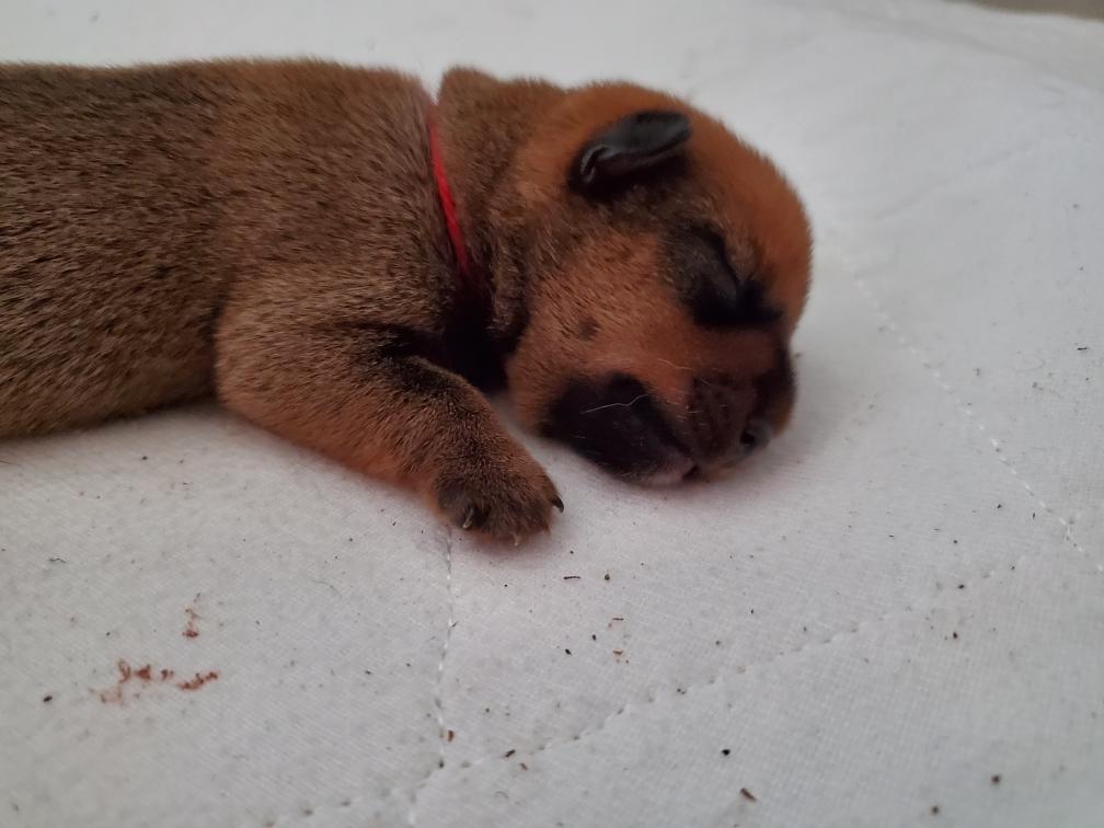 Almost always I see Siri's puppies tucked up underneath Siri. Gwynie did the same thing with her puppies when they were first born. I finally was able to get a photo of Red showing off his collar.