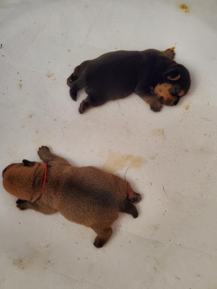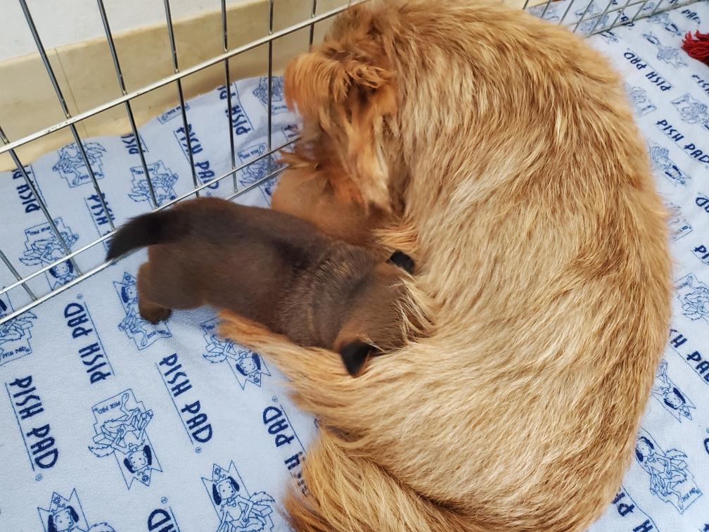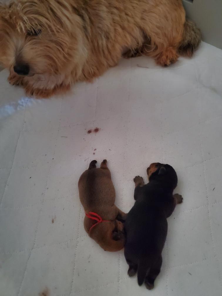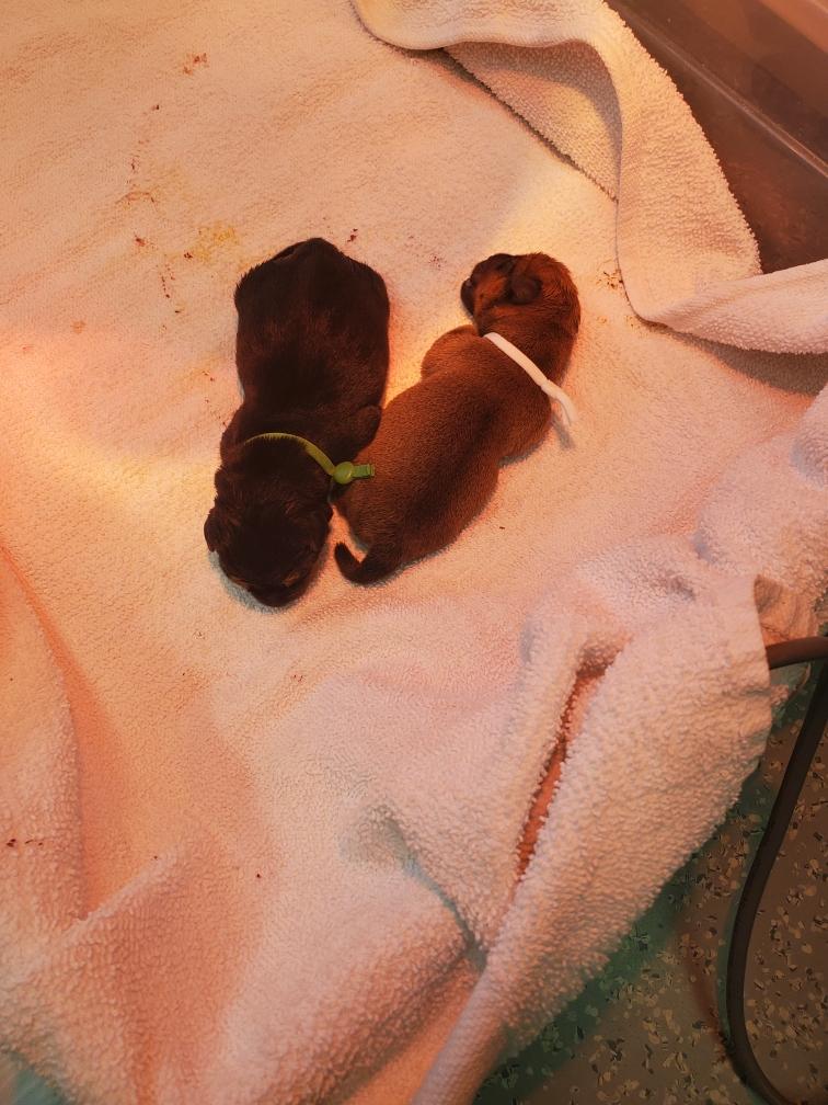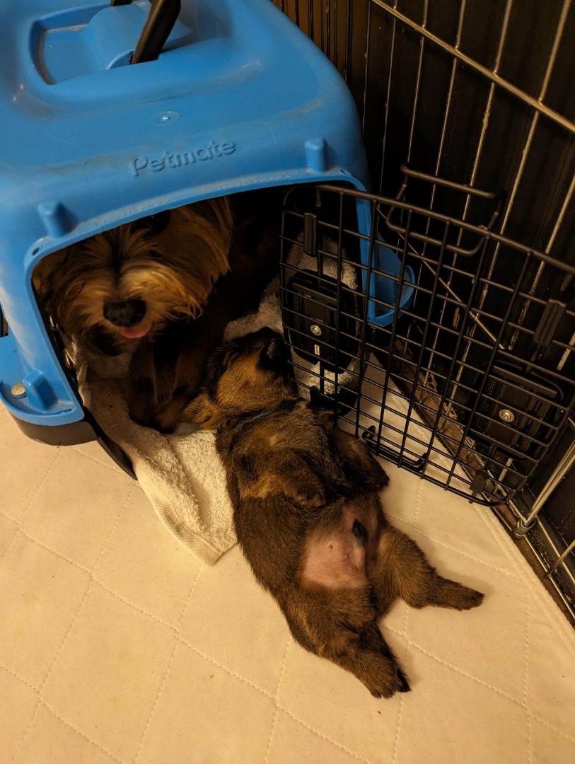 Around 7 pm, I got my first look at Siri's puppies, two healthy boys. The boy on the left is a "black and tan" - coal black except for some tan tips on the face and feet (as the puppy grows the tan will spread); the other boy is a "red". Siri was still a bit groggy from the anesthesia. We loaded up and did the two-hour drive home; the boys whimpering for almost the entire car ride. The boys were in a box with a hot water bottle, but they probably wished to be back inside Siri.