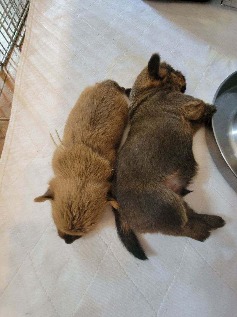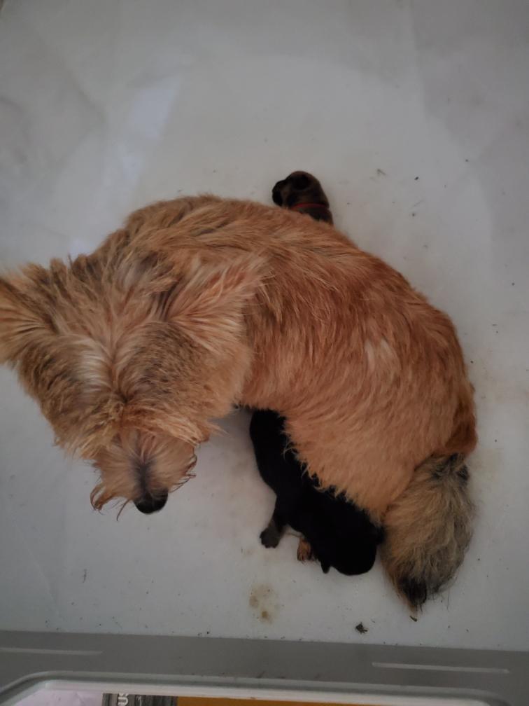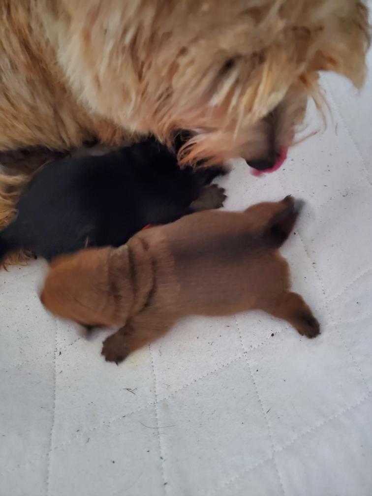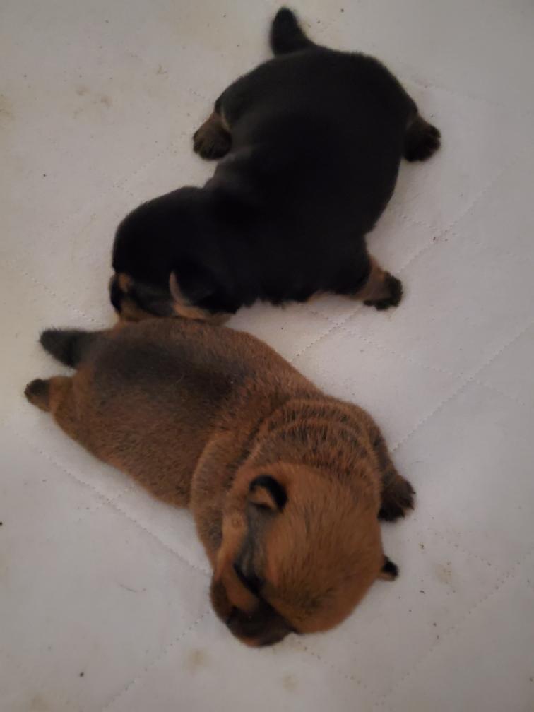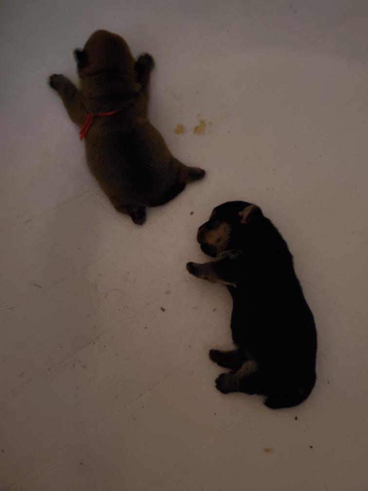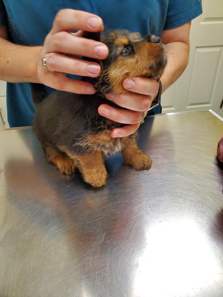 Around 7 pm, I got my first look at Siri's puppies, two healthy boys. The boy on the left is a "black and tan" - coal black except for some tan tips on the face and feet (as the puppy grows the tan will spread); the other boy is a "red". Siri was still a bit groggy from the anesthesia. We loaded up and did the two-hour drive home; the boys whimpering for almost the entire car ride. The boys were in a box with a hot water bottle, but they probably wished to be back inside Siri.