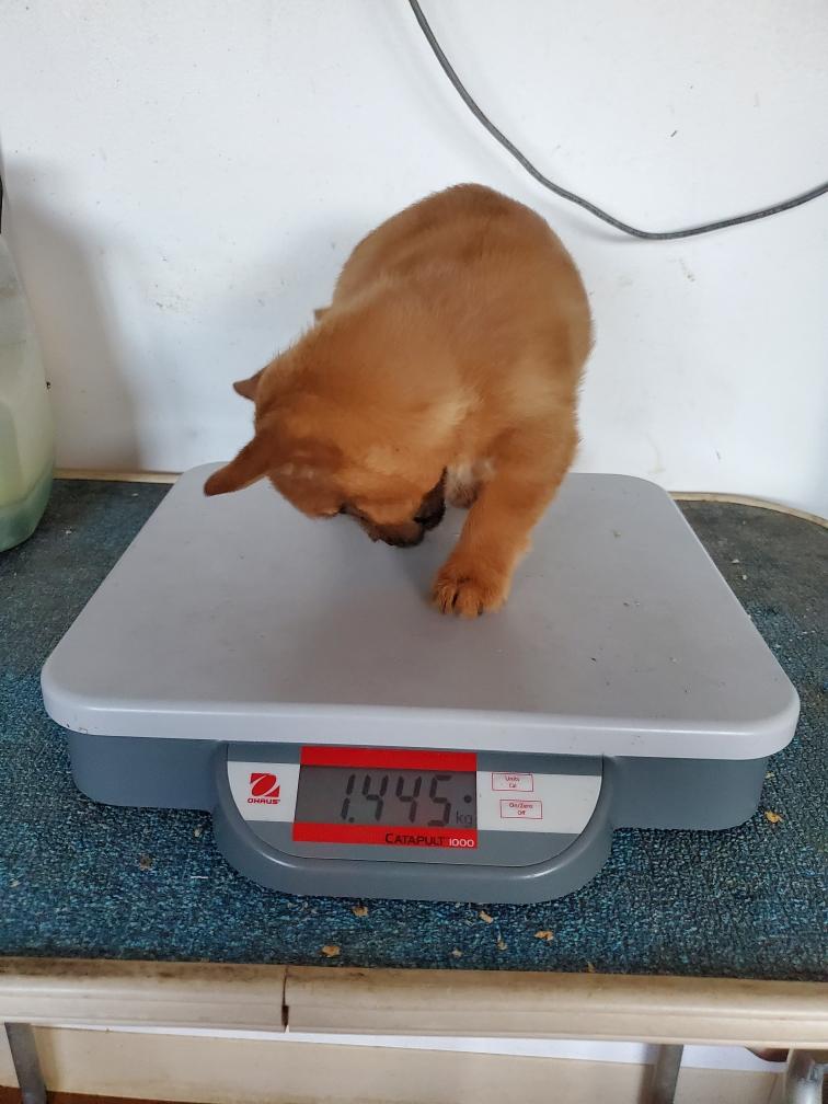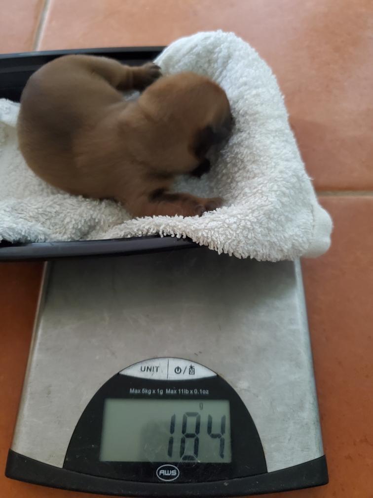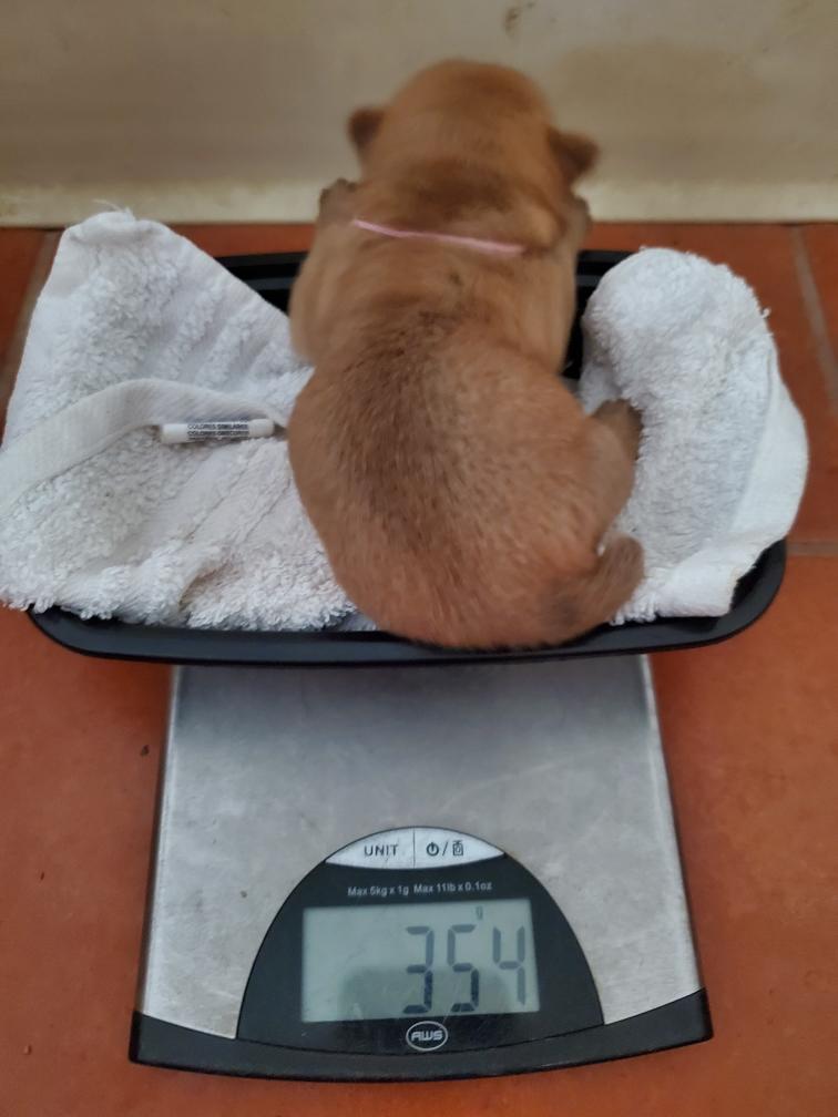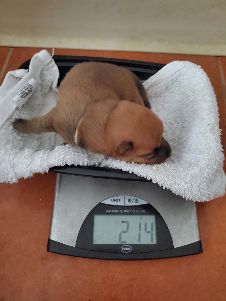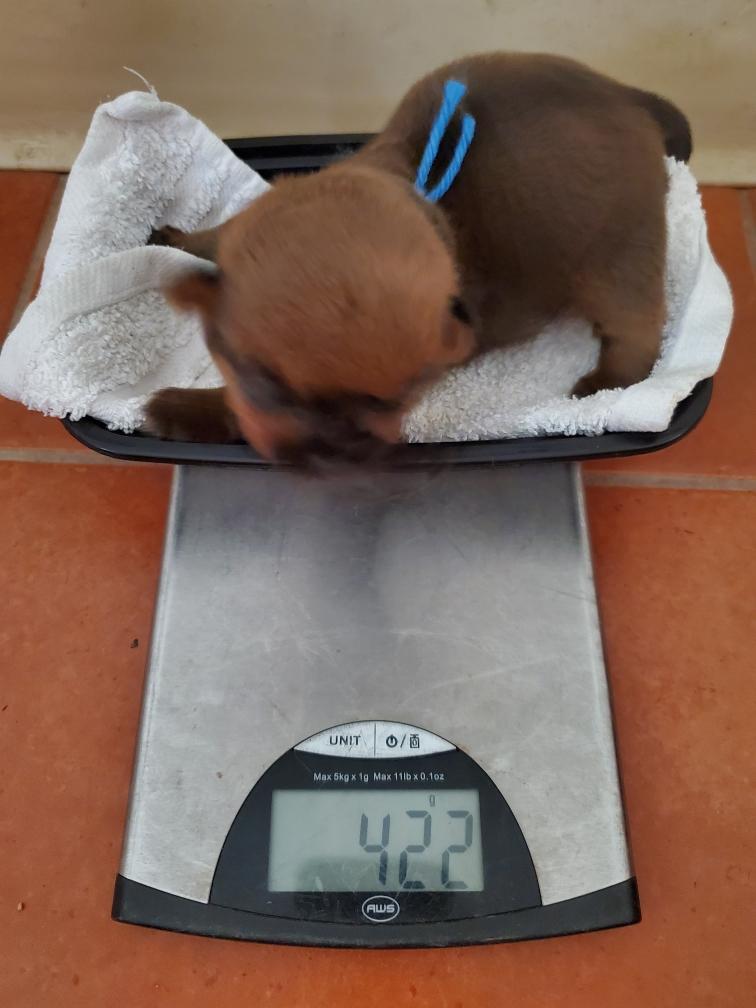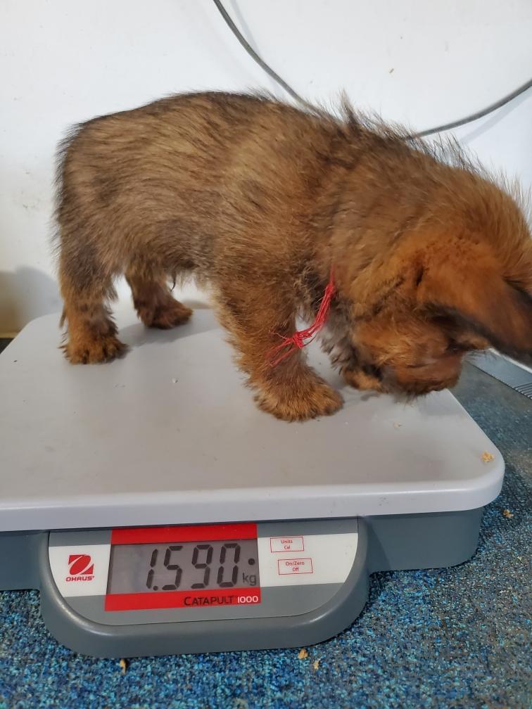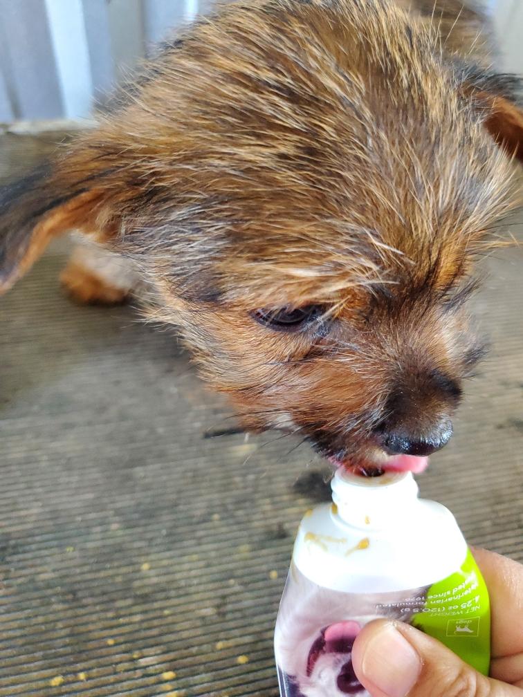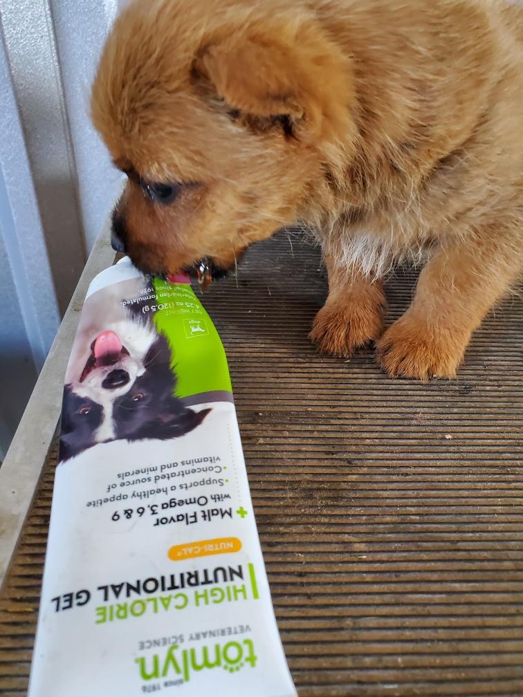 At this morning's weigh-in, Blue became the first to join the 200-gram club. But Pink lost weight and was again back to her birth weight. I did not want to leave Pink like this while I took Siri to NC State. I reluctantly tube-fed Pink 2 ml of Esbilic, a commercial canine milk substitute. Tube-feeding is just like it sounds. It is force-feeding where you put a tube down the dog's throat and into the stomach, then inject liquid food through the tube. Tube-feeding is not without risks. A dog can aspirate some of the liquid which can cause illness, or even drown if you have the tube in the lungs rather than the stomach.