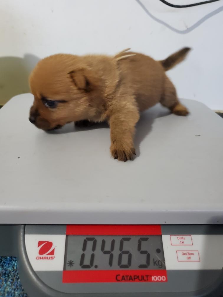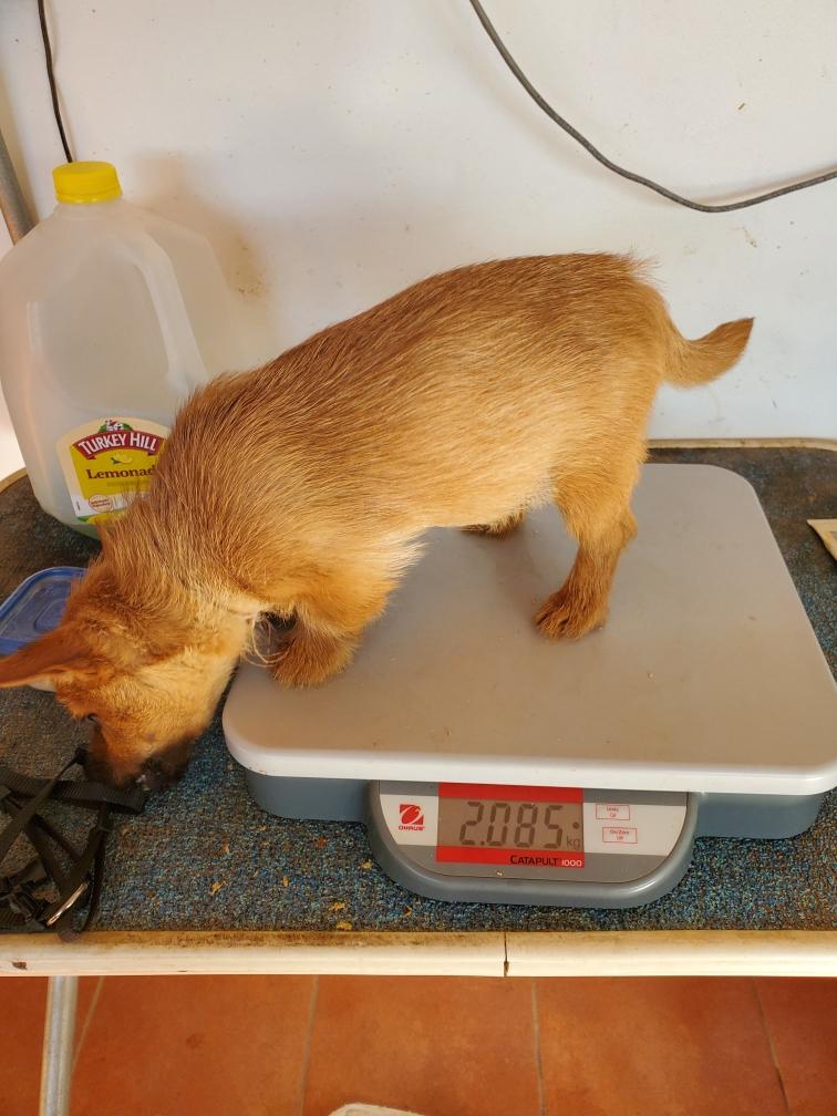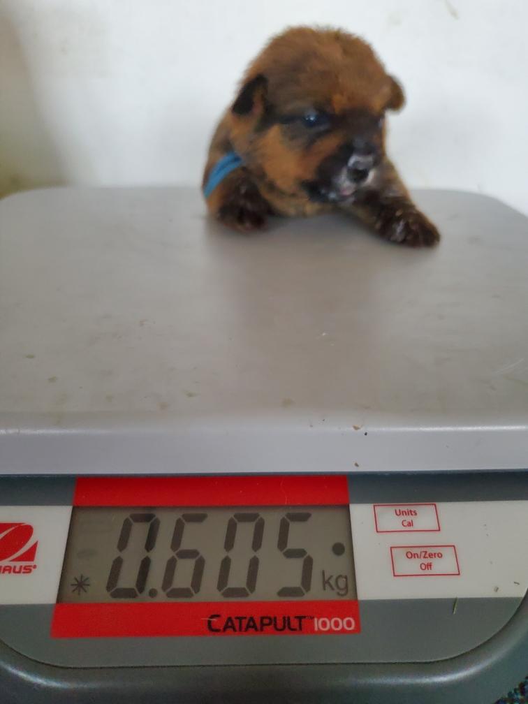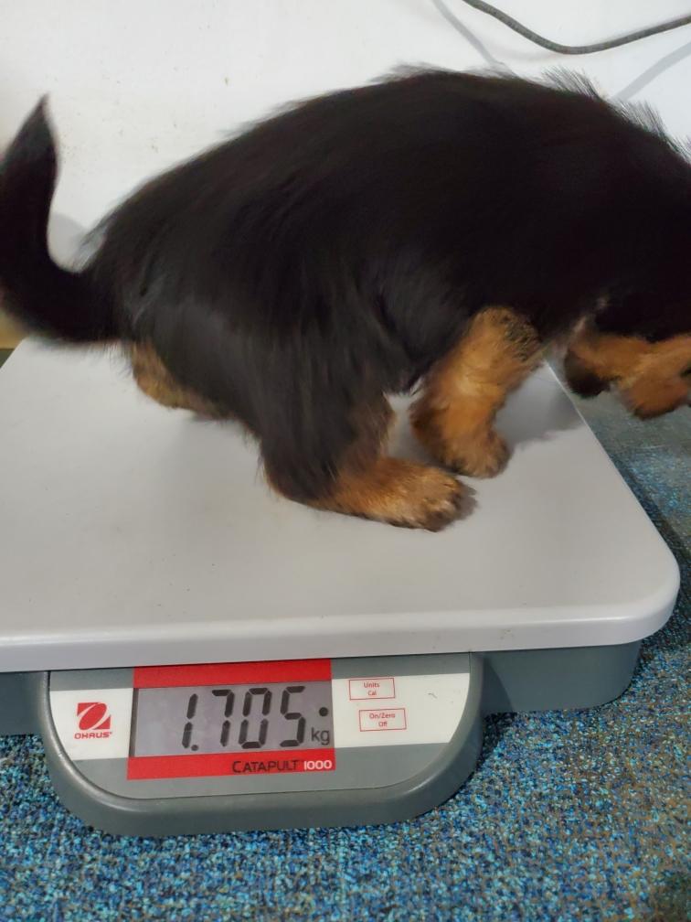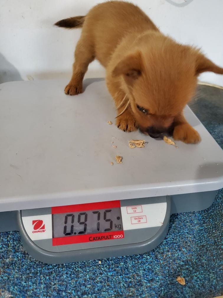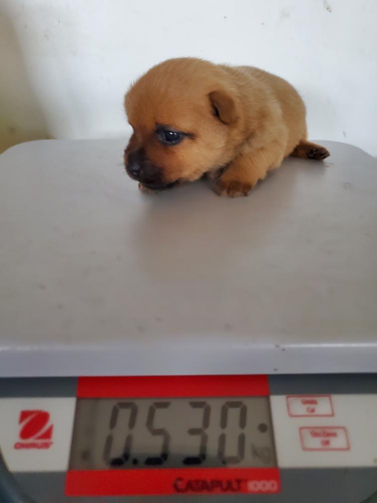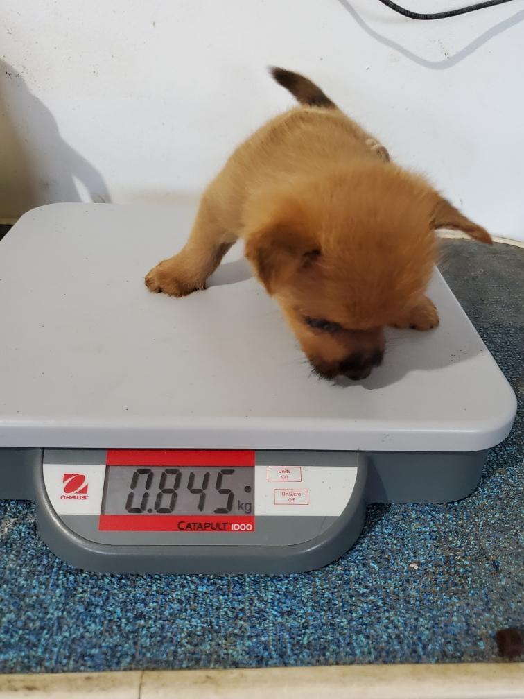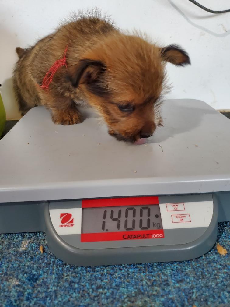 At this morning's weigh-in, Blue became the first to join the 200-gram club. But Pink lost weight and was again back to her birth weight. I did not want to leave Pink like this while I took Siri to NC State. I reluctantly tube-fed Pink 2 ml of Esbilic, a commercial canine milk substitute. Tube-feeding is just like it sounds. It is force-feeding where you put a tube down the dog's throat and into the stomach, then inject liquid food through the tube. Tube-feeding is not without risks. A dog can aspirate some of the liquid which can cause illness, or even drown if you have the tube in the lungs rather than the stomach.