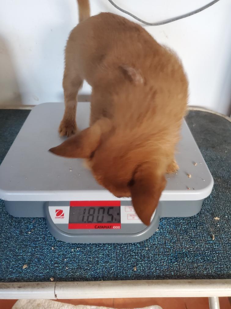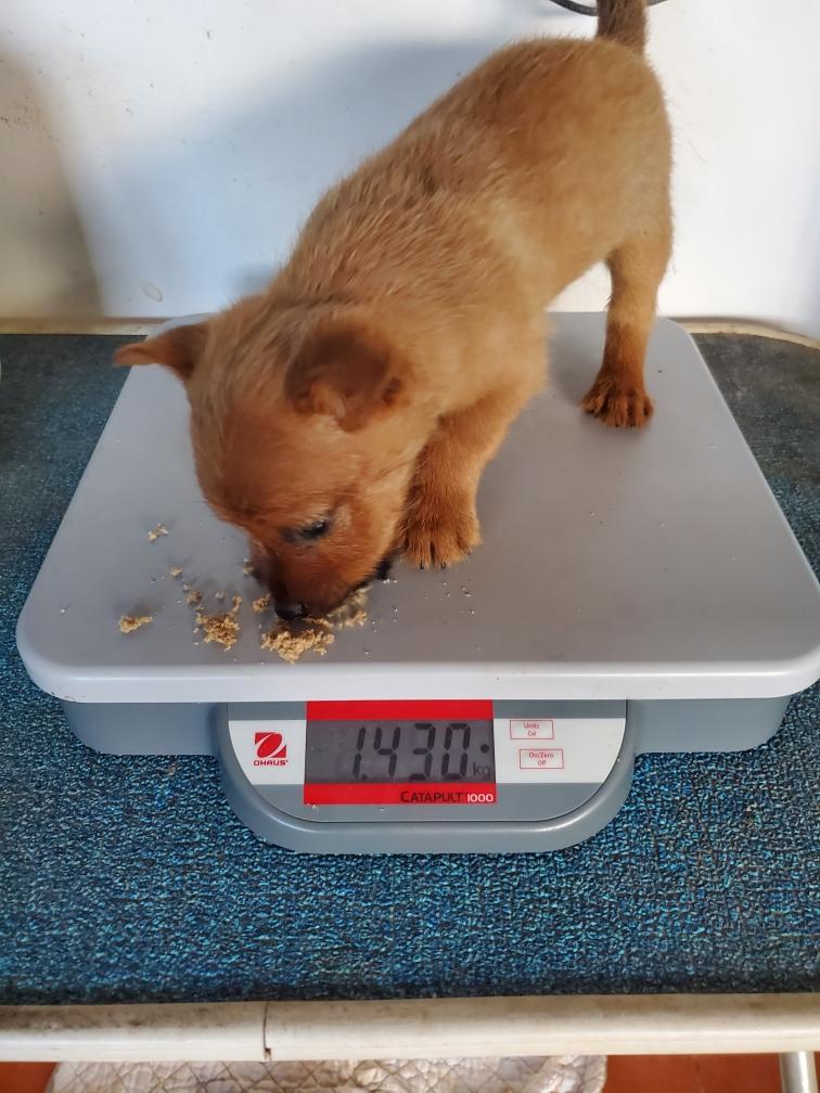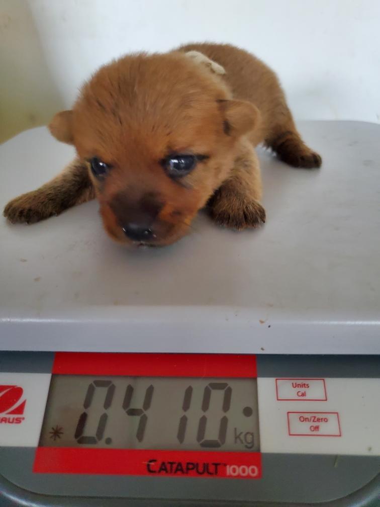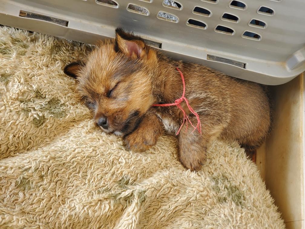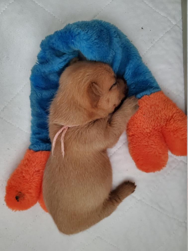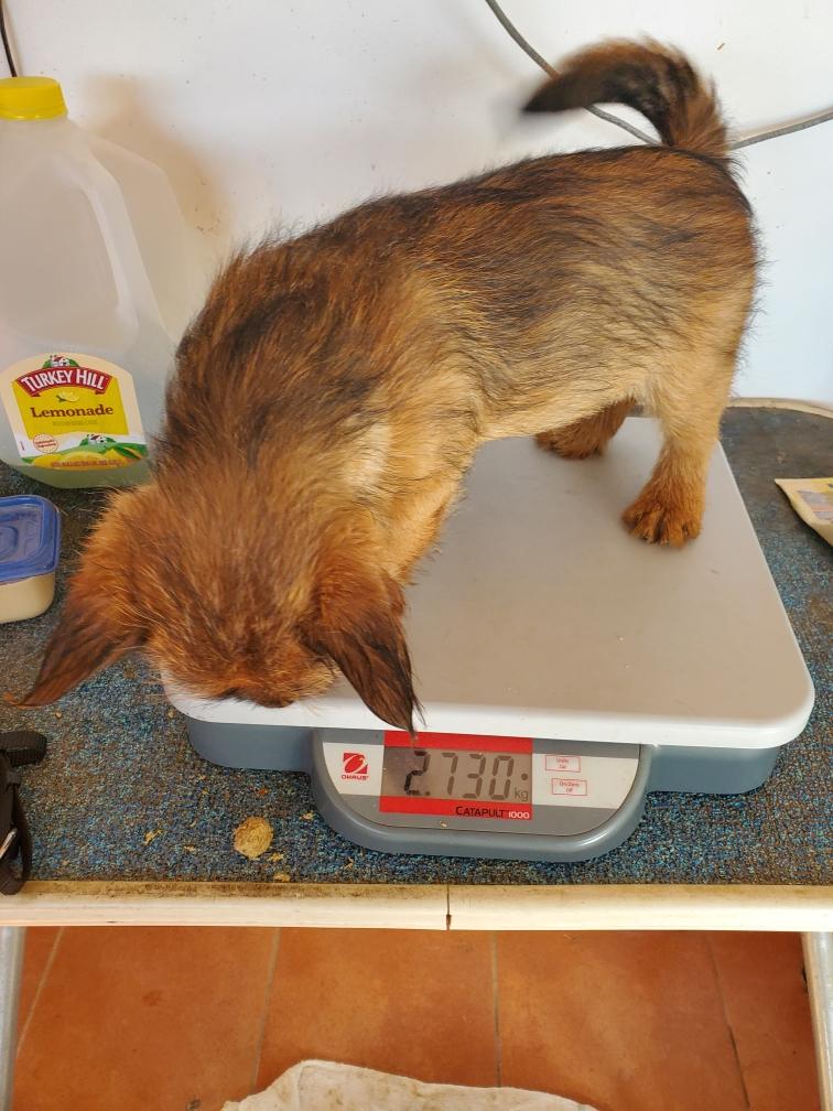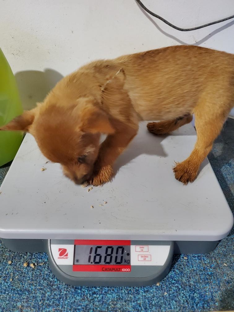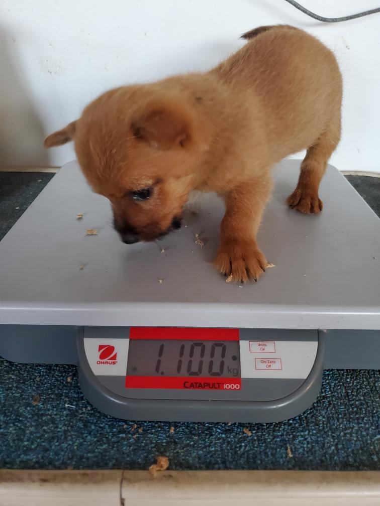 At this morning's weigh-in, Blue became the first to join the 200-gram club. But Pink lost weight and was again back to her birth weight. I did not want to leave Pink like this while I took Siri to NC State. I reluctantly tube-fed Pink 2 ml of Esbilic, a commercial canine milk substitute. Tube-feeding is just like it sounds. It is force-feeding where you put a tube down the dog's throat and into the stomach, then inject liquid food through the tube. Tube-feeding is not without risks. A dog can aspirate some of the liquid which can cause illness, or even drown if you have the tube in the lungs rather than the stomach.