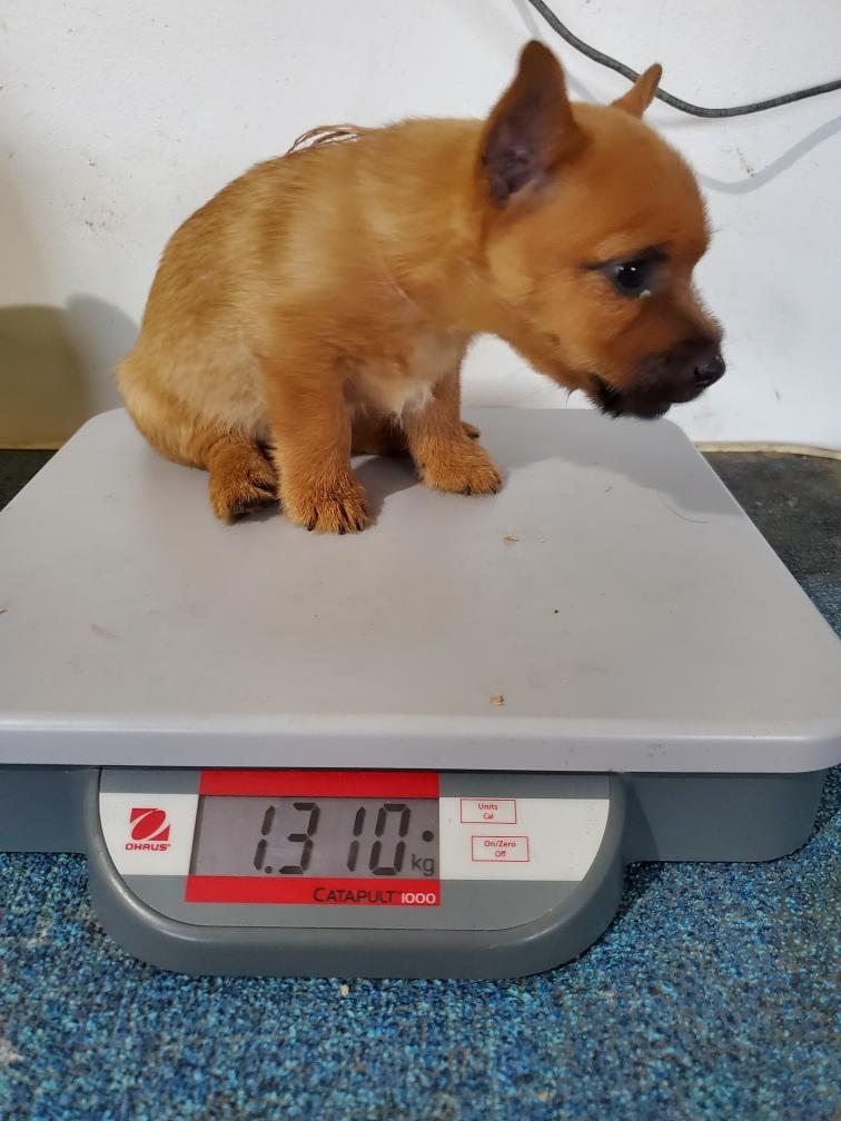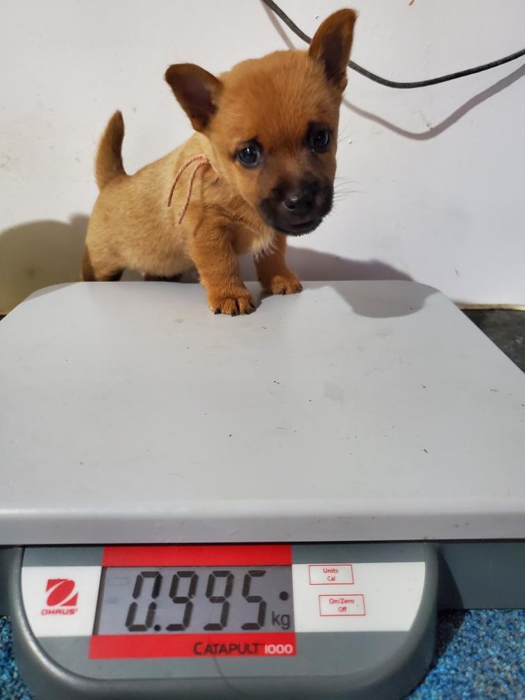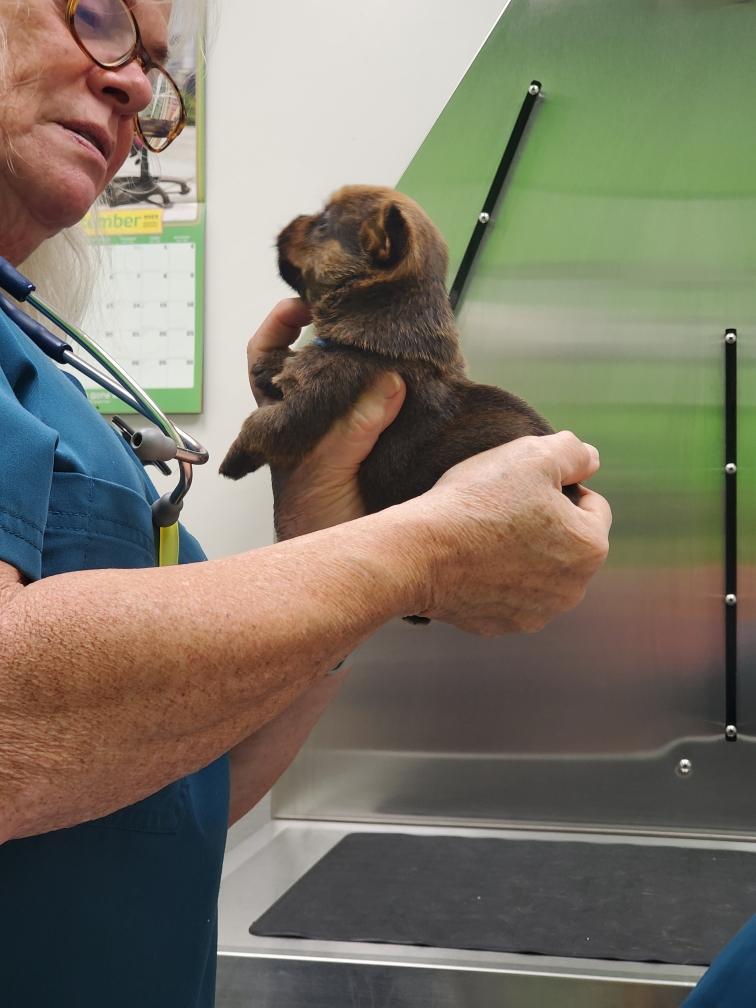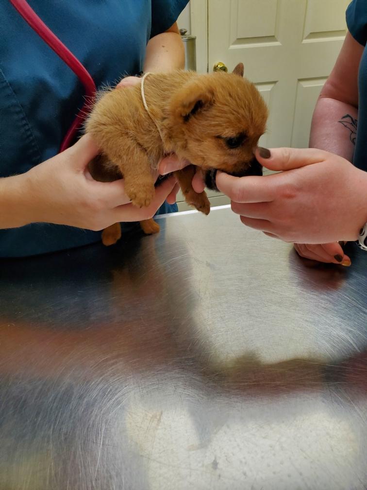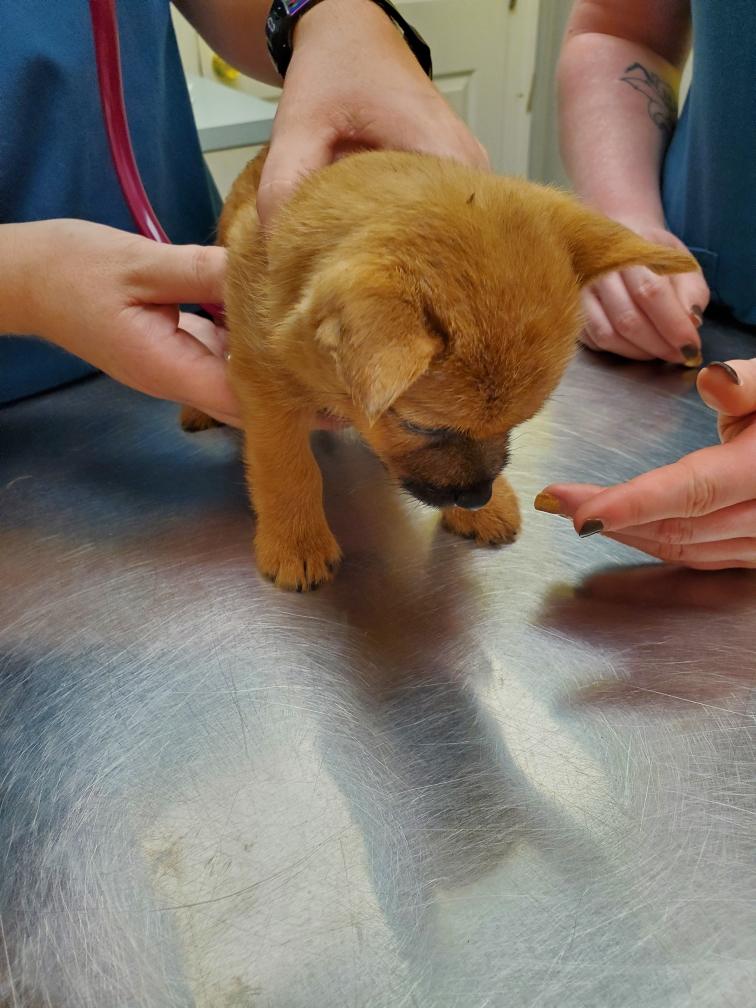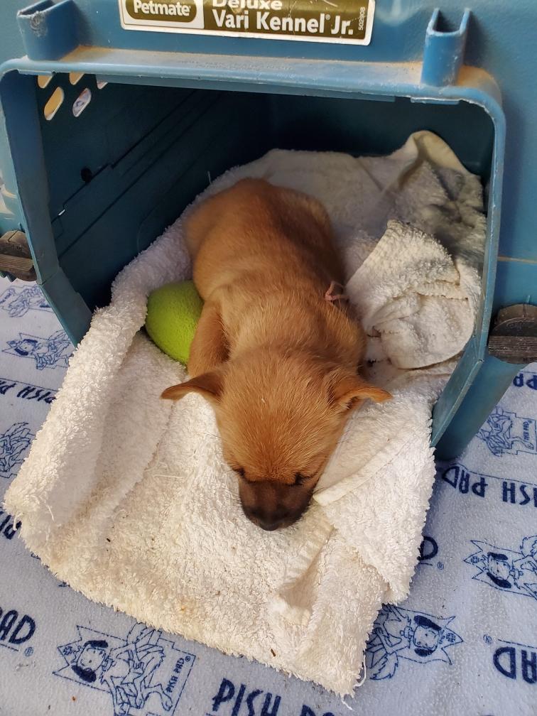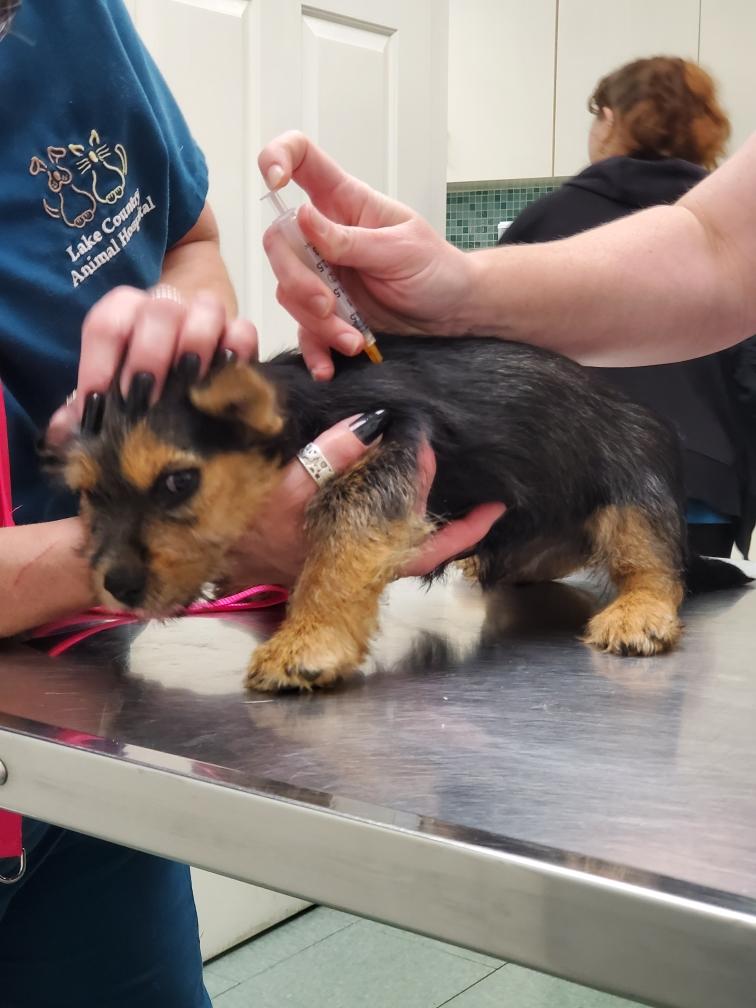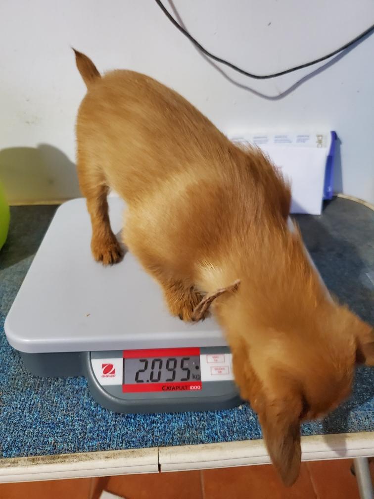 At this morning's weigh-in, Blue became the first to join the 200-gram club. But Pink lost weight and was again back to her birth weight. I did not want to leave Pink like this while I took Siri to NC State. I reluctantly tube-fed Pink 2 ml of Esbilic, a commercial canine milk substitute. Tube-feeding is just like it sounds. It is force-feeding where you put a tube down the dog's throat and into the stomach, then inject liquid food through the tube. Tube-feeding is not without risks. A dog can aspirate some of the liquid which can cause illness, or even drown if you have the tube in the lungs rather than the stomach.