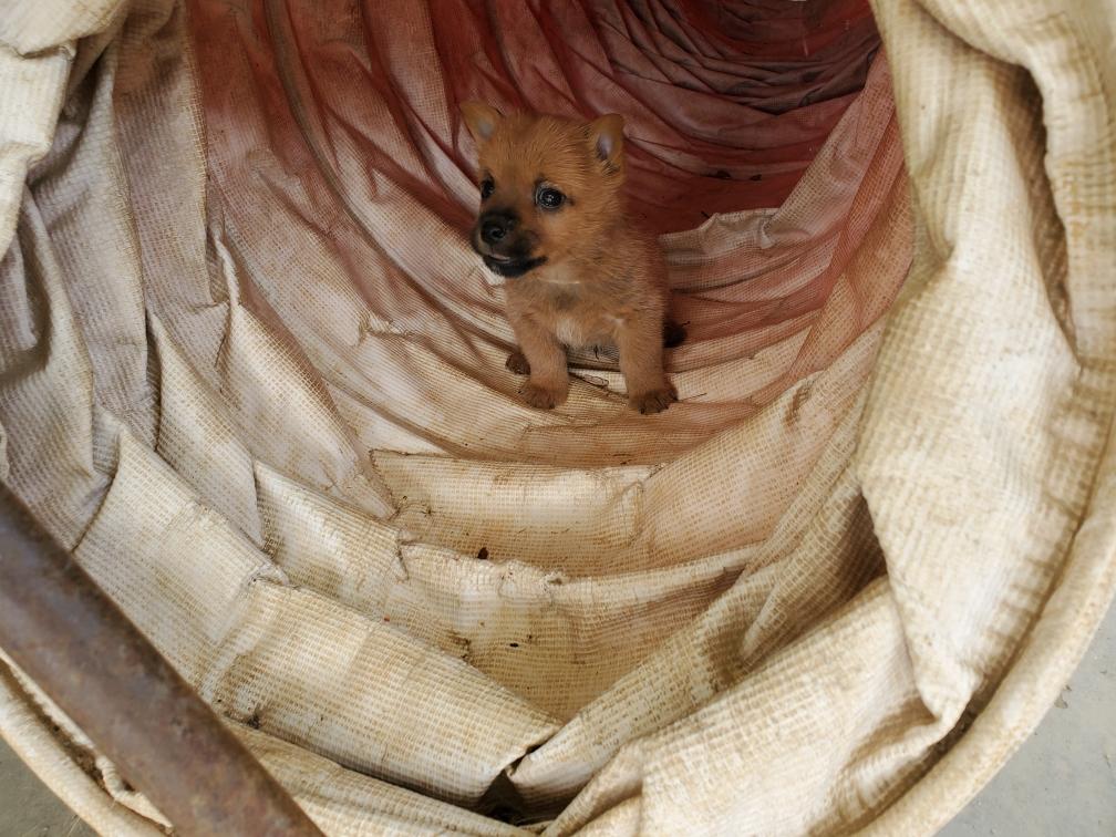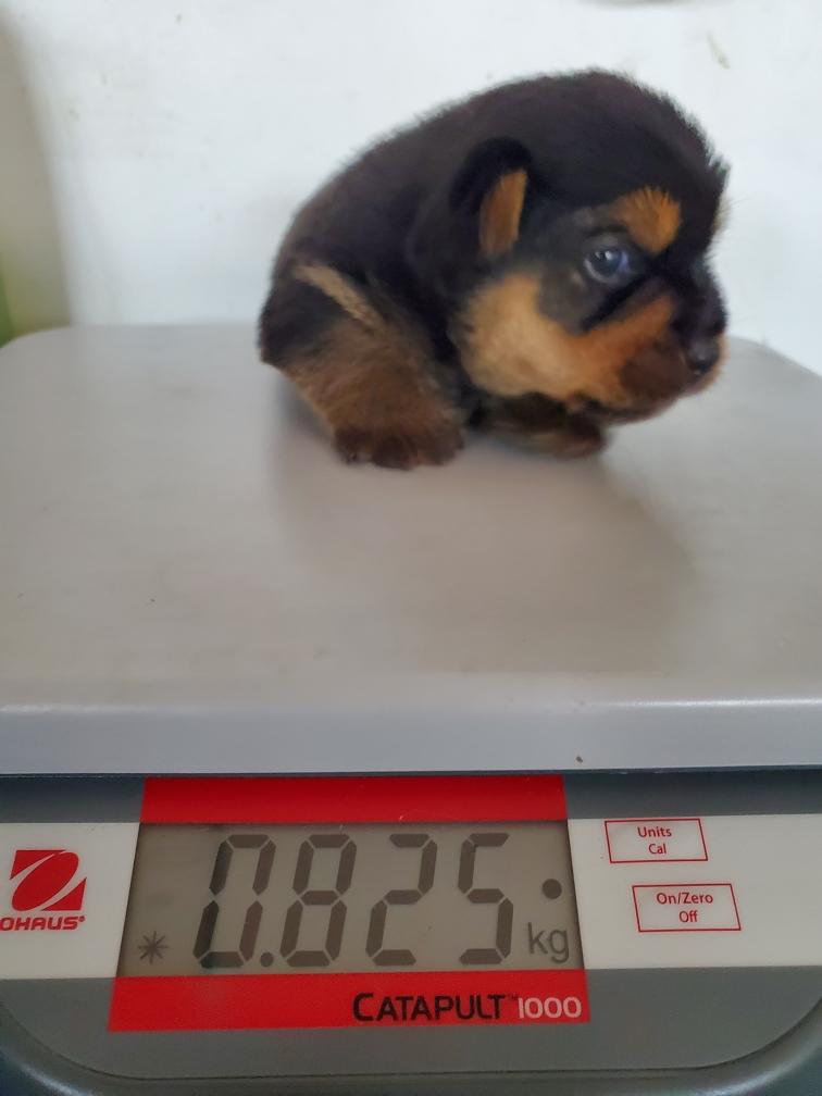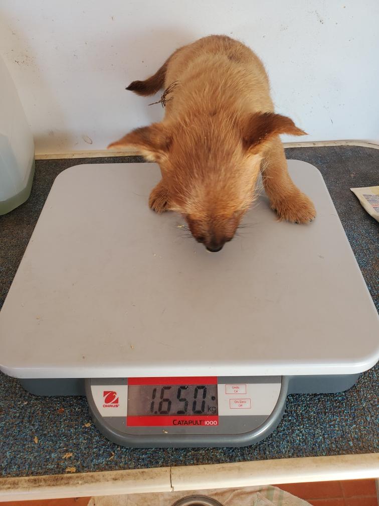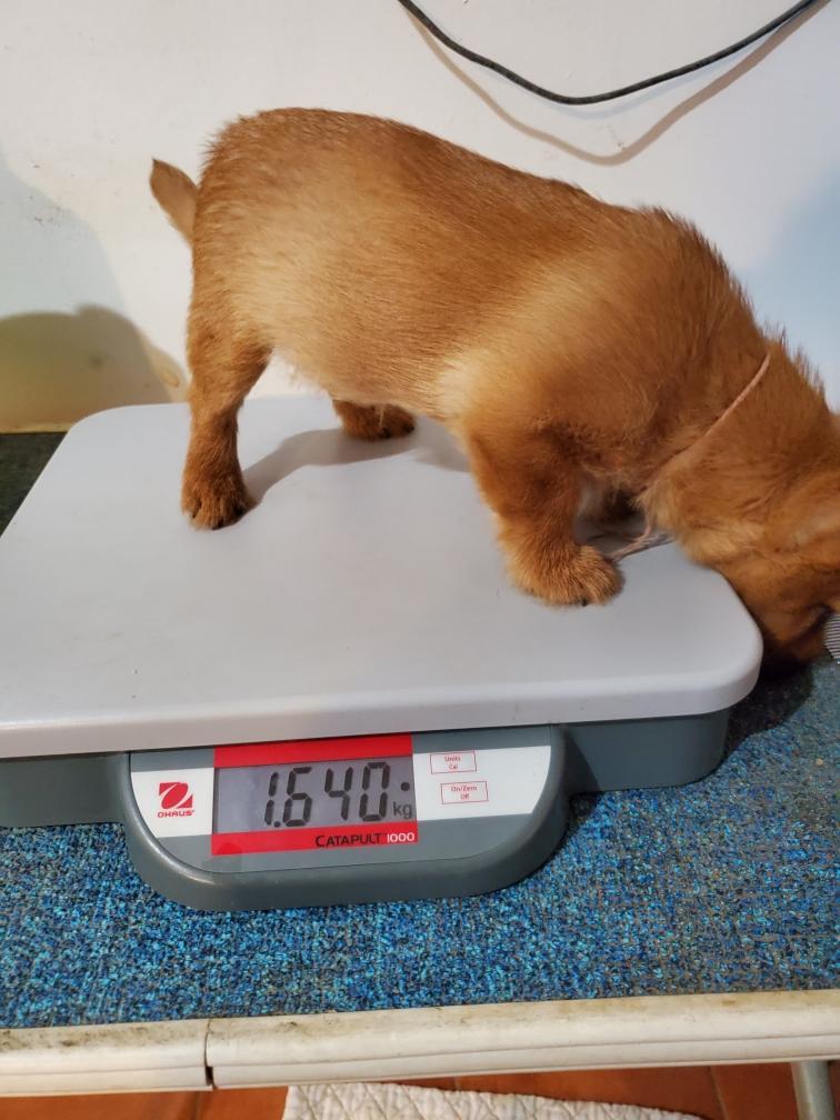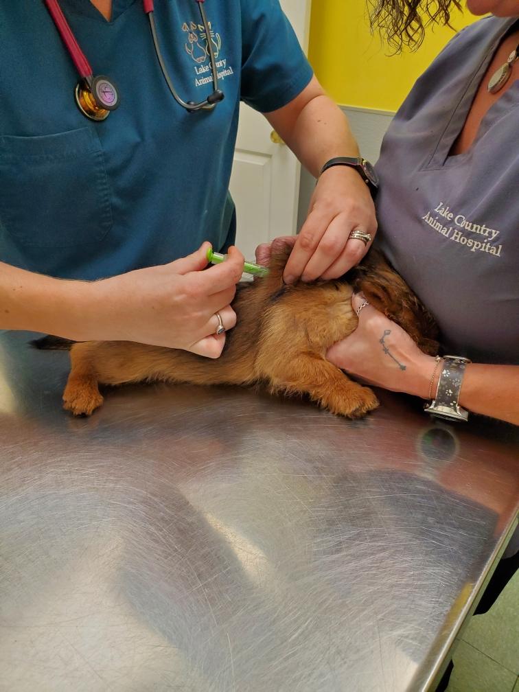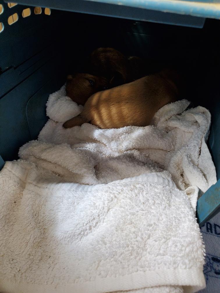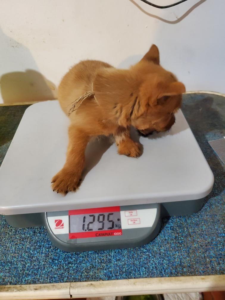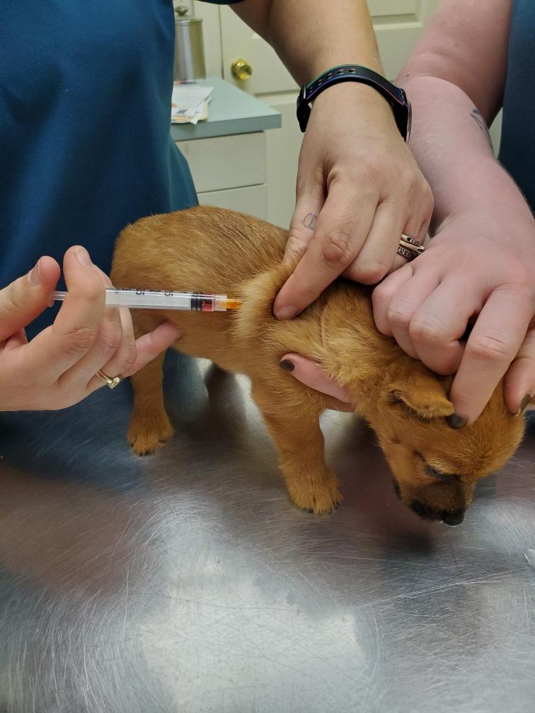 At this morning's weigh-in, Blue became the first to join the 200-gram club. But Pink lost weight and was again back to her birth weight. I did not want to leave Pink like this while I took Siri to NC State. I reluctantly tube-fed Pink 2 ml of Esbilic, a commercial canine milk substitute. Tube-feeding is just like it sounds. It is force-feeding where you put a tube down the dog's throat and into the stomach, then inject liquid food through the tube. Tube-feeding is not without risks. A dog can aspirate some of the liquid which can cause illness, or even drown if you have the tube in the lungs rather than the stomach.