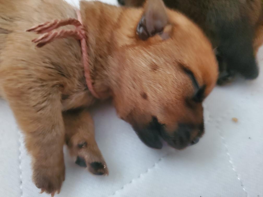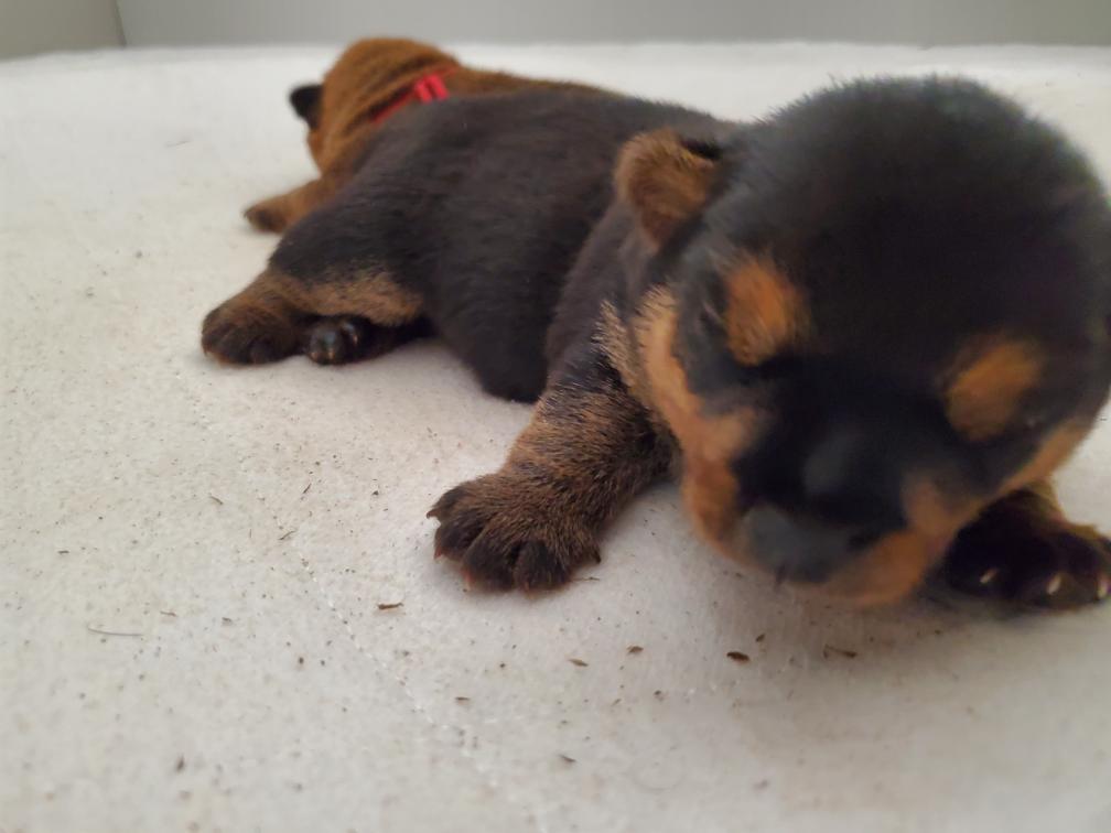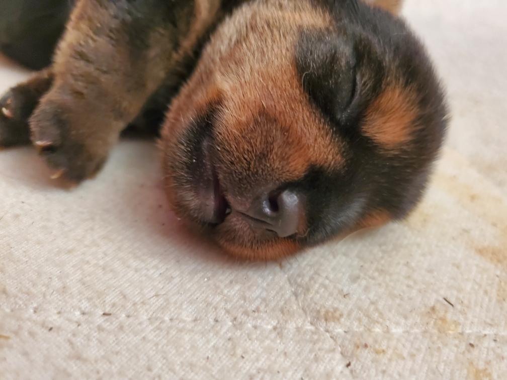 Black with his head on mommy Siri's paw. And a picture of Pink. Notice Pink's clear-colored nails. (Actually they are "claws". Nails are flat while claws are round, but we traditionally call a dog's claws "nails".) All the puppies have clear nails which will darken over the next week or so and turn black.
