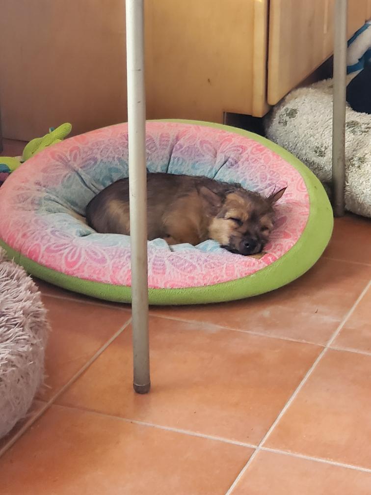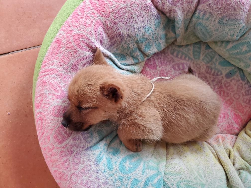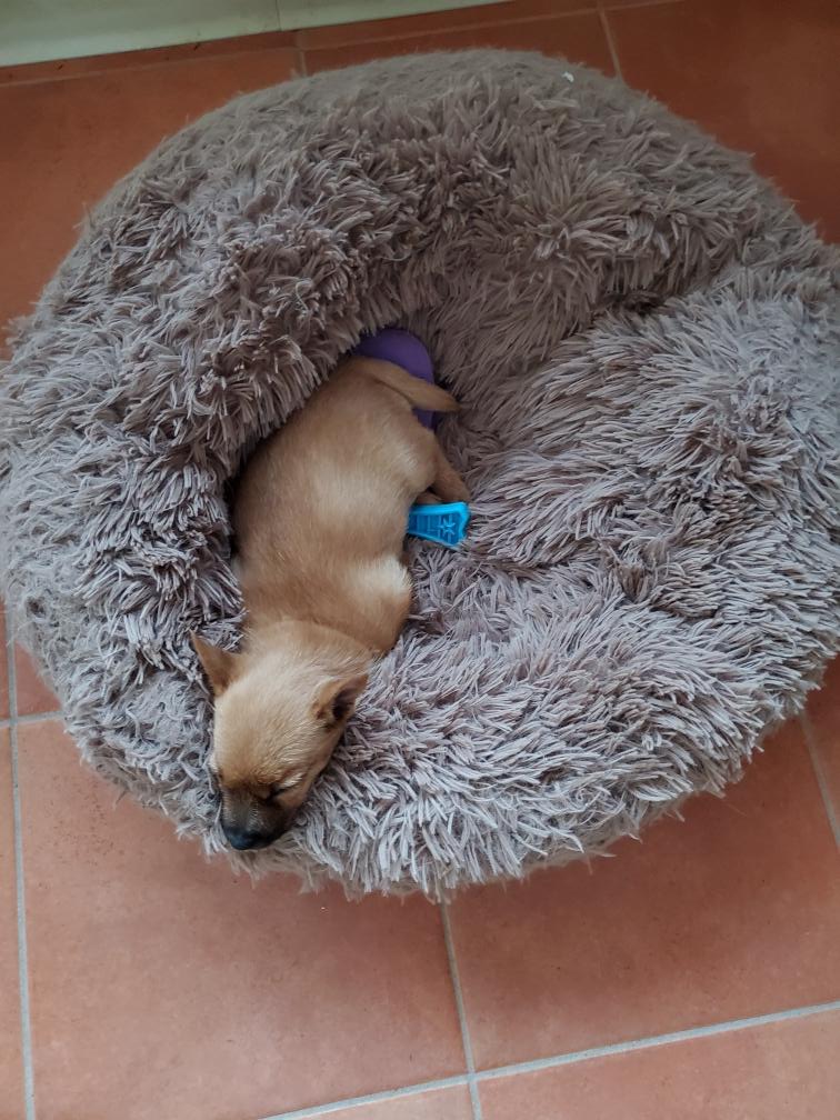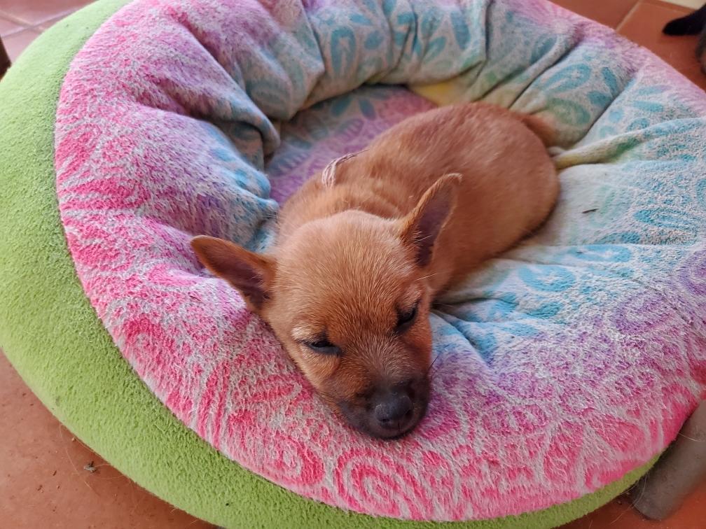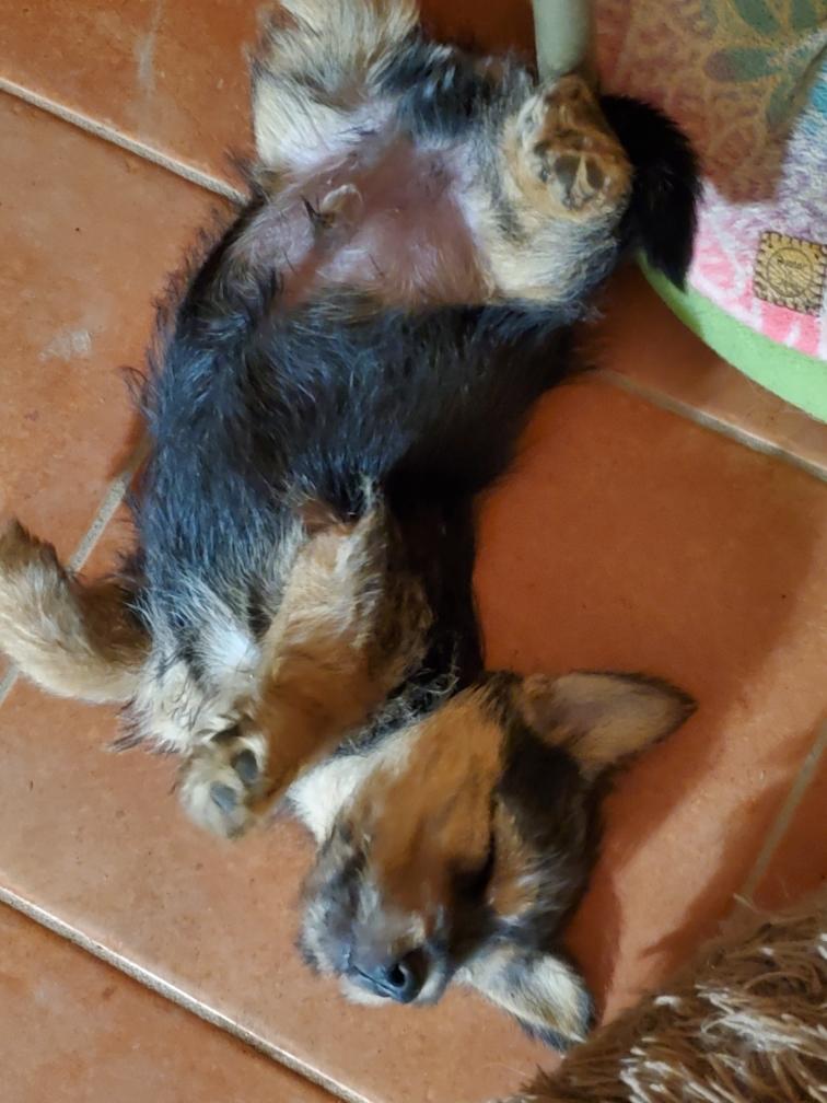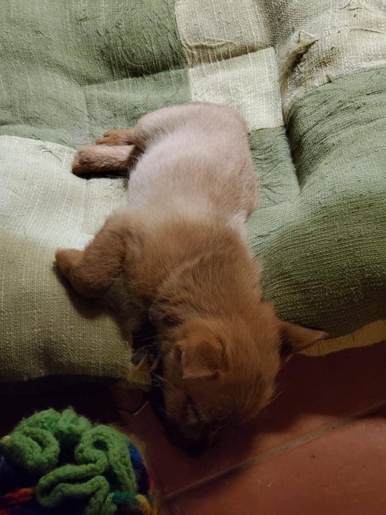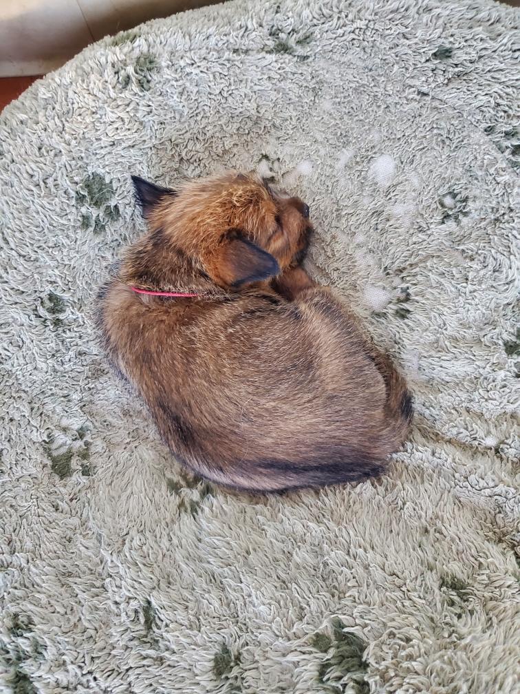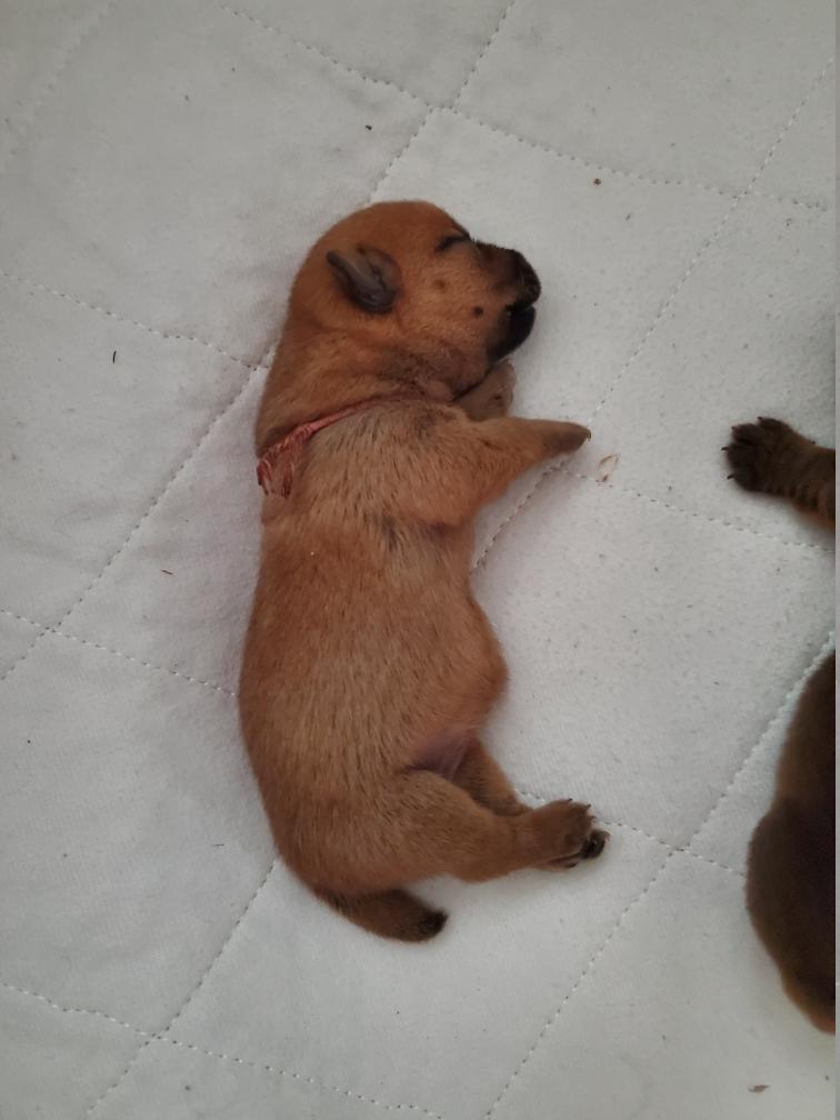 Pink napping on her back. And later showing off her new collar as her old collar had gotten dirty and tight.