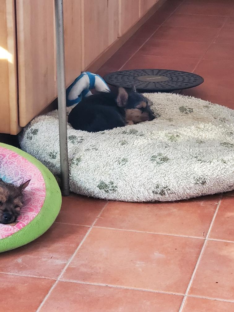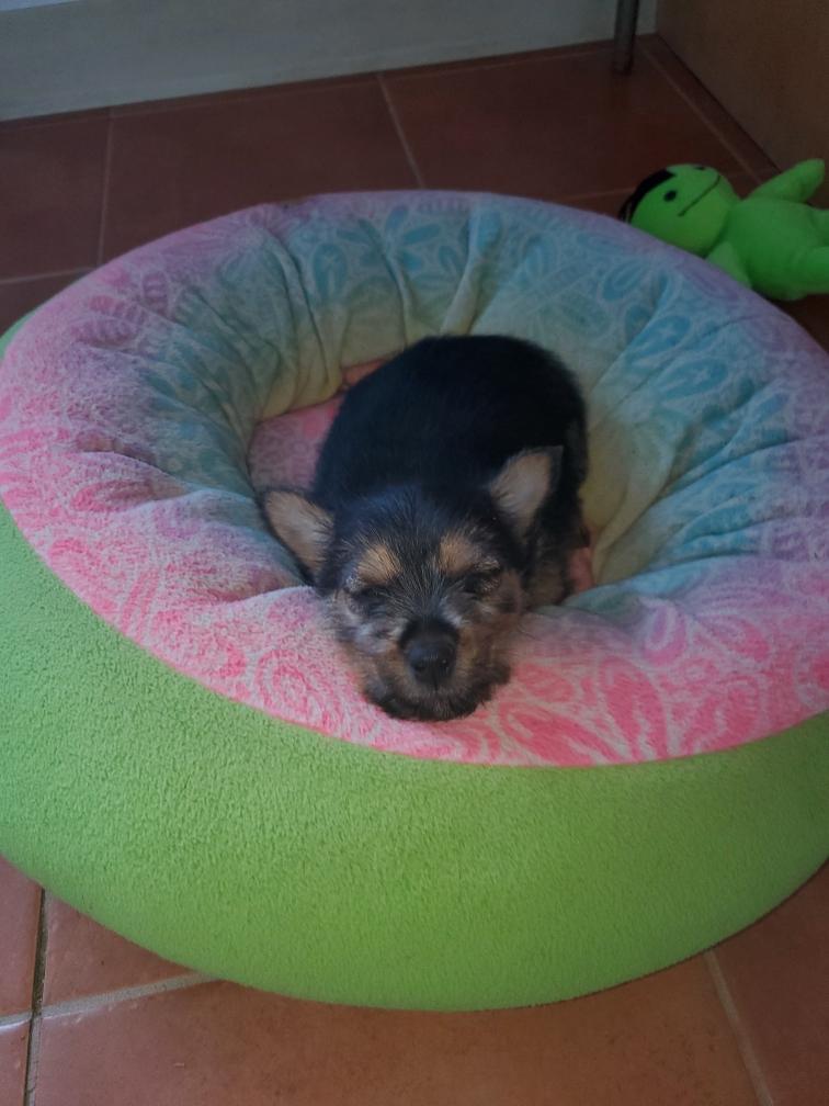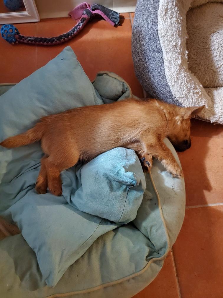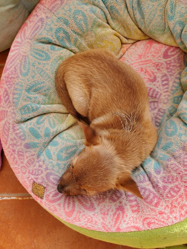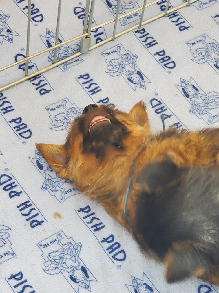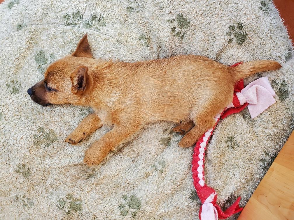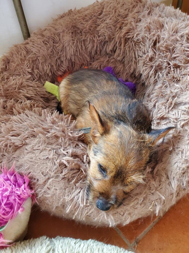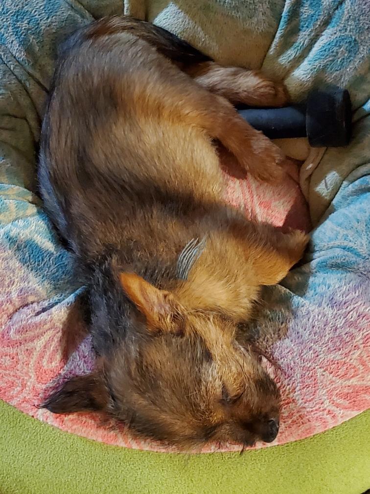 Pink napping on her back. And later showing off her new collar as her old collar had gotten dirty and tight.