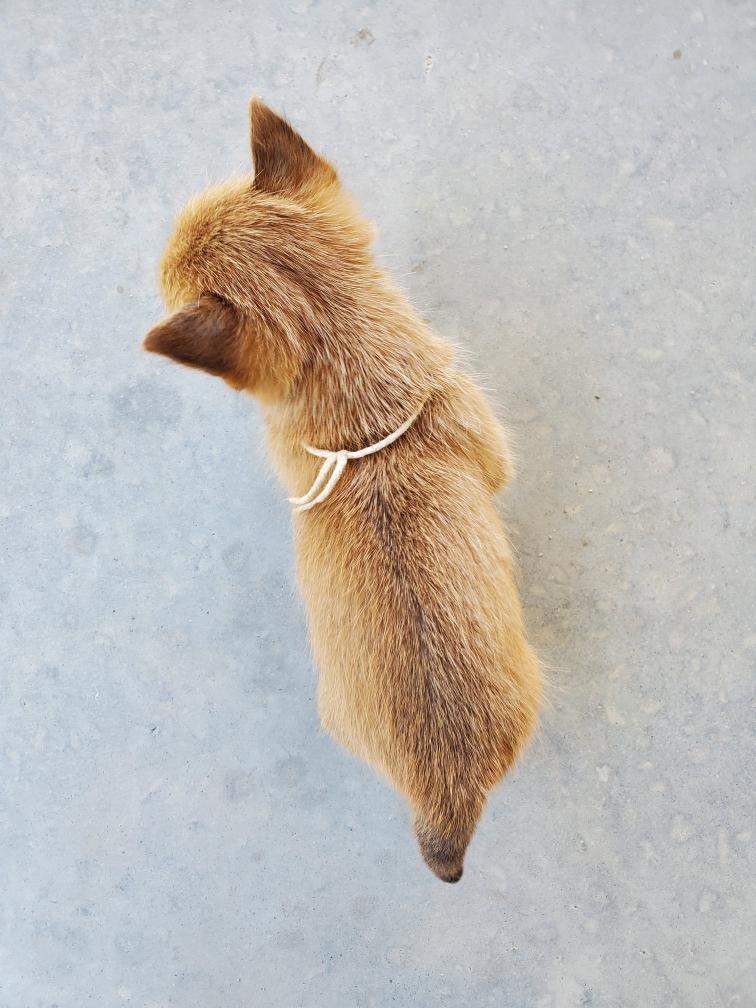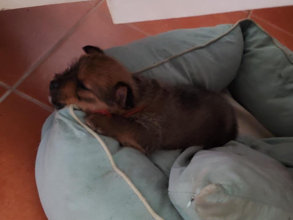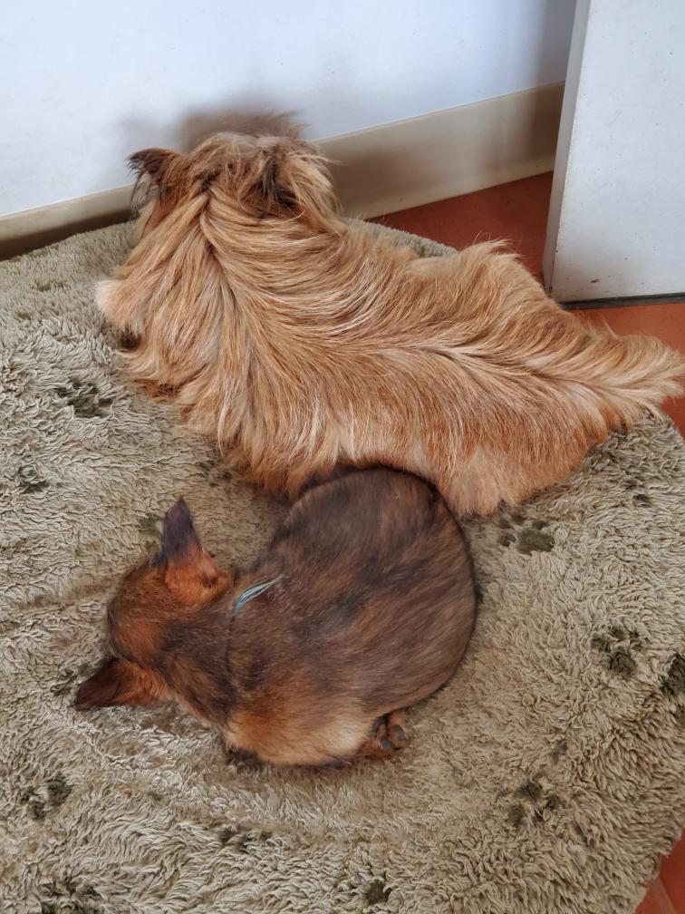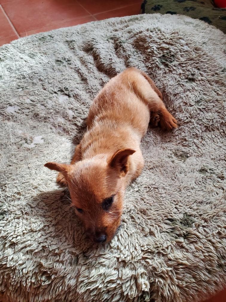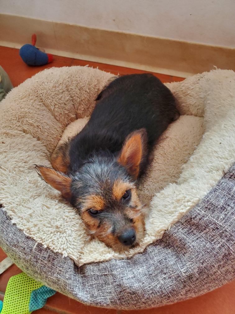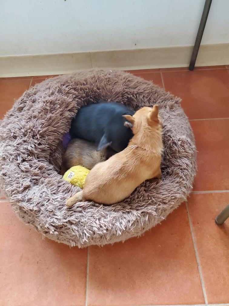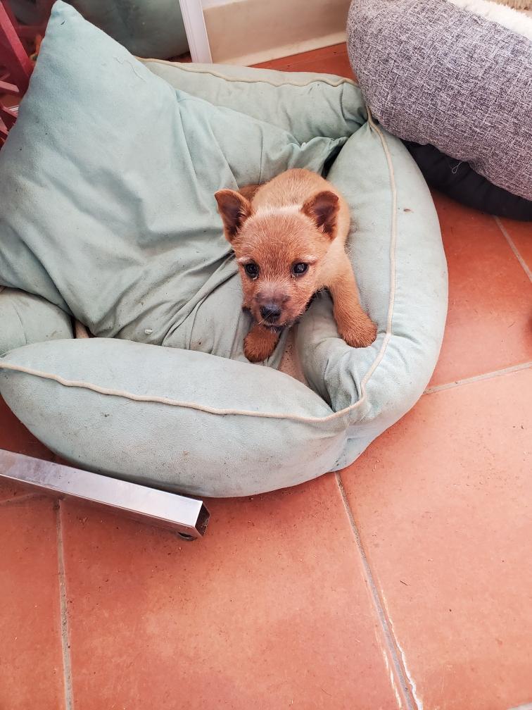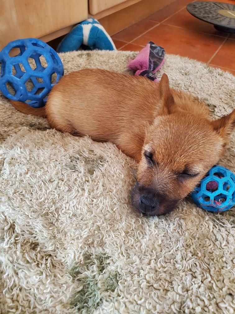 Pink napping on her back. And later showing off her new collar as her old collar had gotten dirty and tight.
