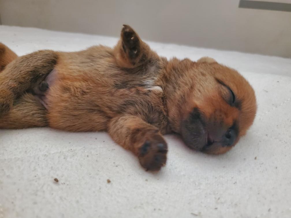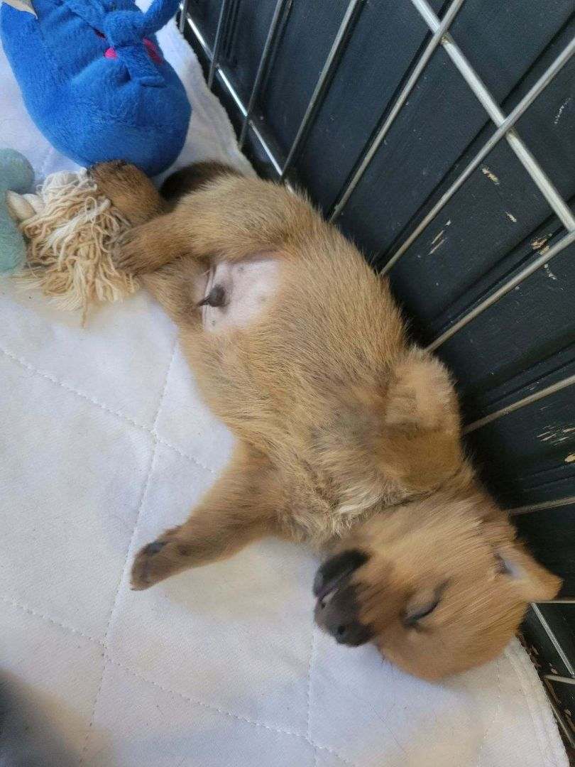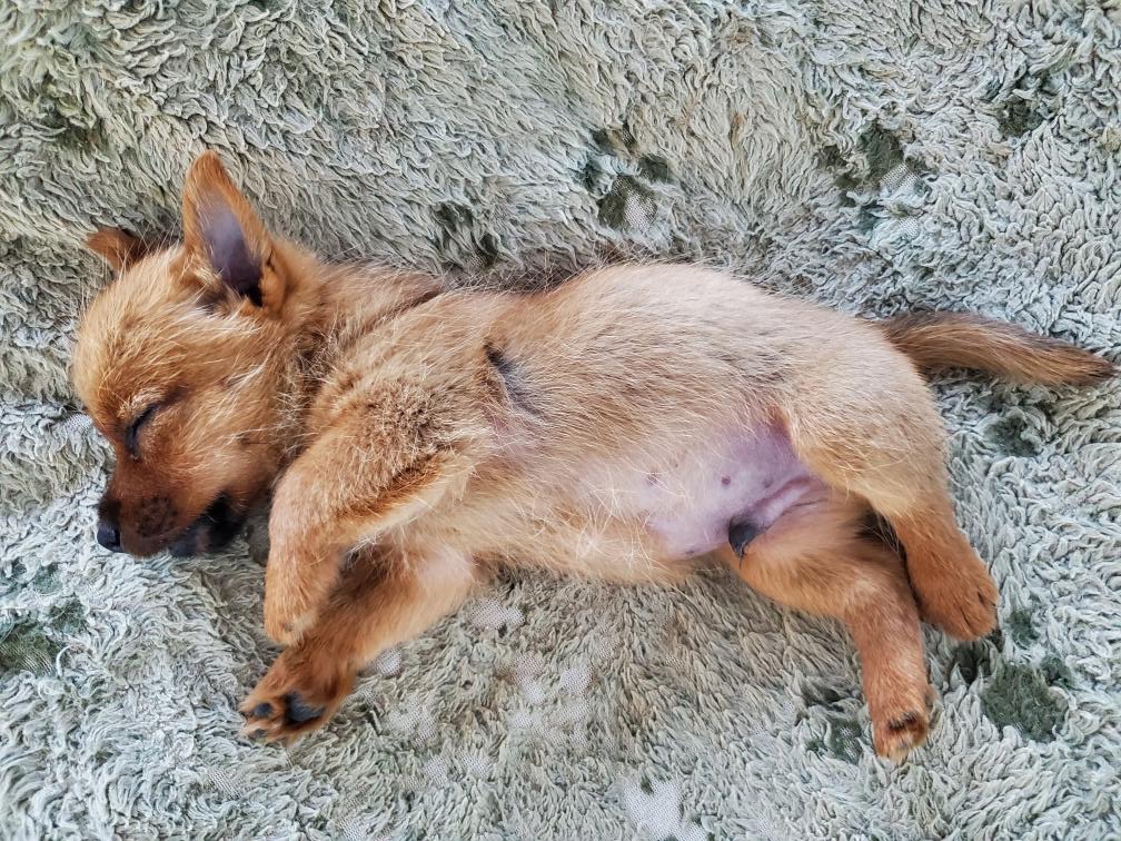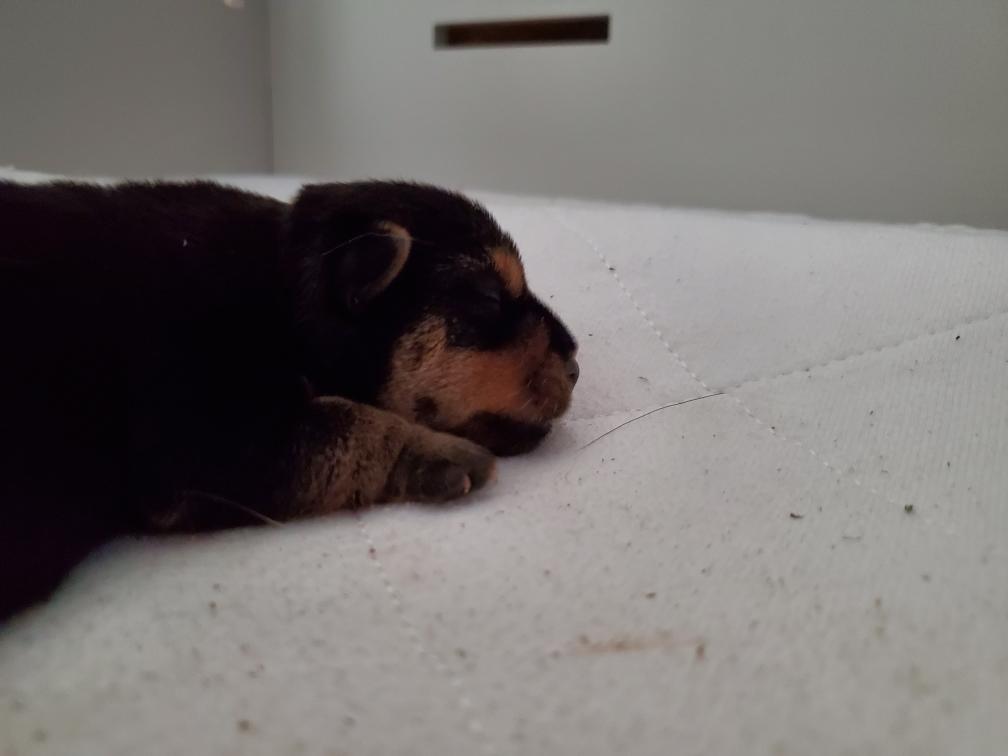 White sleeping on his side. I like to see a puppy sleep on their side. If a puppy sleeps too much on their chest, the rib bones can grow into the wrong shape (flattened rather than round), which can later make it hard for a puppy to learn to walk.