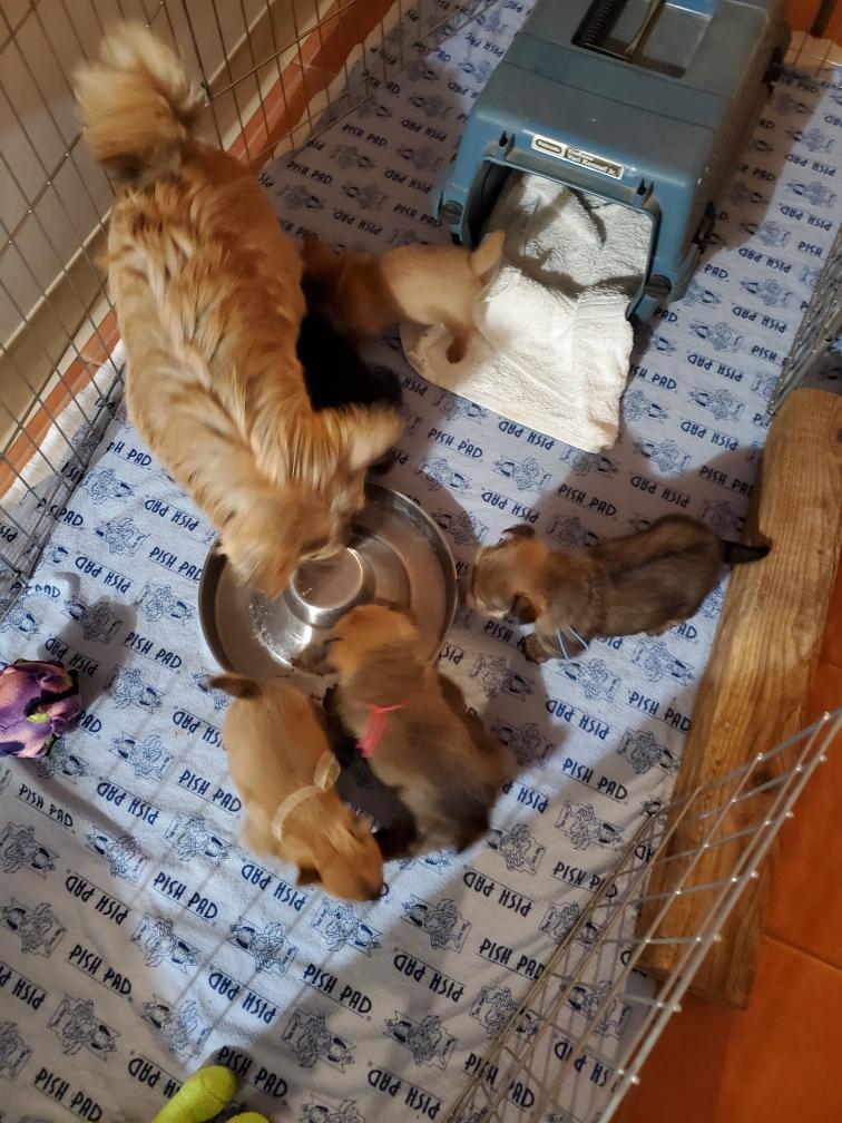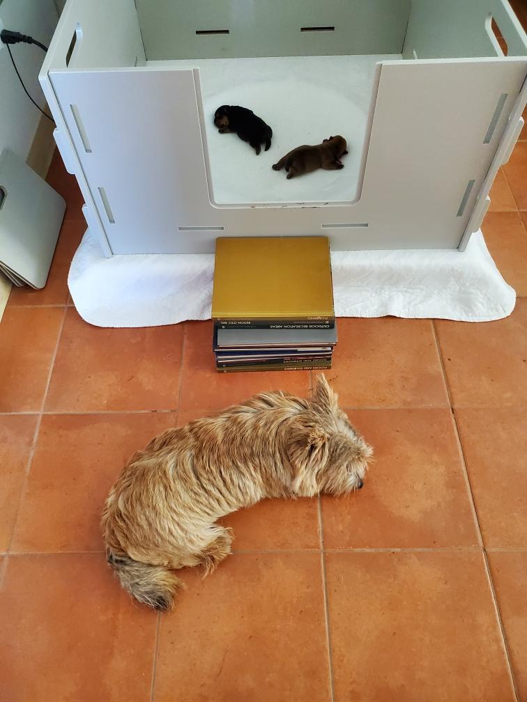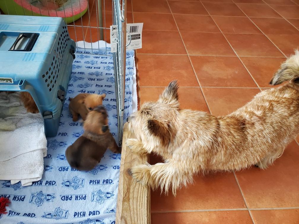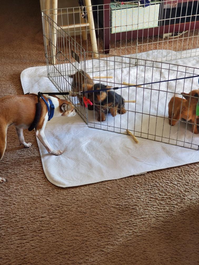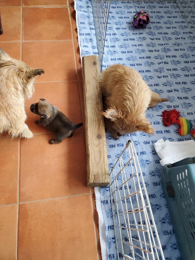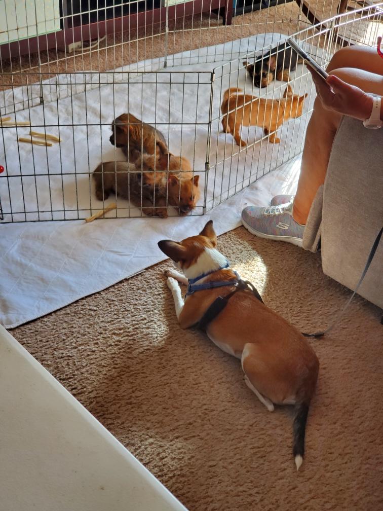 Gwynie is spending less time in the whelping box. But Gywnie is usually not far away from her puppies.