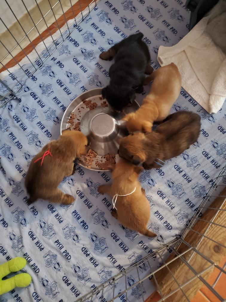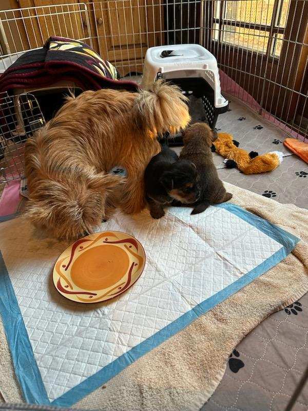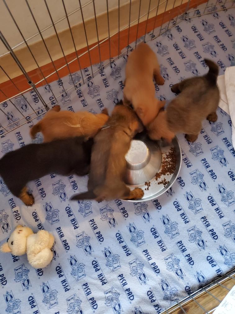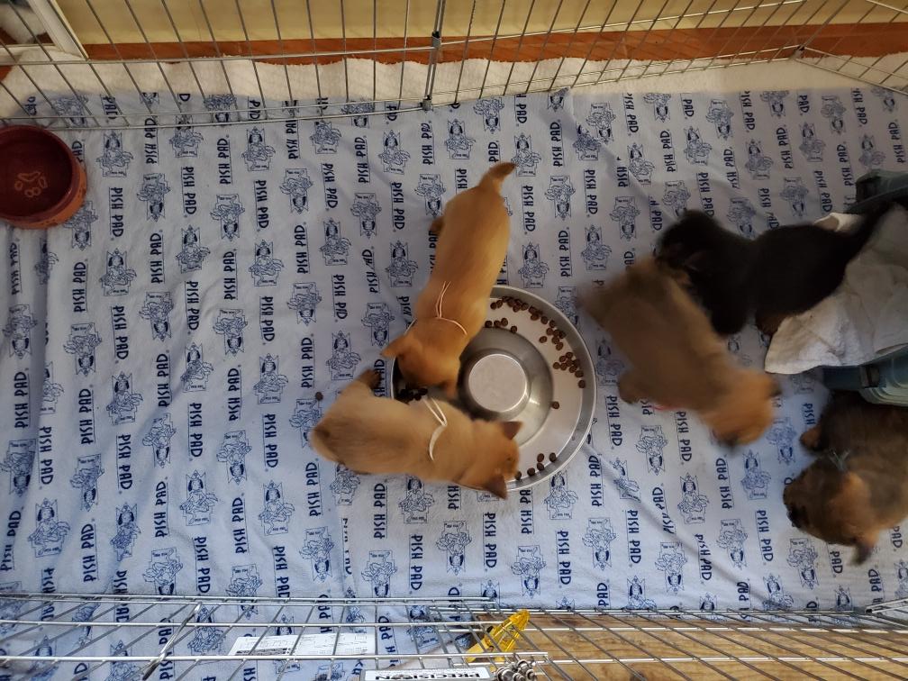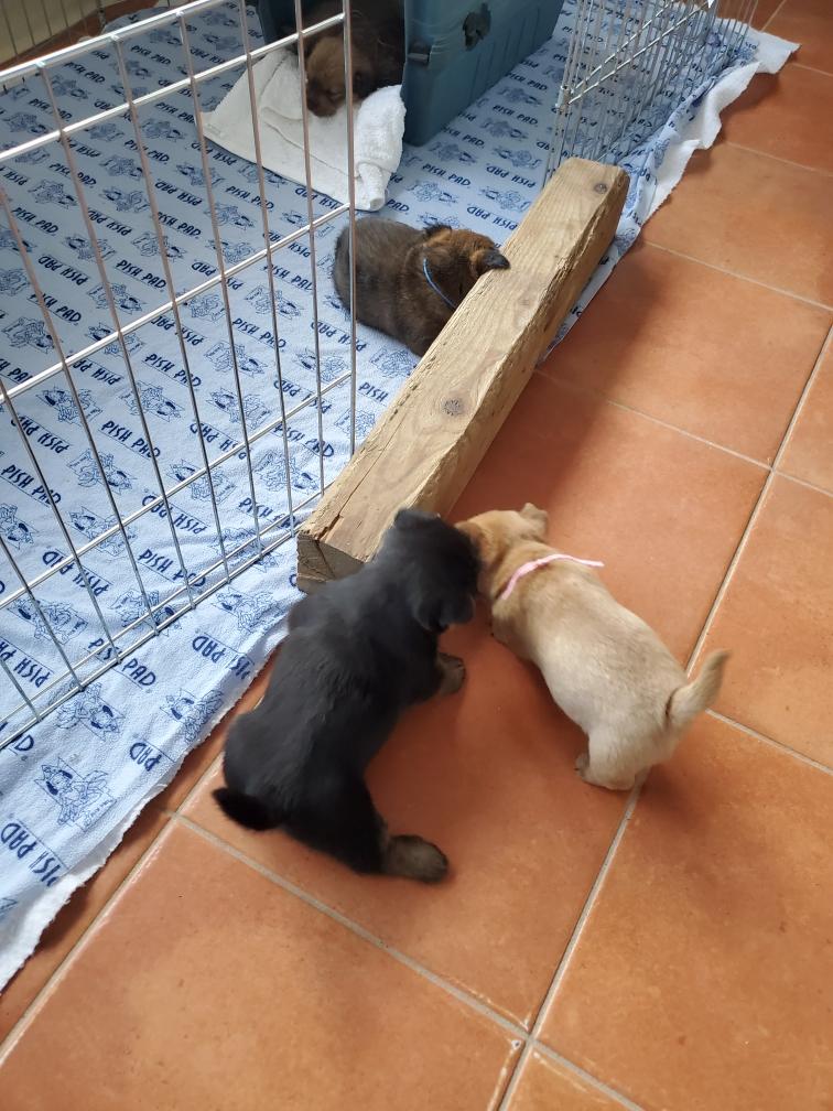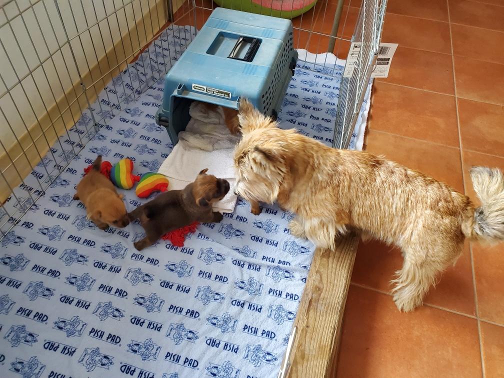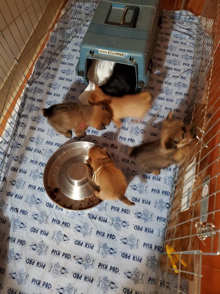 Gwynie is spending less time in the whelping box. But Gywnie is usually not far away from her puppies.