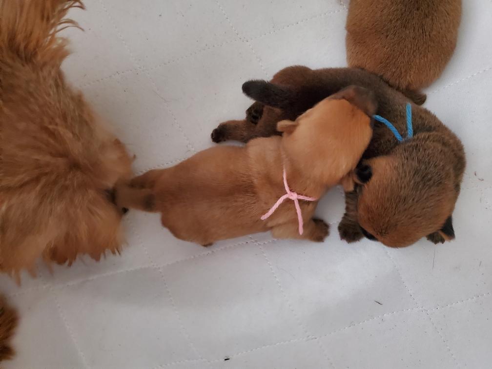 After getting everyone settled and feeding Siri and Gwynie dinner, my next job was to put collars on the puppies in order to tell them apart at a glance. I use colored yarn for collars. I also needed to weigh the puppies. Here are the puppies:
