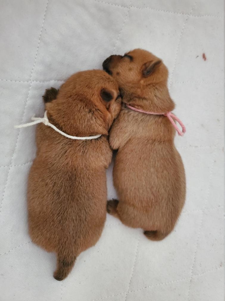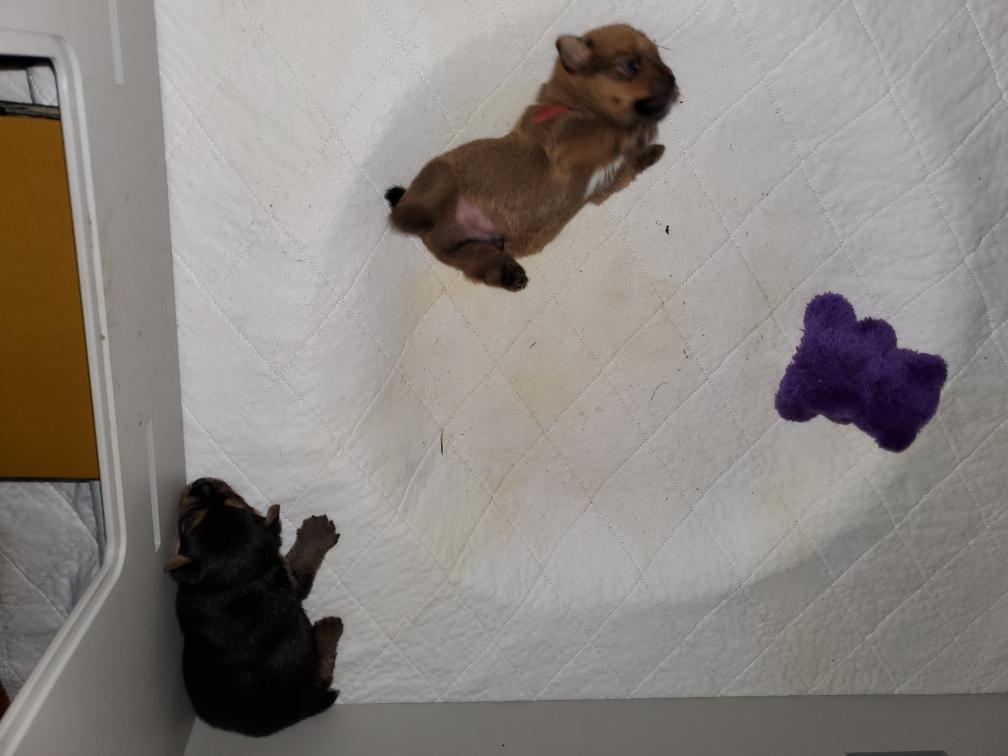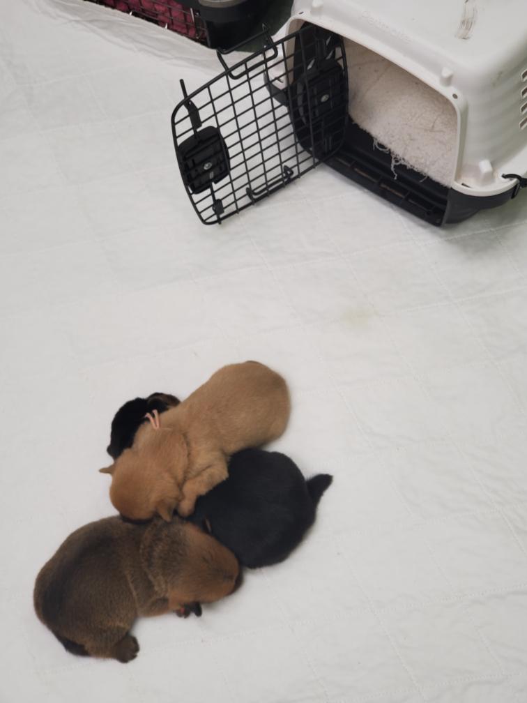 When Siri and I got home, Gwynie came out of her whelping box to greet us, leaving her puppies in the heated whelping nest. White is using sister Pink as a pillow. White has also gotten his collar dirty.