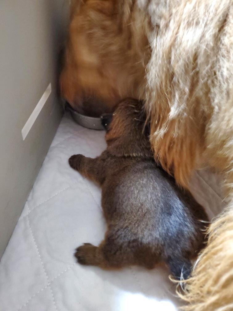 Around four this afternoon, Gwynie came out of the whelping box and went outside to pee and poop. Other than when I took Gwynie out of the whelping box to weigh her and take her temperature, this was the first time Gwynie had left the puppies since we got home yesterday. I have been acting as Gwynie's butler, bringing Gwynie food and water to eat and drink in the whelping box.