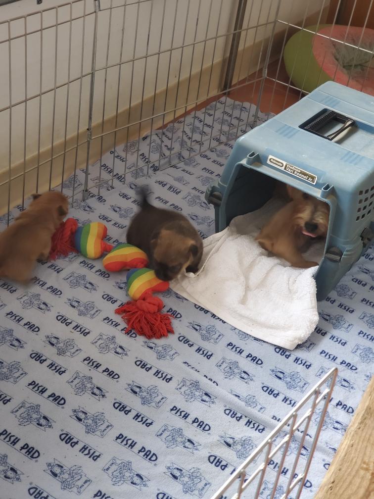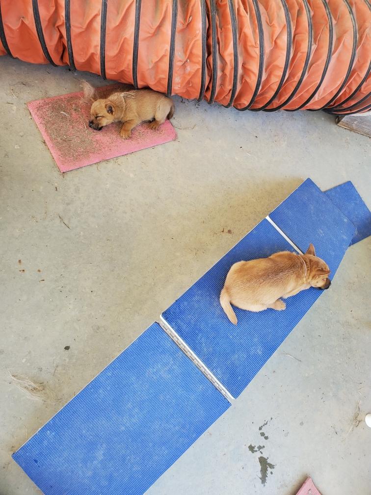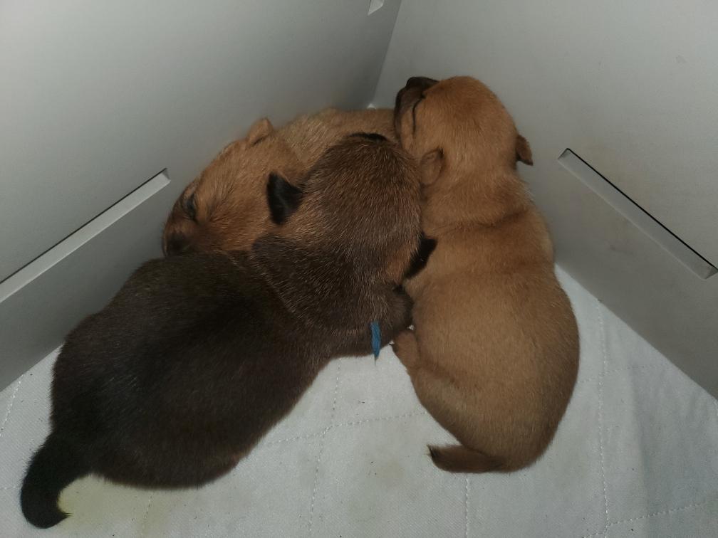 The puppies are starting to use the heated whelping nest, rather than just sleeping underneath mommy Gwynie. Here are Blue and White in the nest, Pink is tucked up underneath Gwynie.