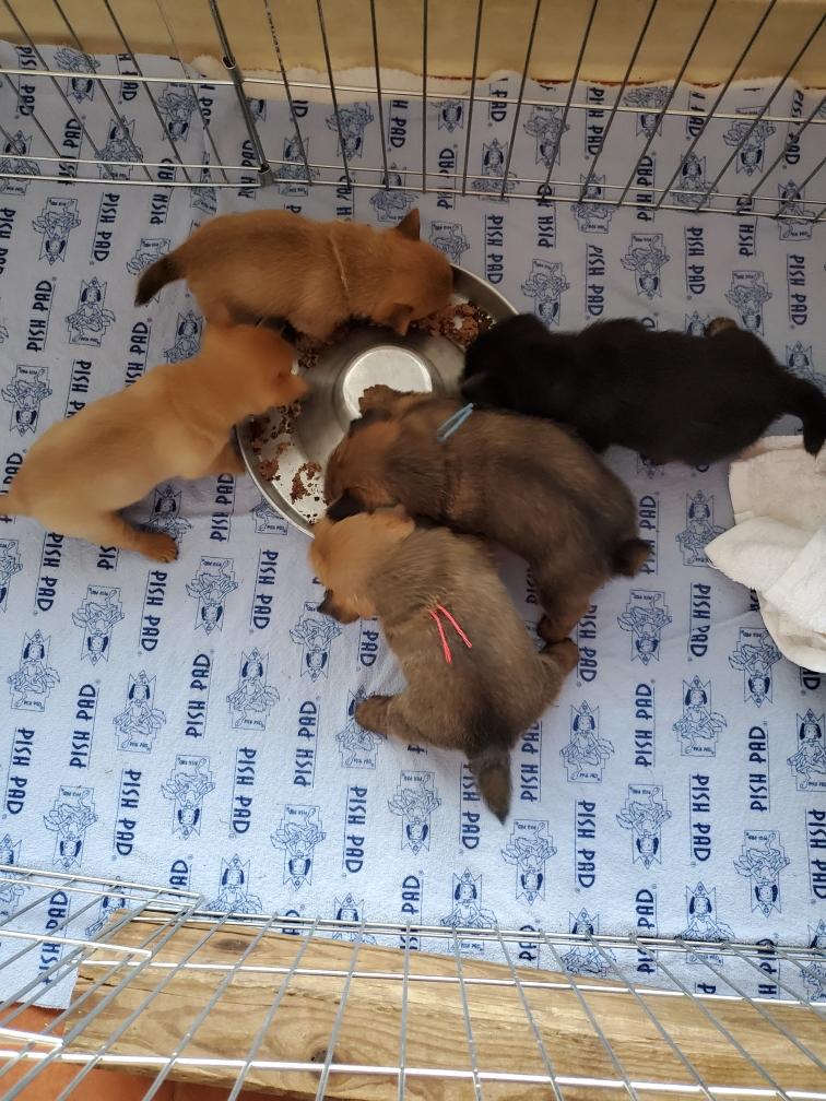 Siri guarding her puppies. I am no longer bringing water to Gwynie and Siri. Both now drink from to the communal water bowl that all my dogs use. I am still bringing Gwynie and Siri food to eat in their respective whelping boxes. I suspect that they would eat in their crates in my living room if that is where I put their food bowls.