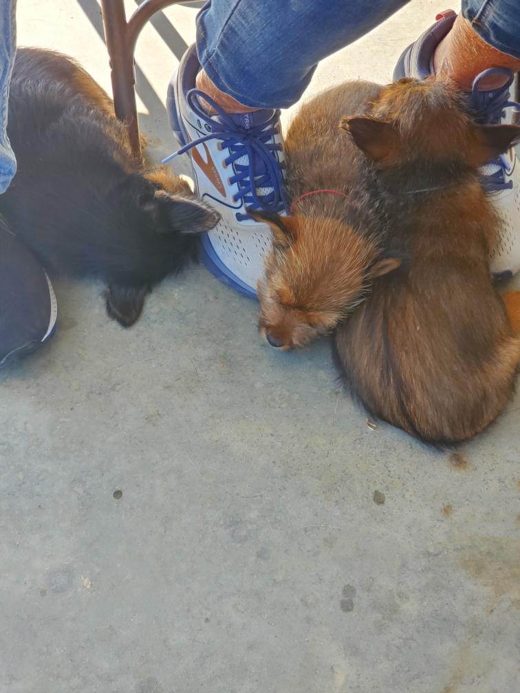Morning picture 2 - (from top to bottom) Black, Siri, and Blue. Red was tucked up underneath Siri. A little later I got a photo that included Red. Note that Black (next to Blue) just looks like a blur since he was moving.